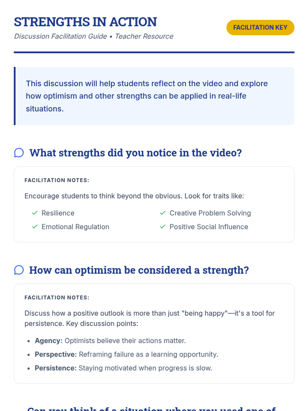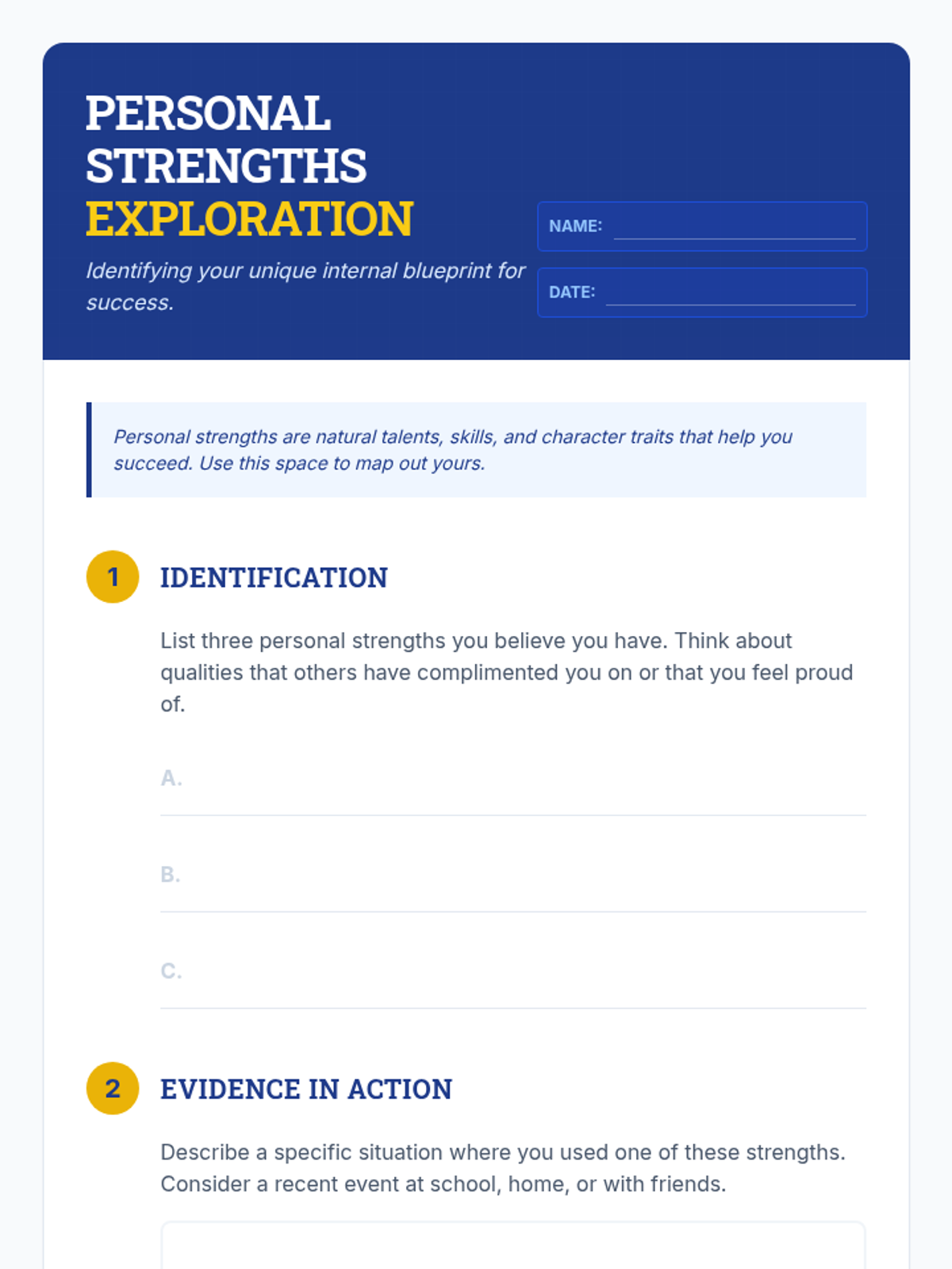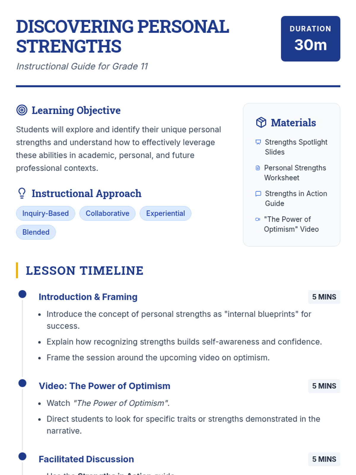 An interactive lesson for 11th-grade students to identify their unique personal strengths and learn how to apply them to their academic and personal goals.