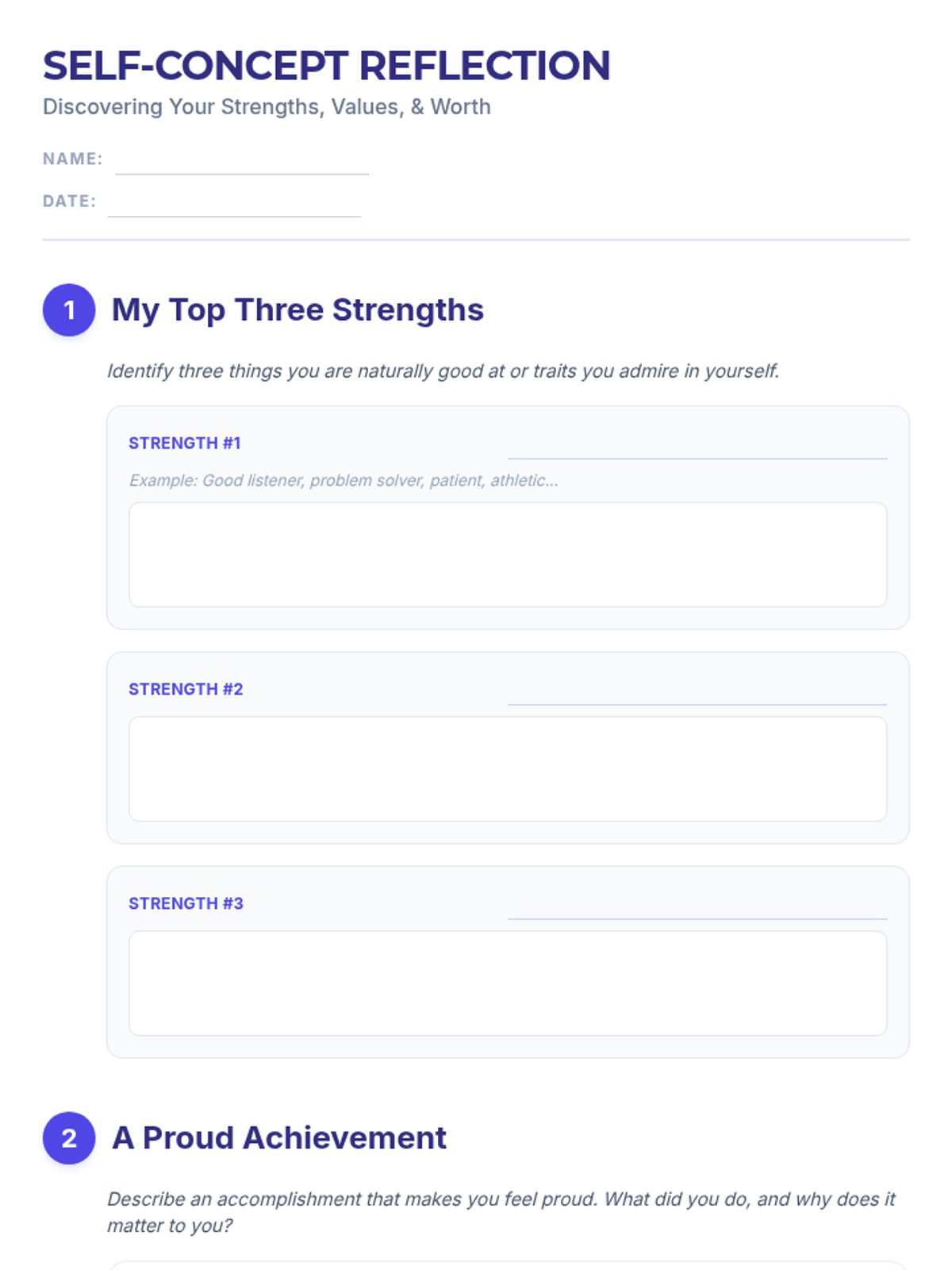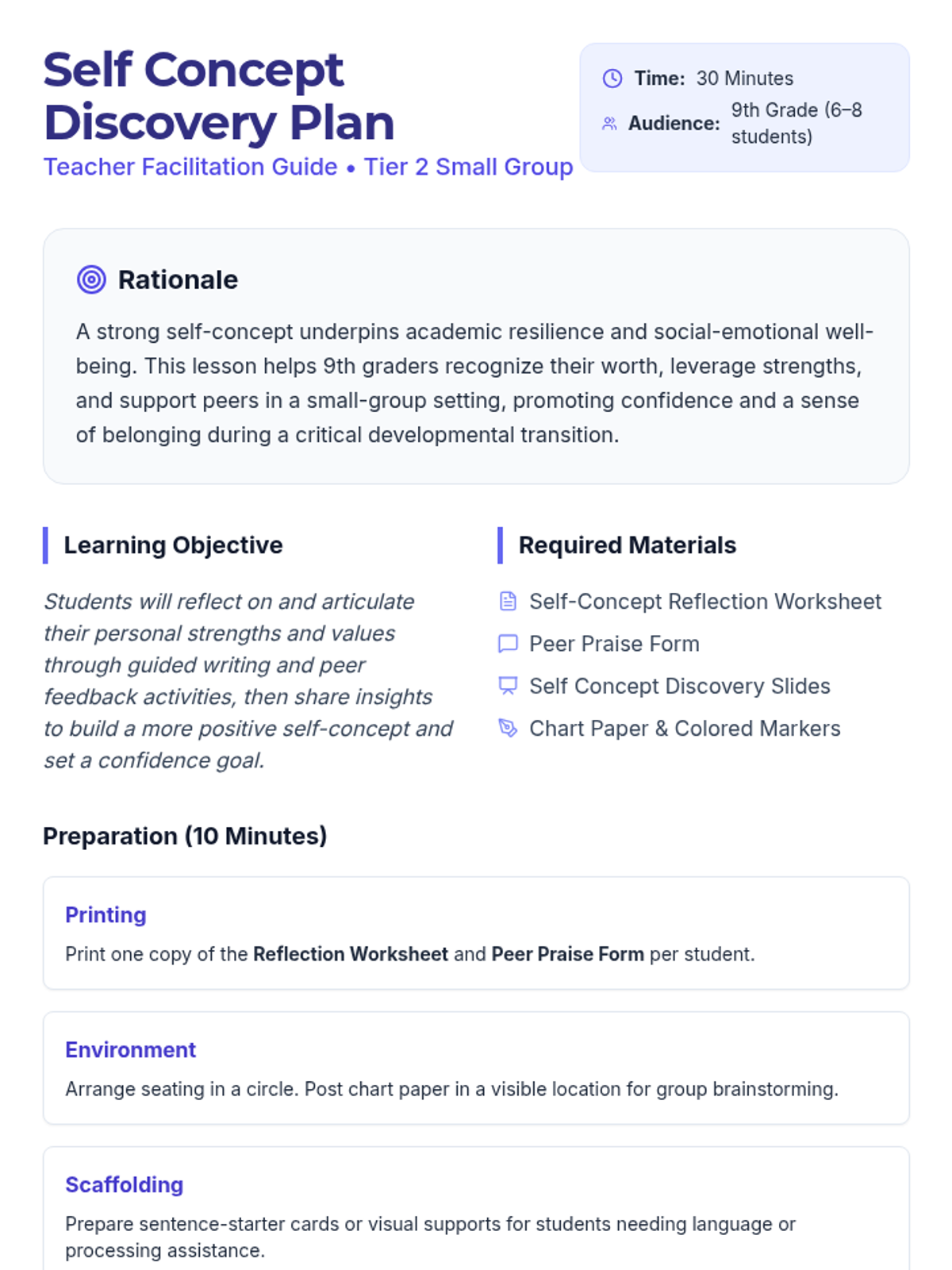 A 30-minute Tier 2 small group lesson for 9th graders focused on exploring self-perception, identifying personal strengths, and building a positive self-concept through reflection and peer feedback.
