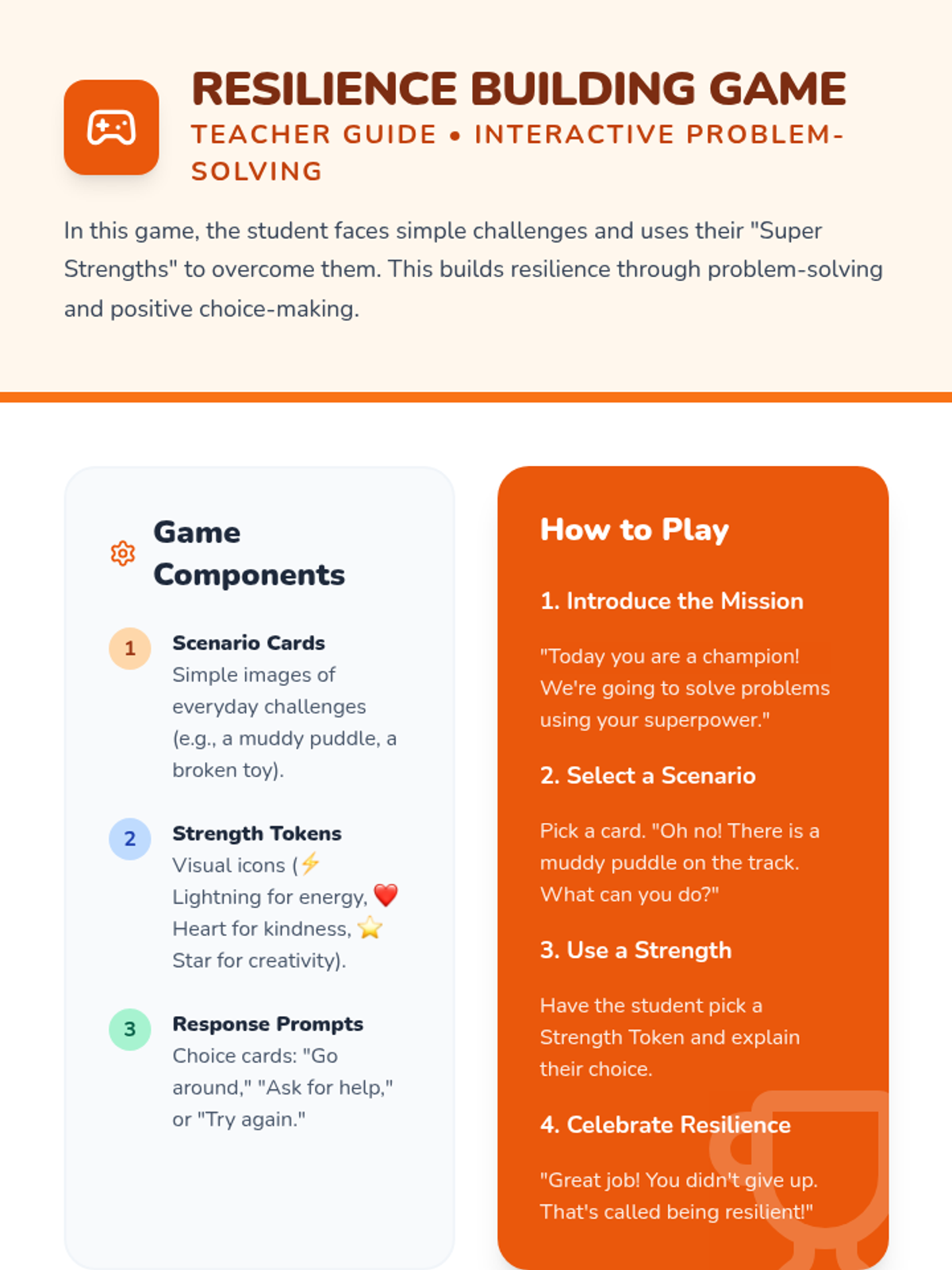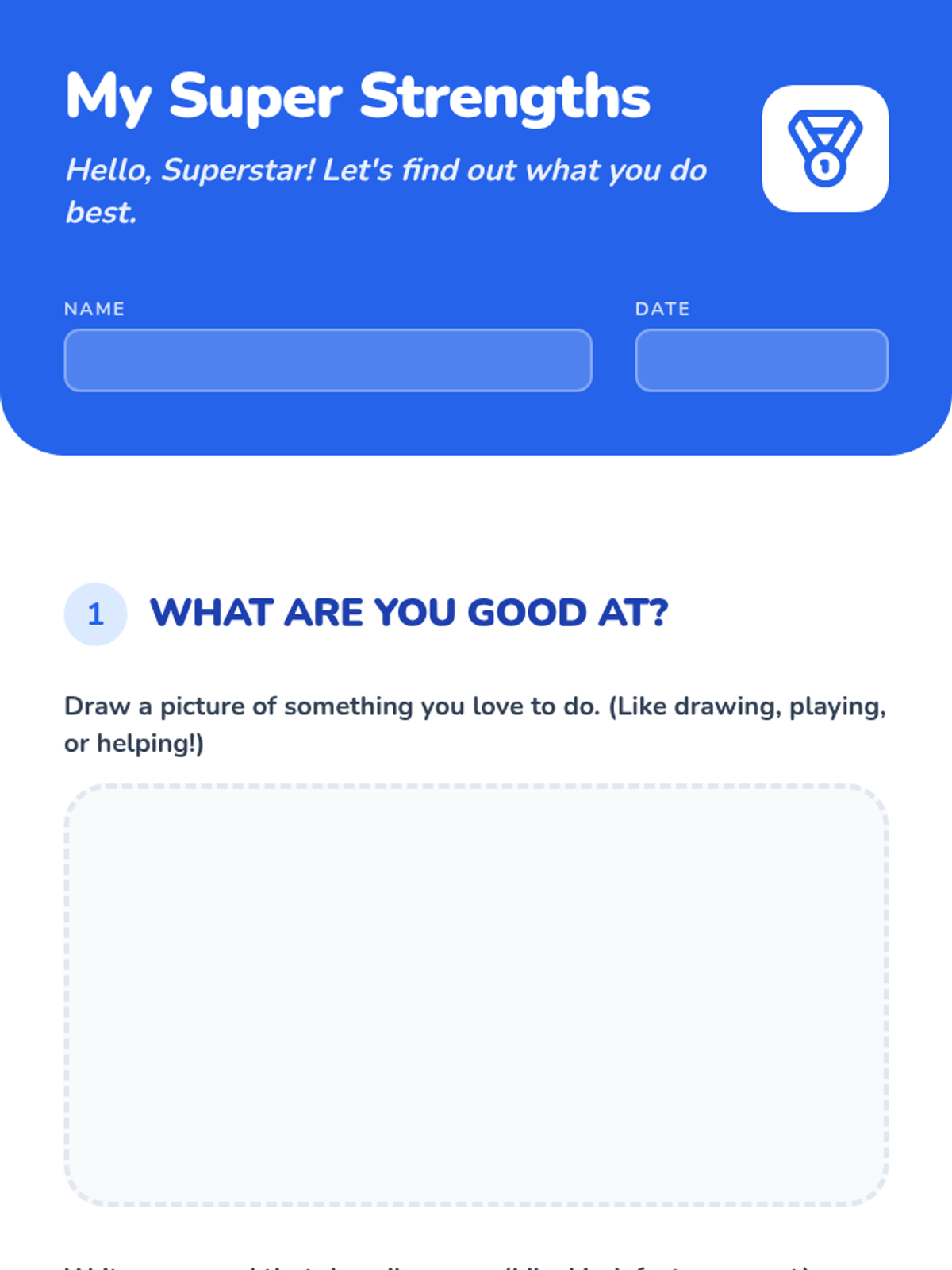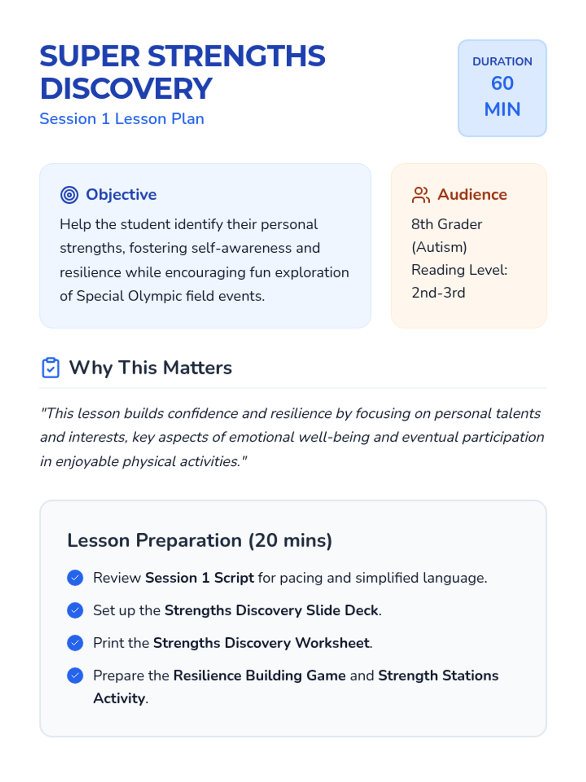 The first session focuses on self-awareness and emotional readiness. The student identifies personal strengths and learns the concept of resilience through a 'superpower' lens, preparing them mentally for athletic challenges.