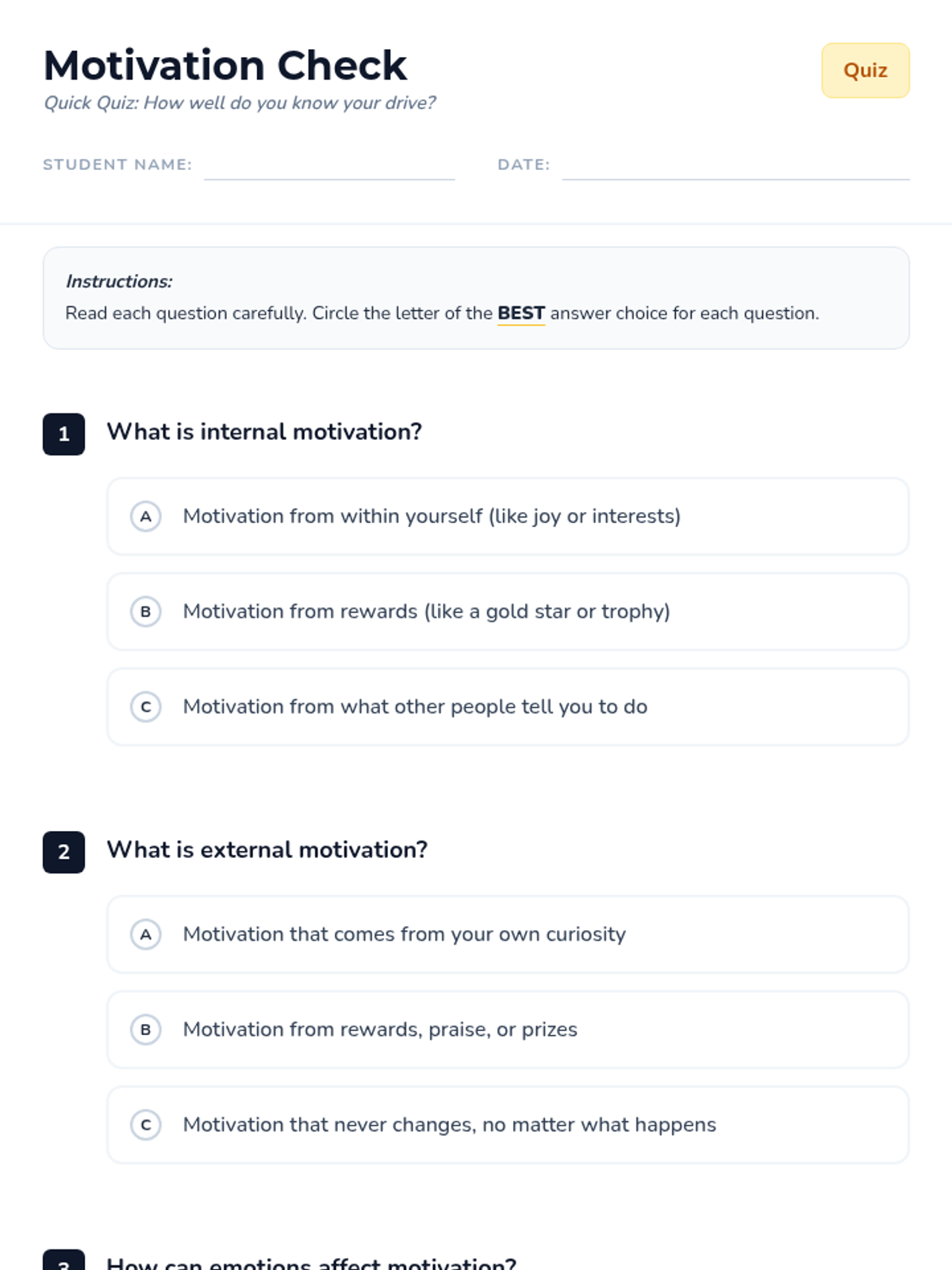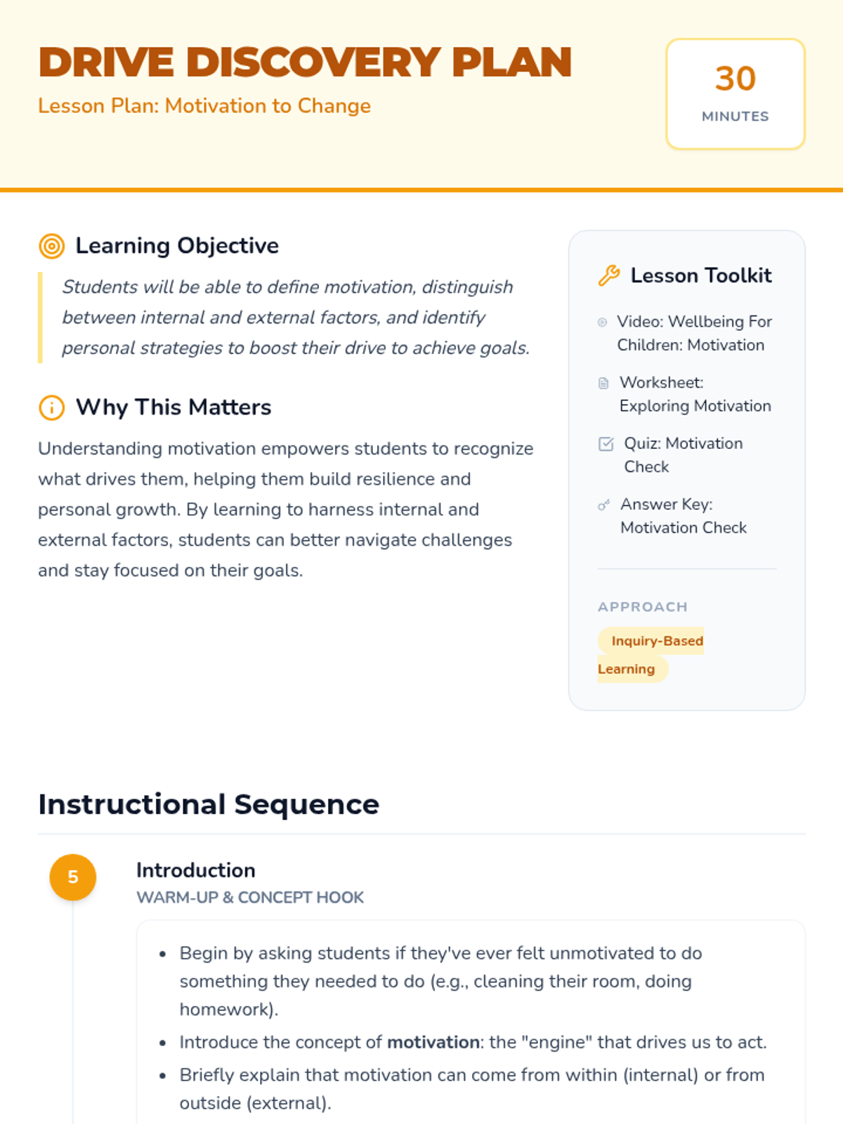 This lesson introduces 4th-grade students to internal and external motivation, exploring how emotions influence drive and providing practical strategies for staying motivated. Students will identify their personal motivators and learn how to pair challenging tasks with enjoyable activities.