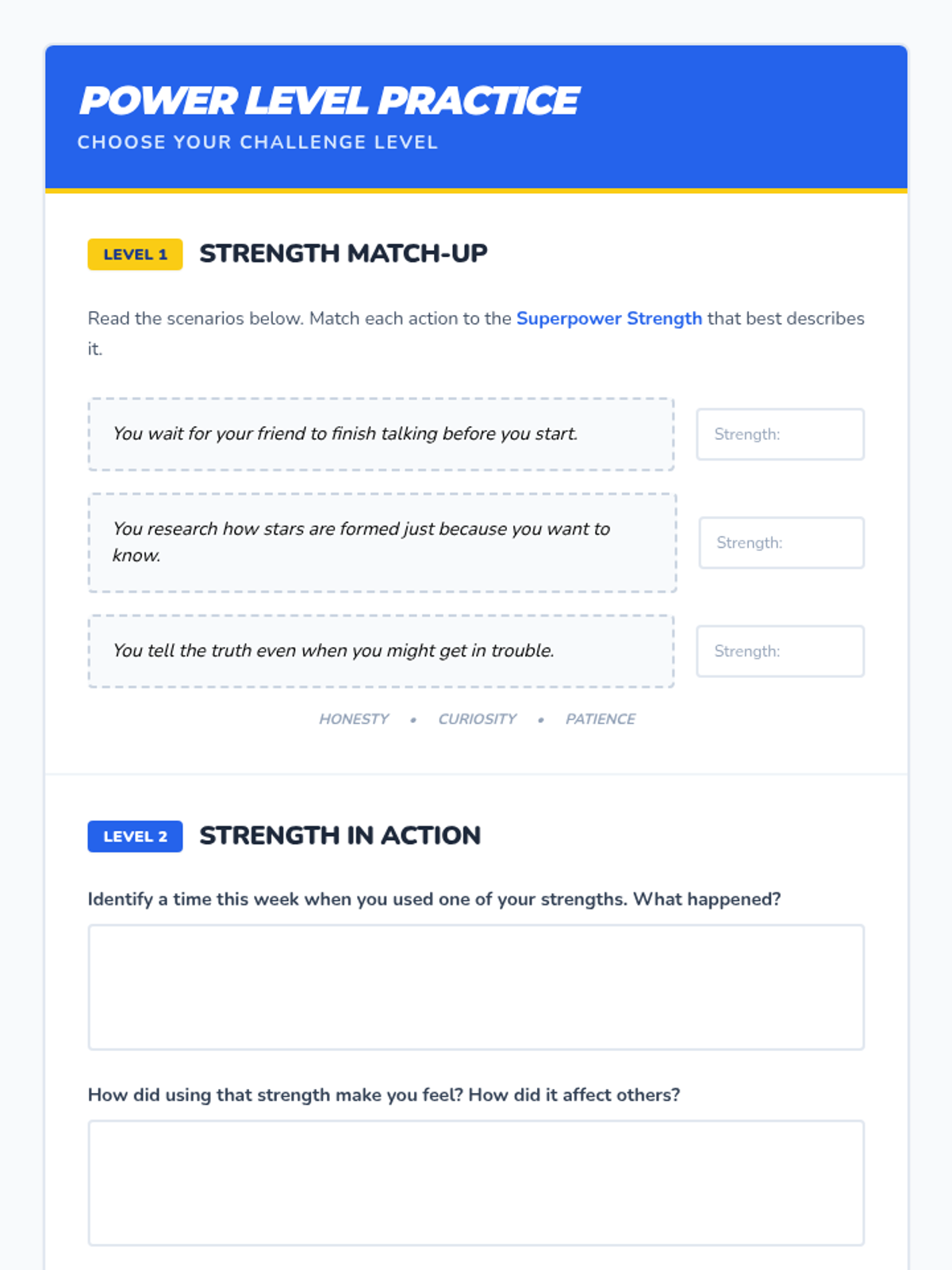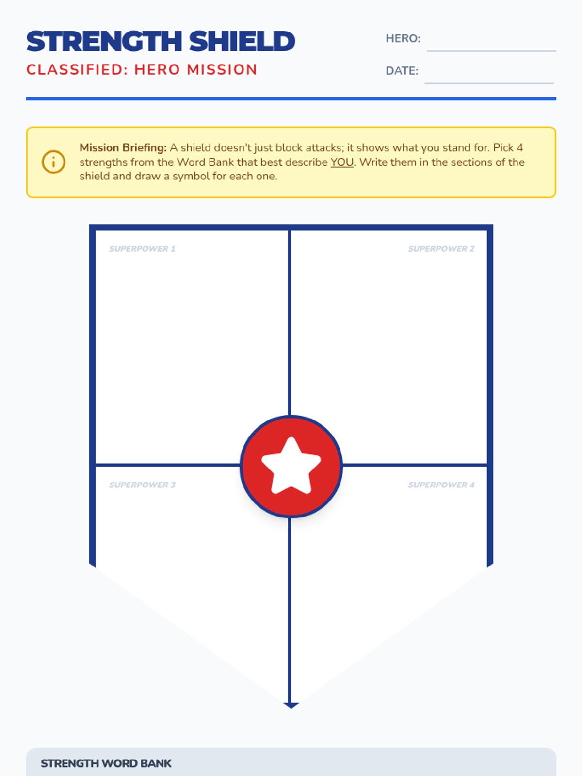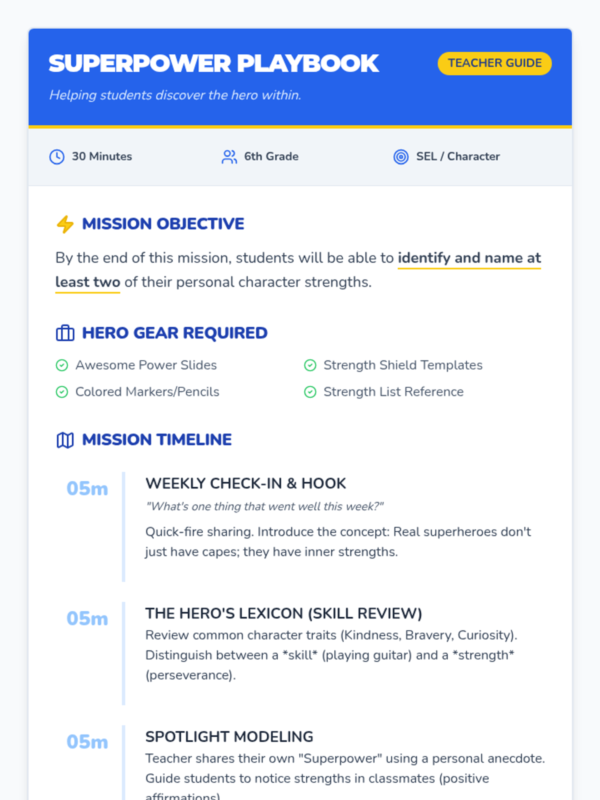 A high-energy SEL lesson where 6th-grade students explore their unique character strengths through a comic book lens, culminating in the creation of a personal 'Strength Shield'.
