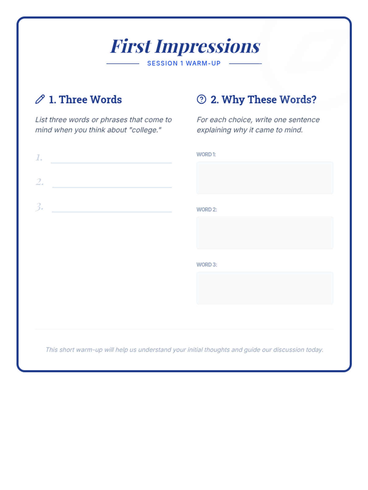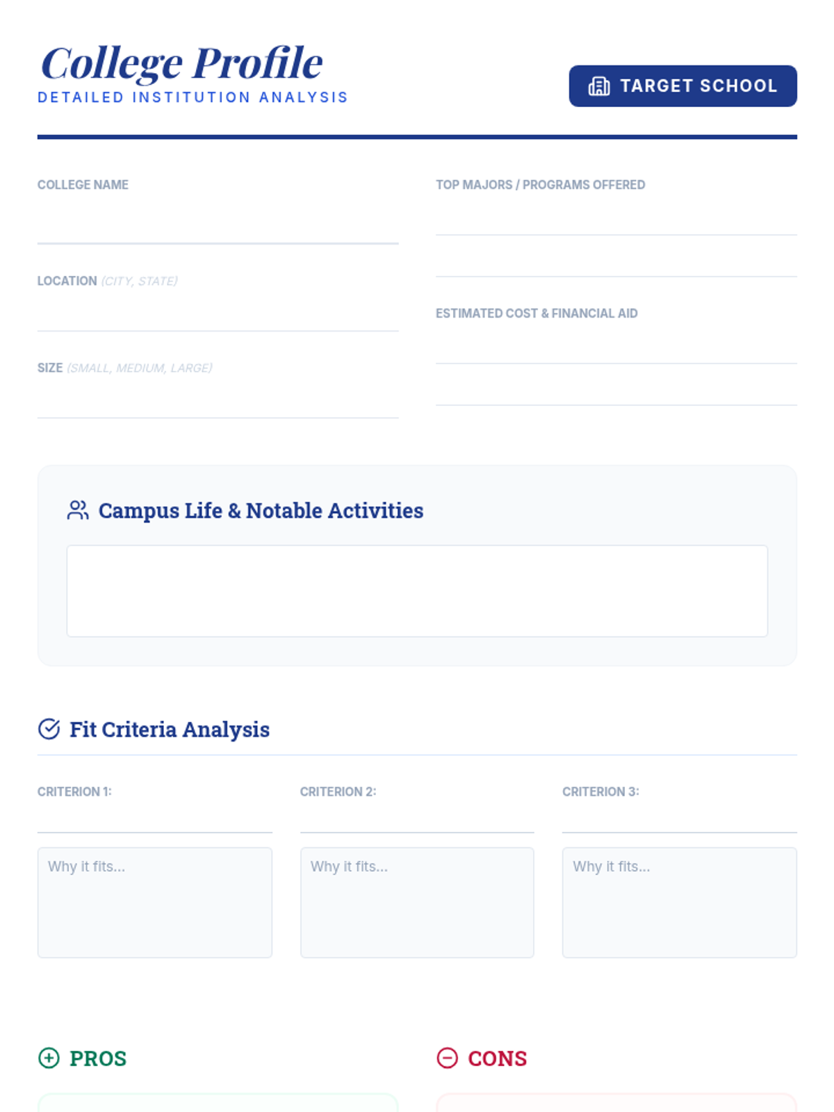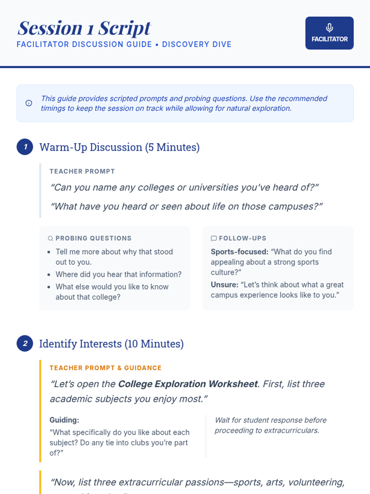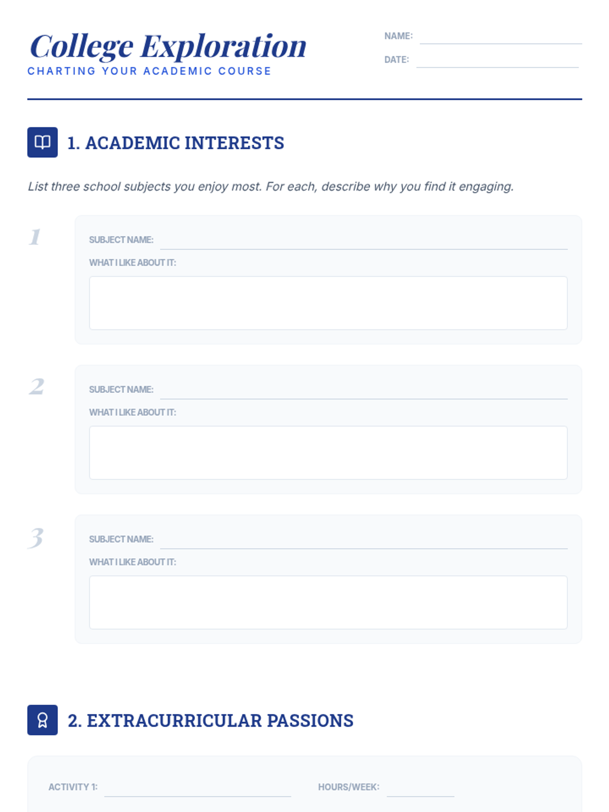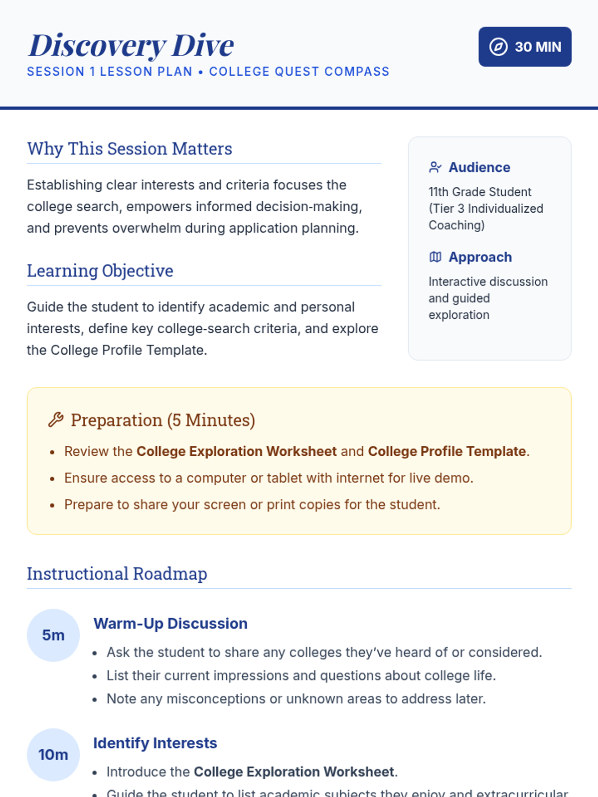 Focuses on identifying academic interests, extracurricular passions, and key research criteria to establish a foundation for the college search.