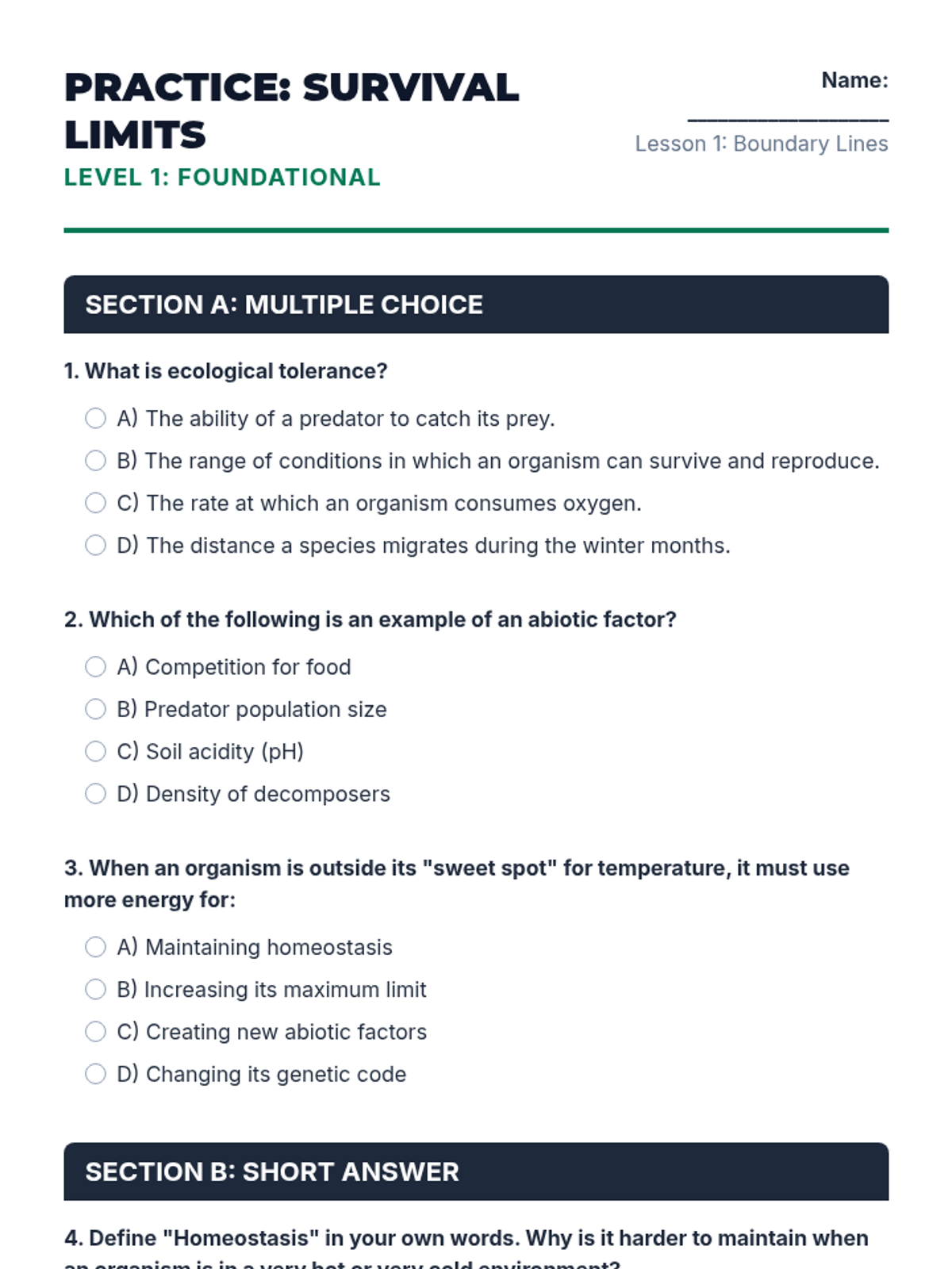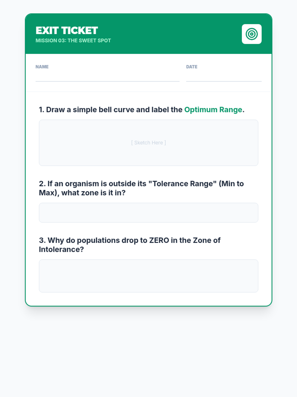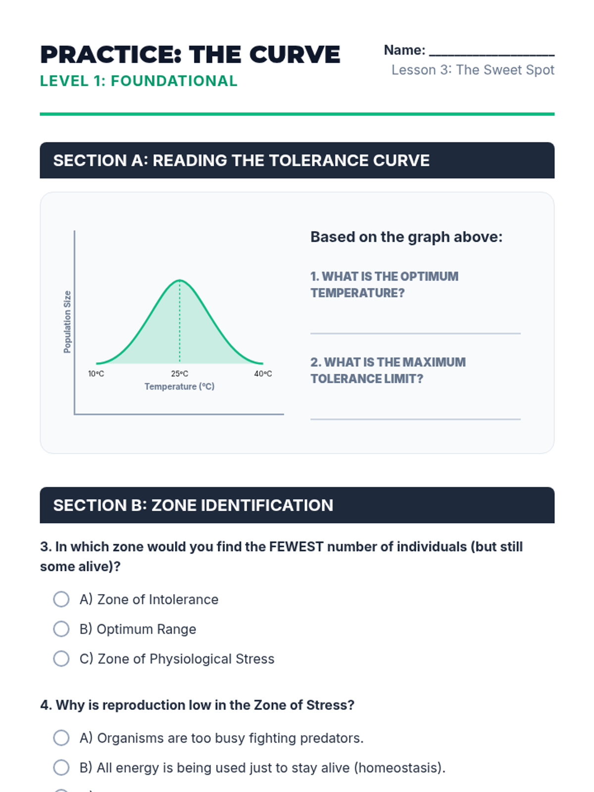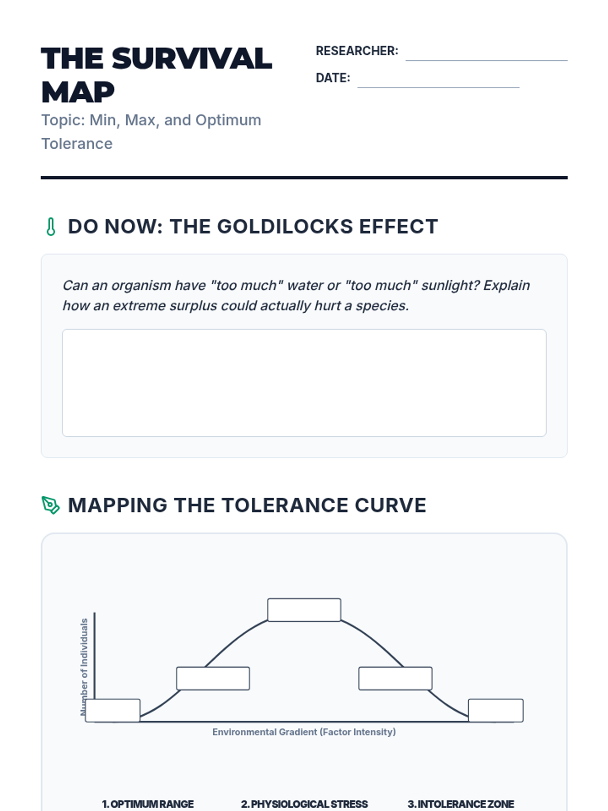 Master the ecological tolerance curve by defining and identifying the optimum range, zone of physiological stress, and zone of intolerance.