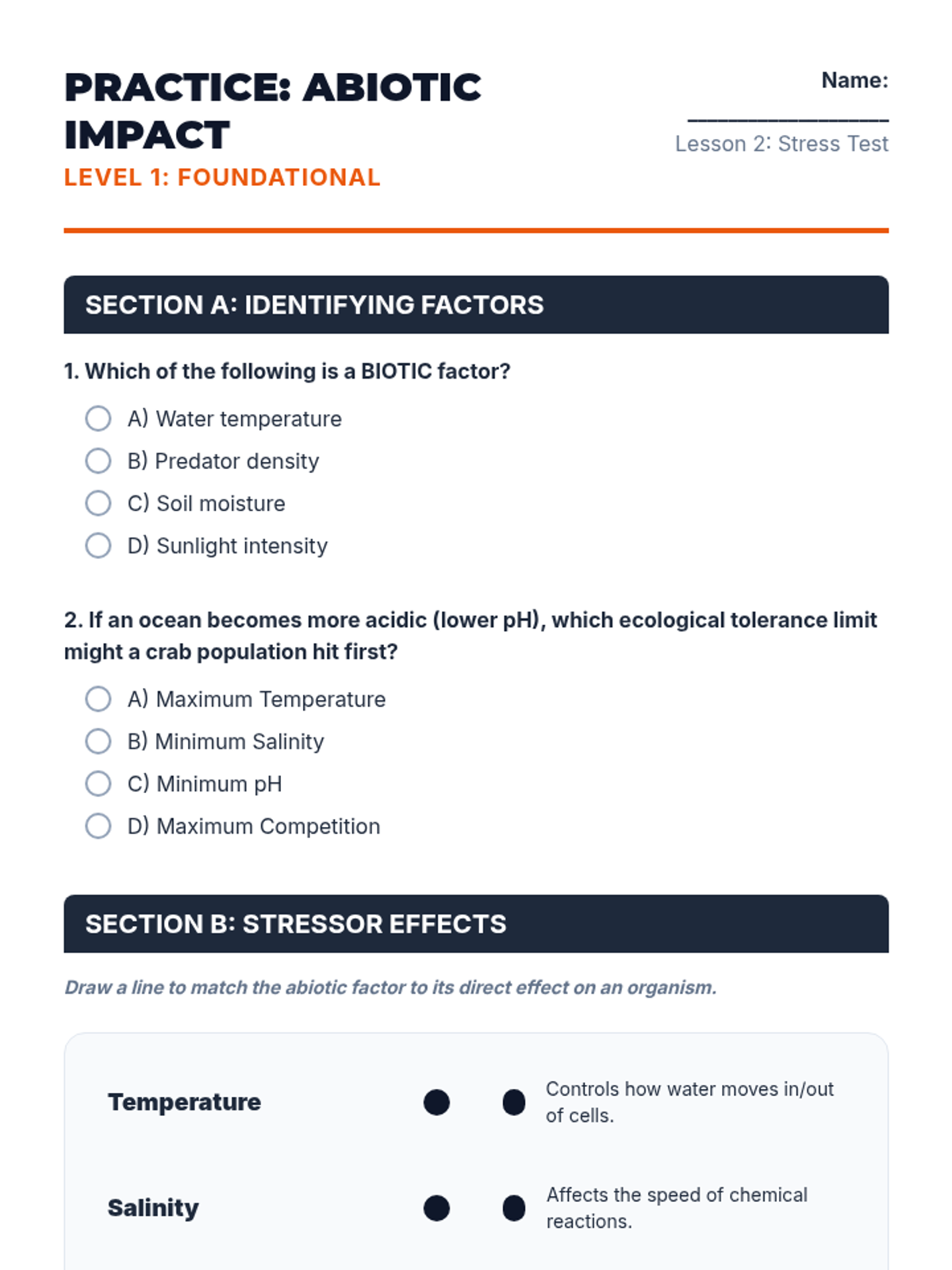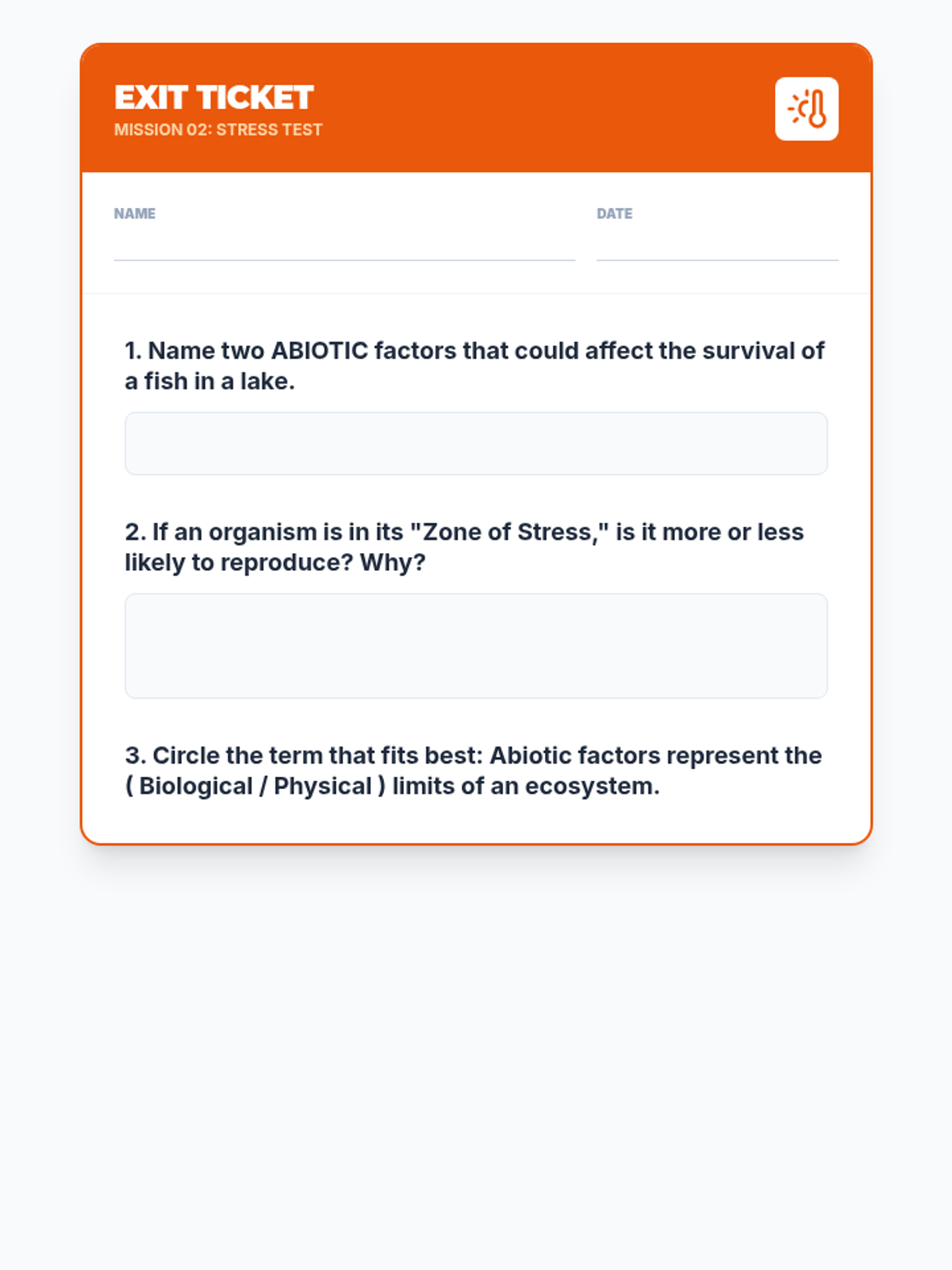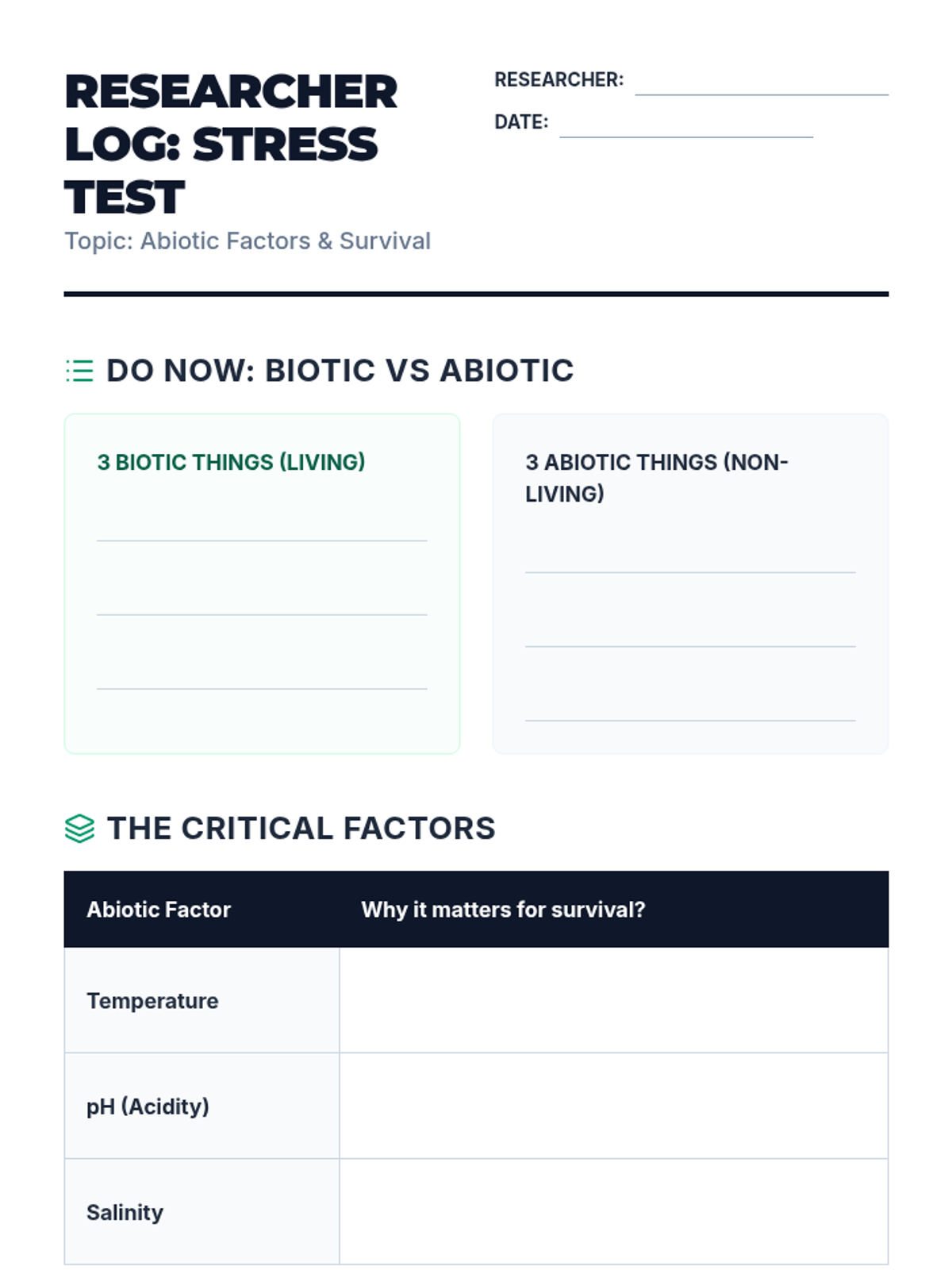 Identify and analyze specific abiotic factors like temperature, pH, and salinity that dictate whether a species thrives or perishes.
