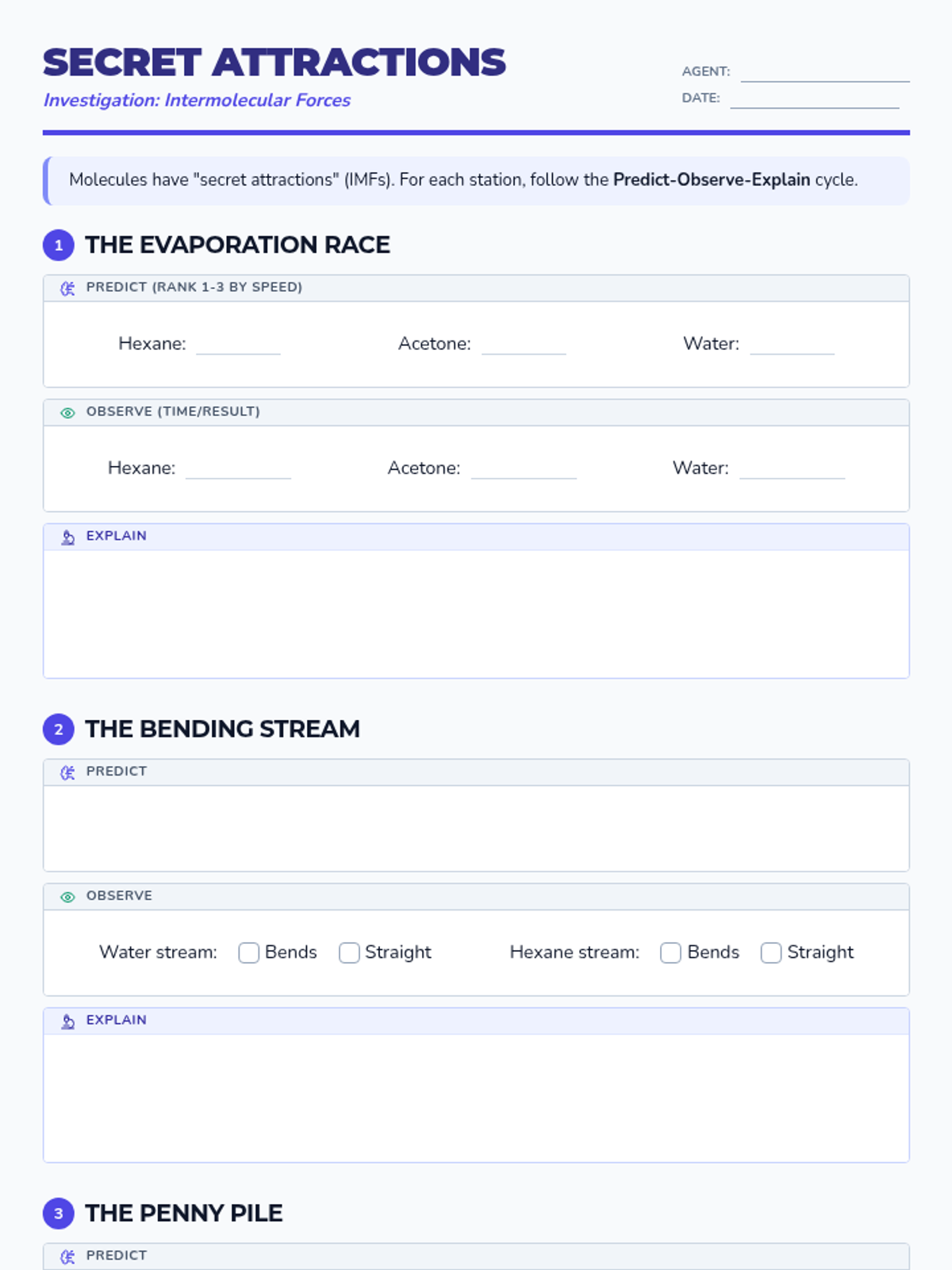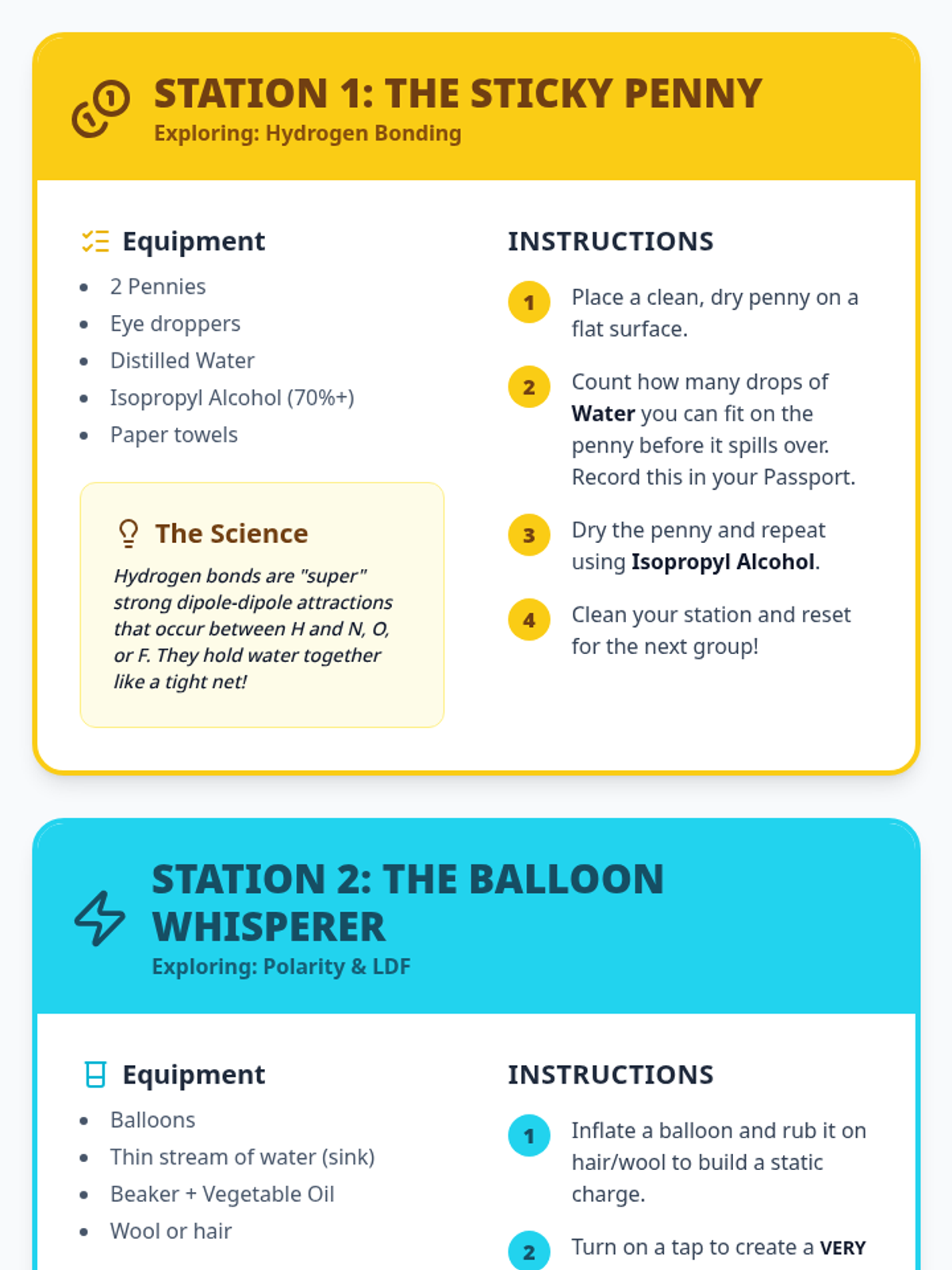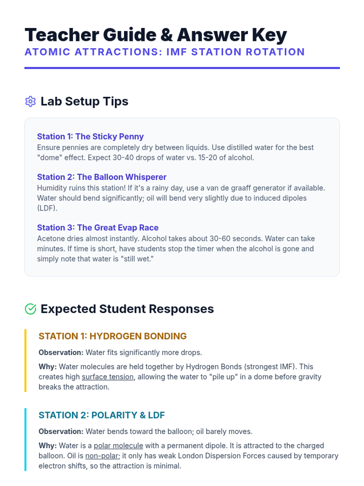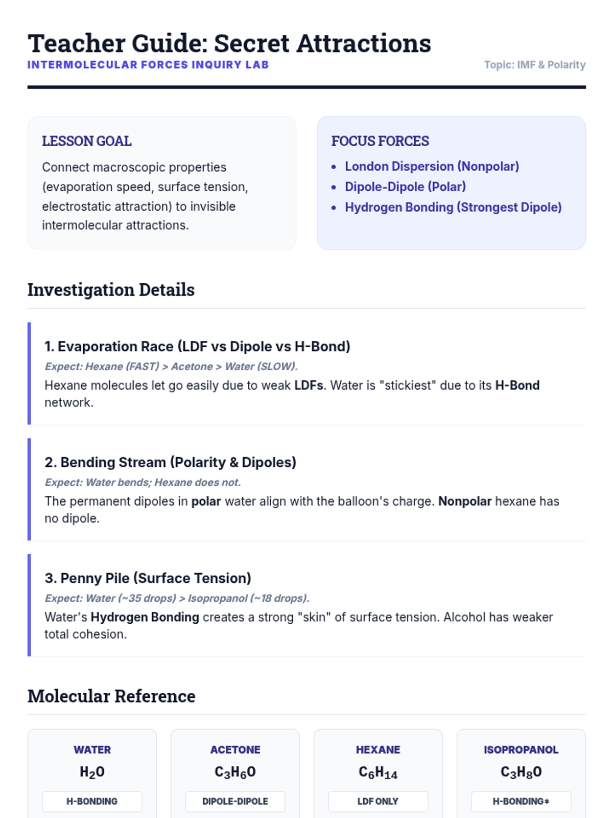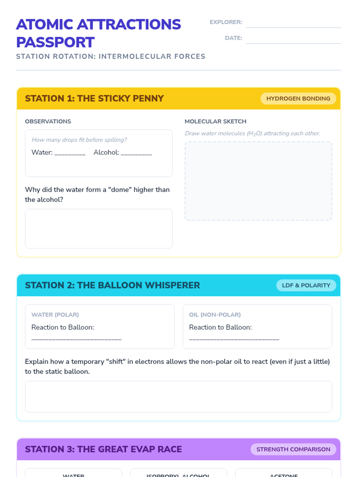 An introductory station rotation activity exploring intermolecular forces (IMF) through hands-on experiments. Students investigate London Dispersion, Dipole-Dipole, and Hydrogen Bonding through collaborative challenges.