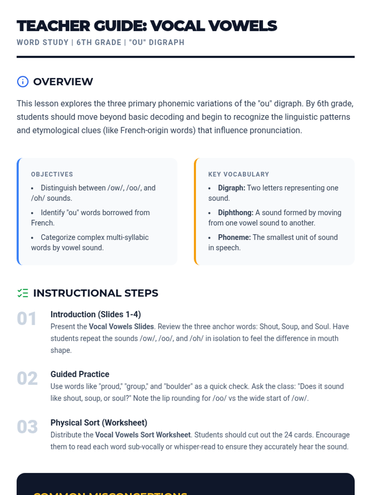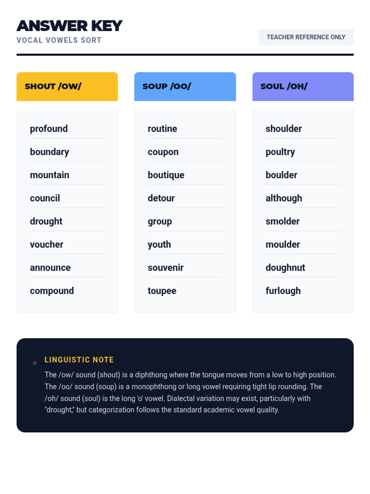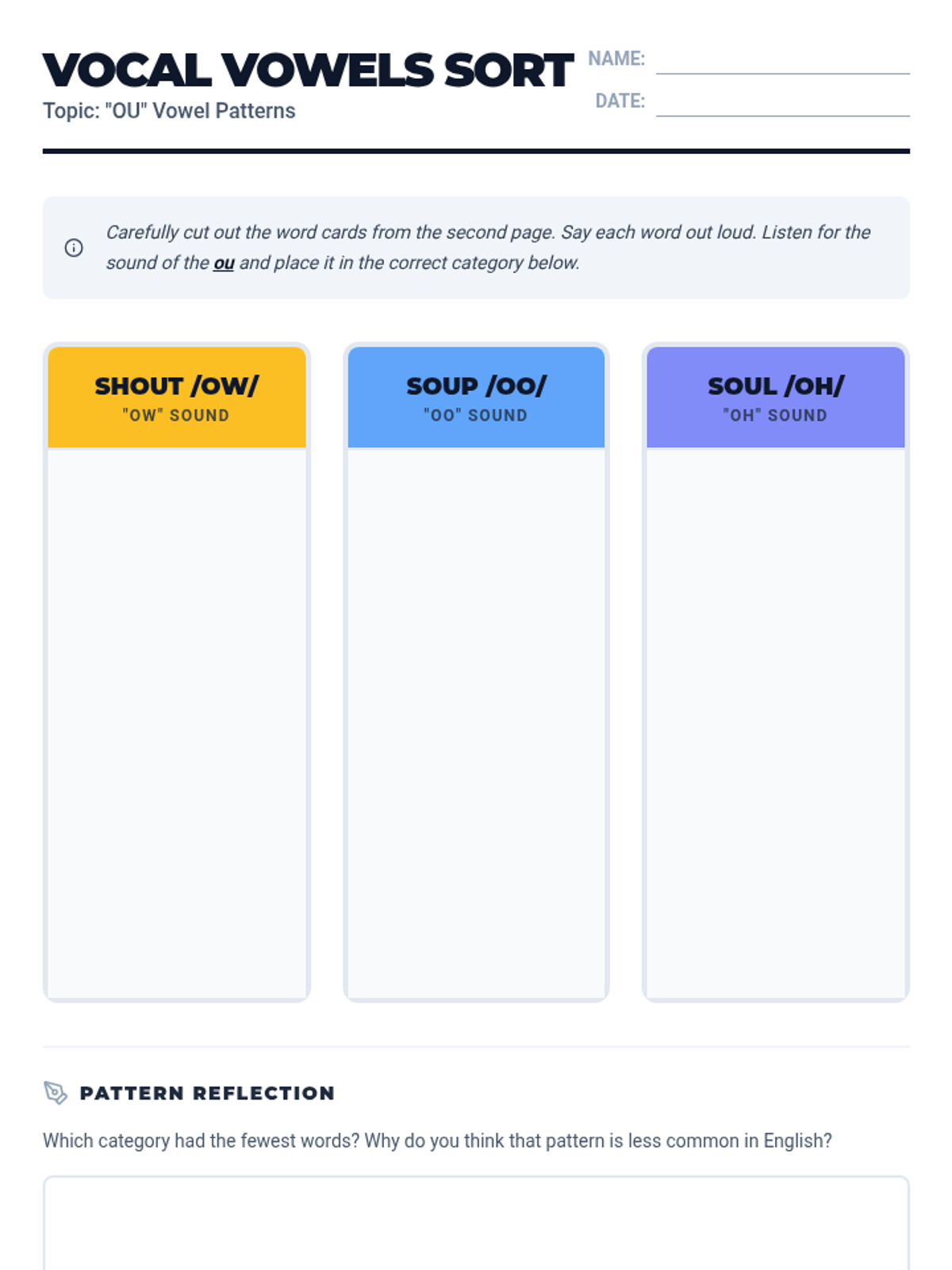 A word study lesson for 6th graders focusing on the three distinct sounds of the 'ou' vowel digraph: /aʊ/ as in shout, /uː/ as in soup, and /oʊ/ as in soul. Students will categorize words and identify patterns through a physical sorting activity.