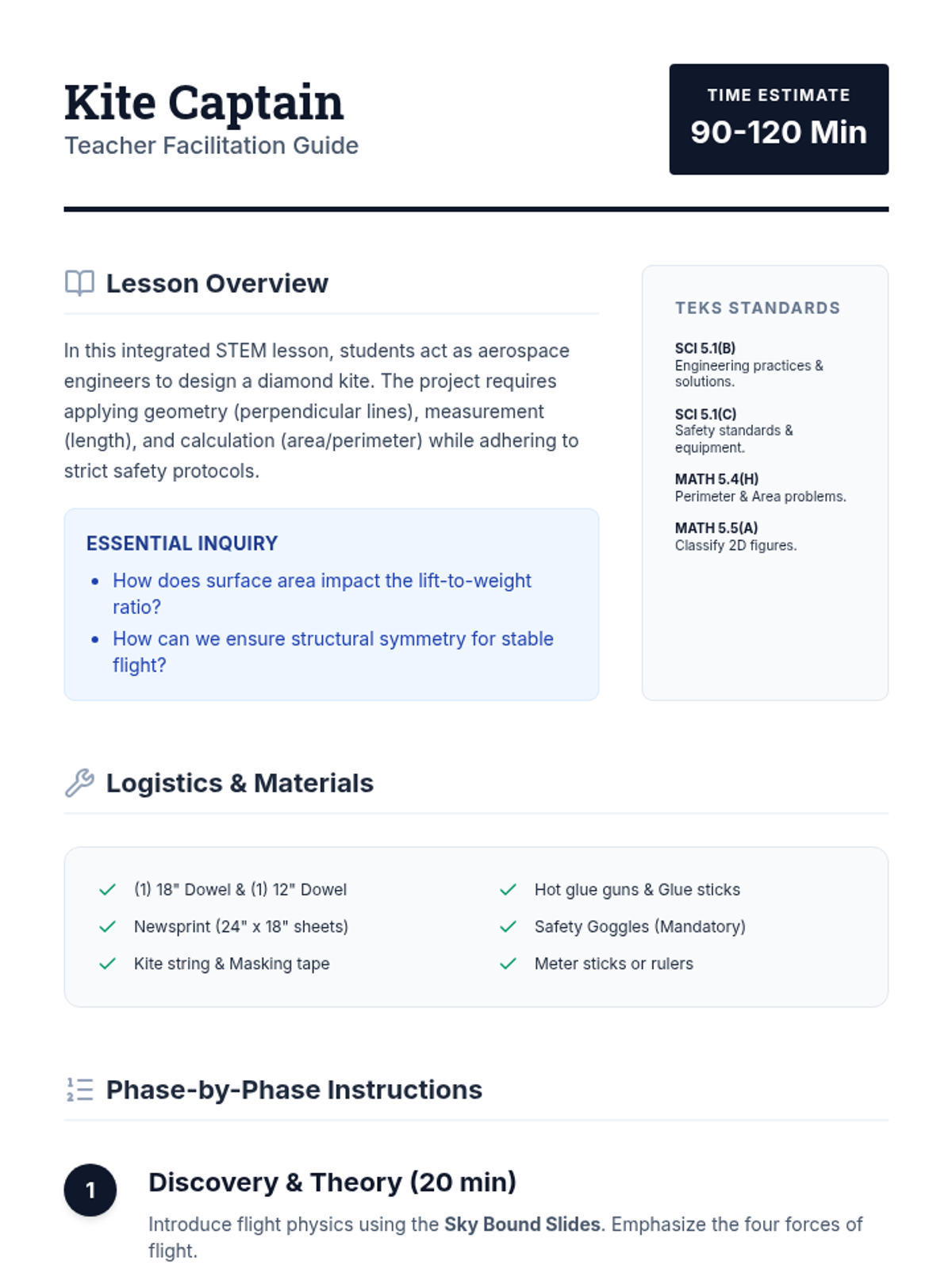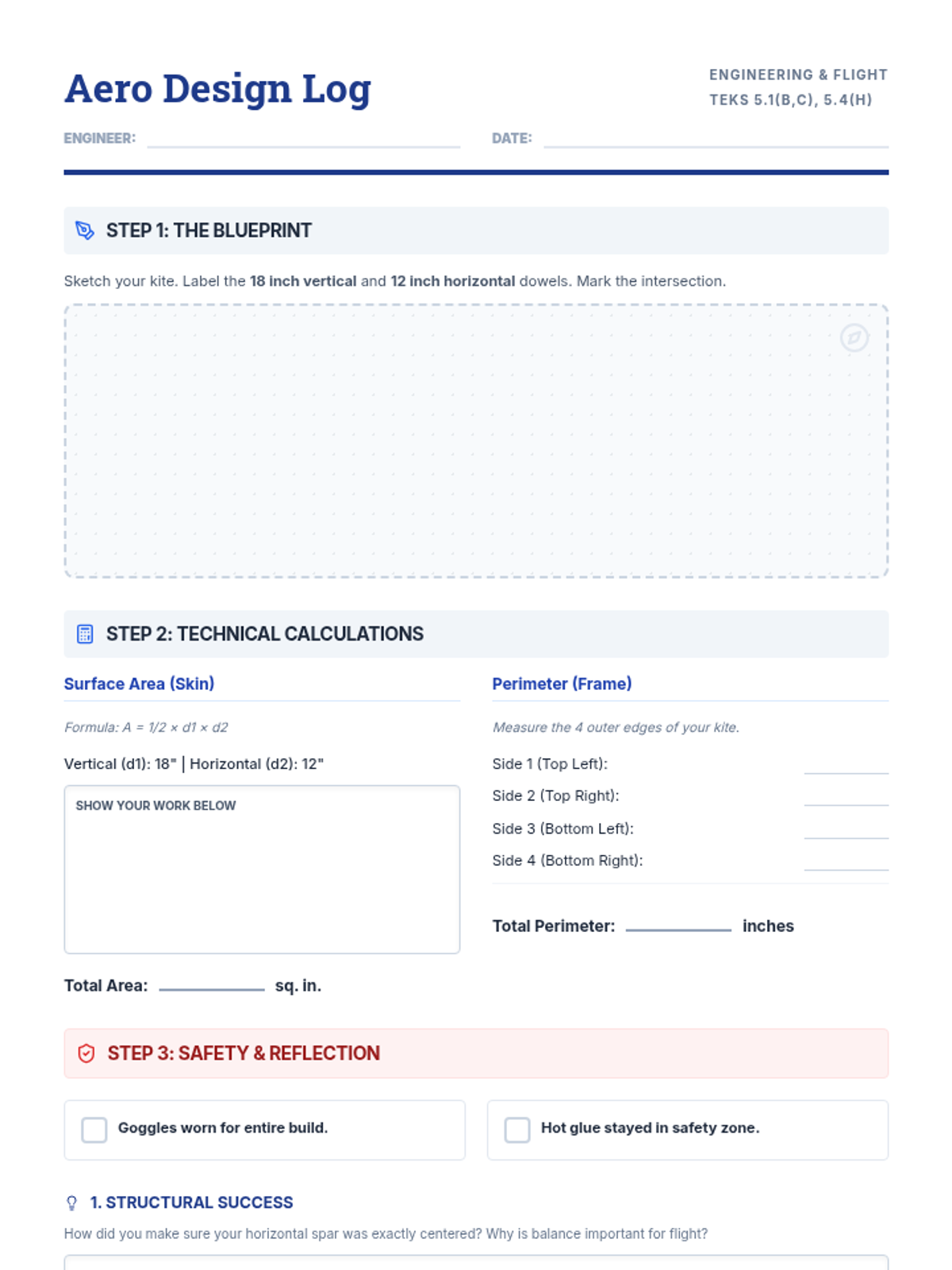 In this hands-on lesson, students act as aerospace engineers to design and build a functional diamond kite using dowels and newsprint. They apply 5th-grade math skills to calculate area and perimeter while following the engineering design process and safety protocols.
