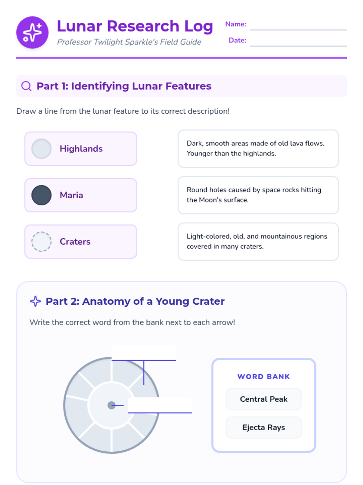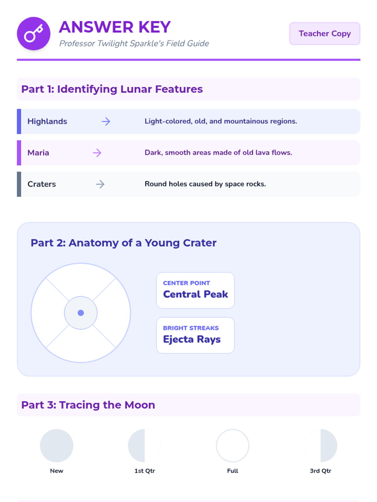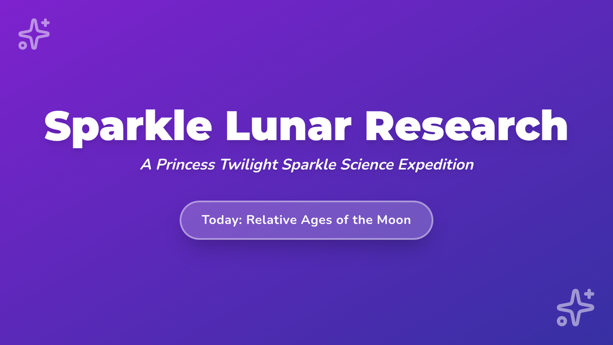 A magical journey through lunar geology and phases guided by Princess Twilight Sparkle, focusing on relative dating of lunar features, lunar highlands, and Apollo landing sites.