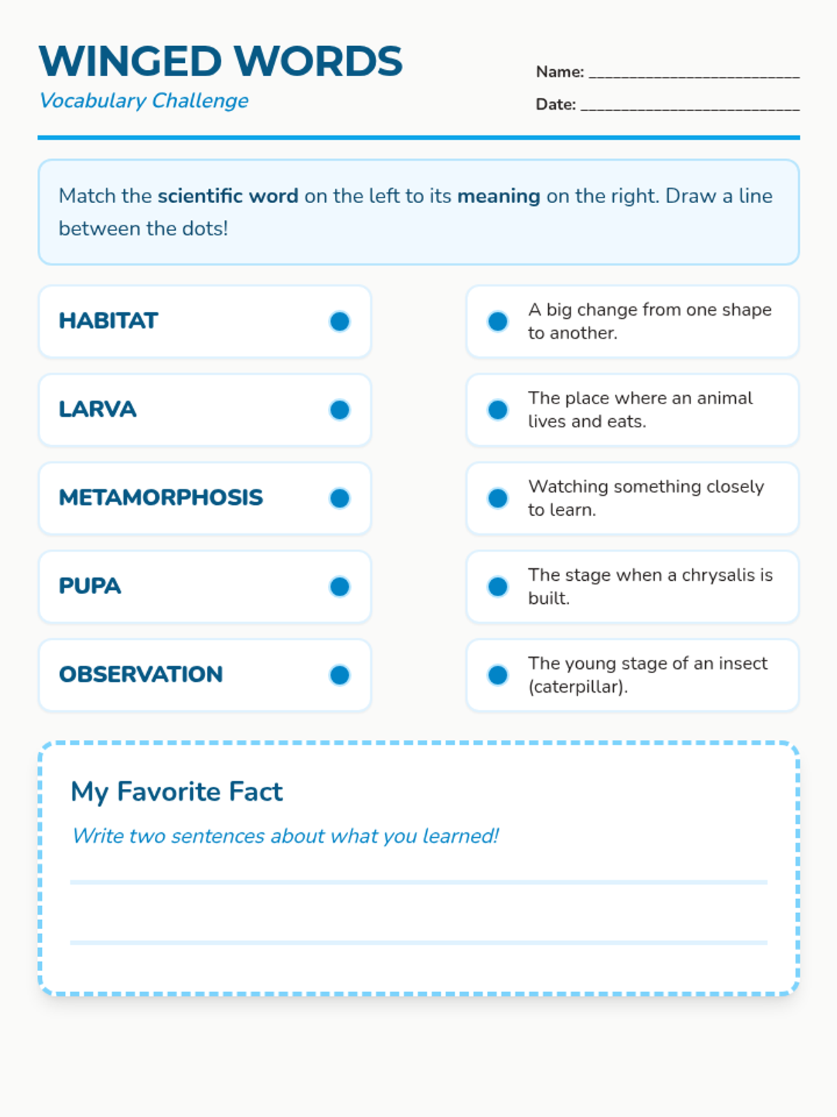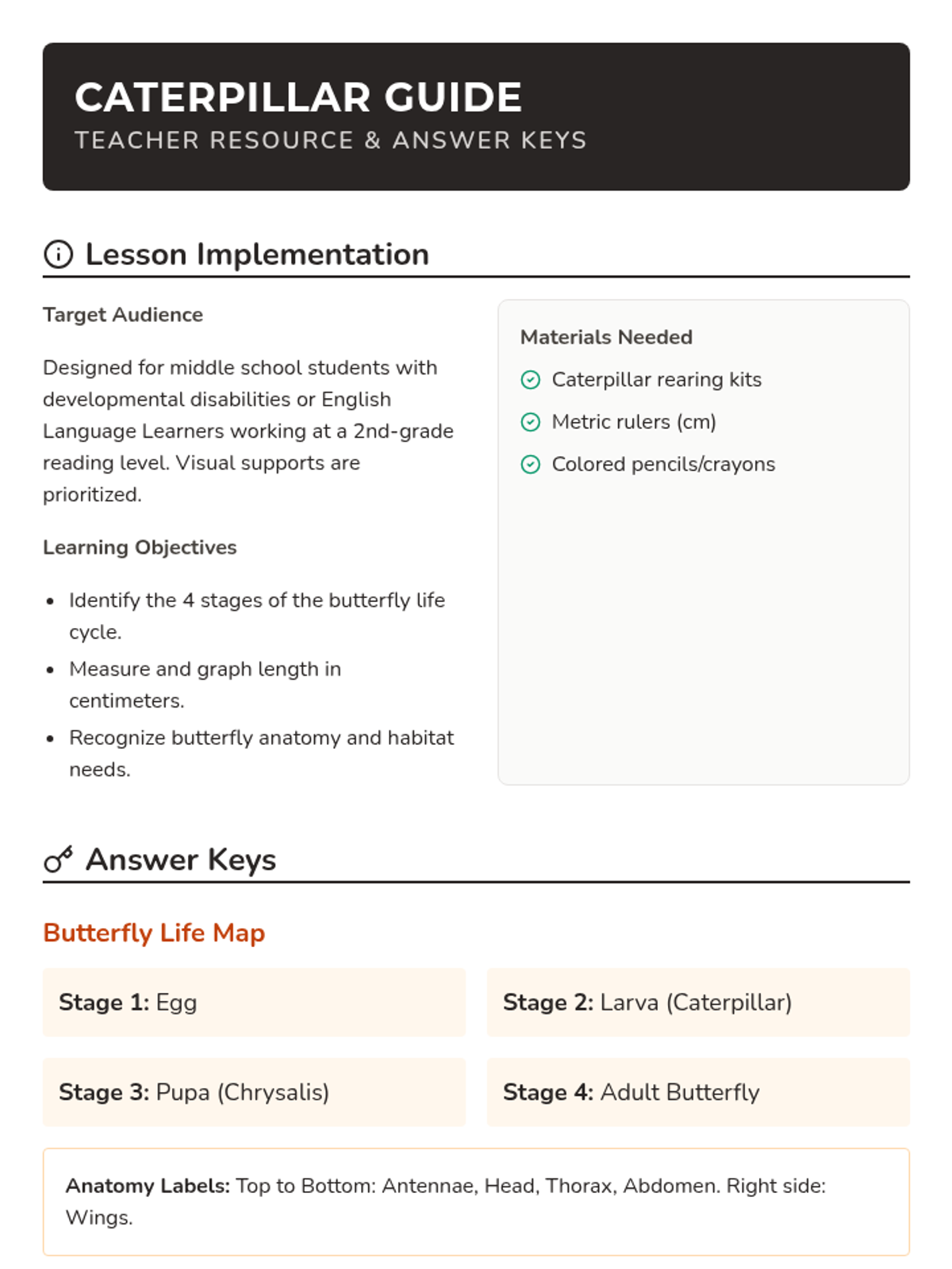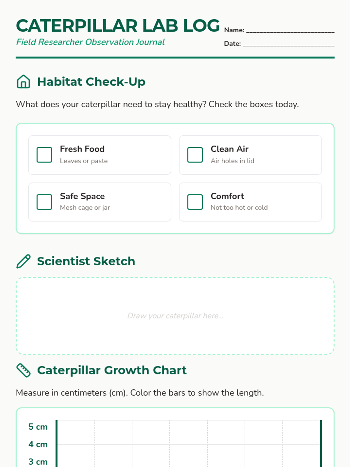 A hands-on experiment where students observe the transformation of caterpillars into butterflies, focusing on habitat, life cycles, and scientific measurement.