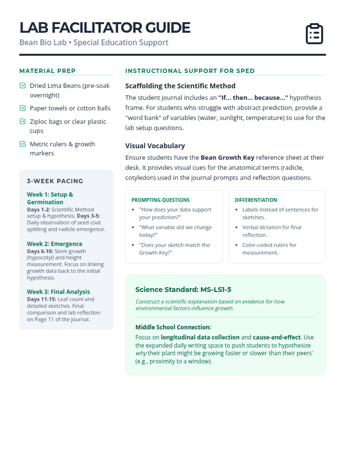 A 3-week hands-on biology investigation where students grow, observe, and document the life cycle of a lima bean, using a structured field journal to practice scientific observation and data recording.
