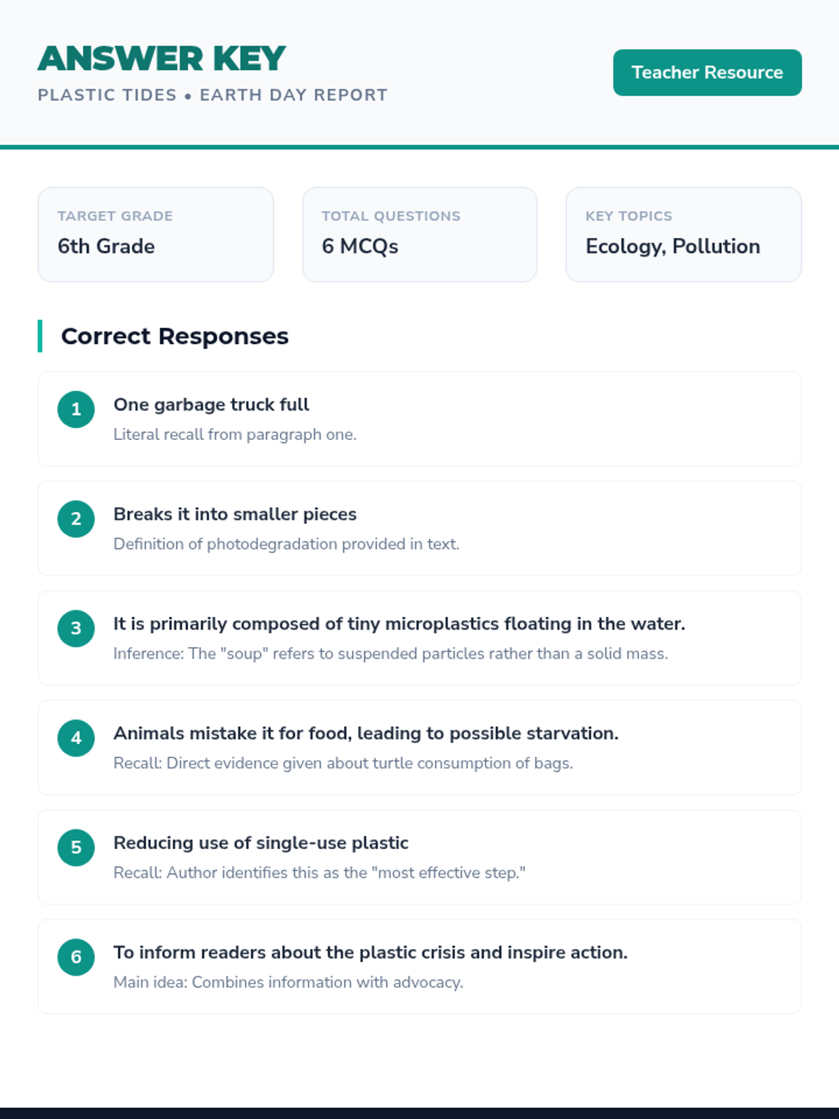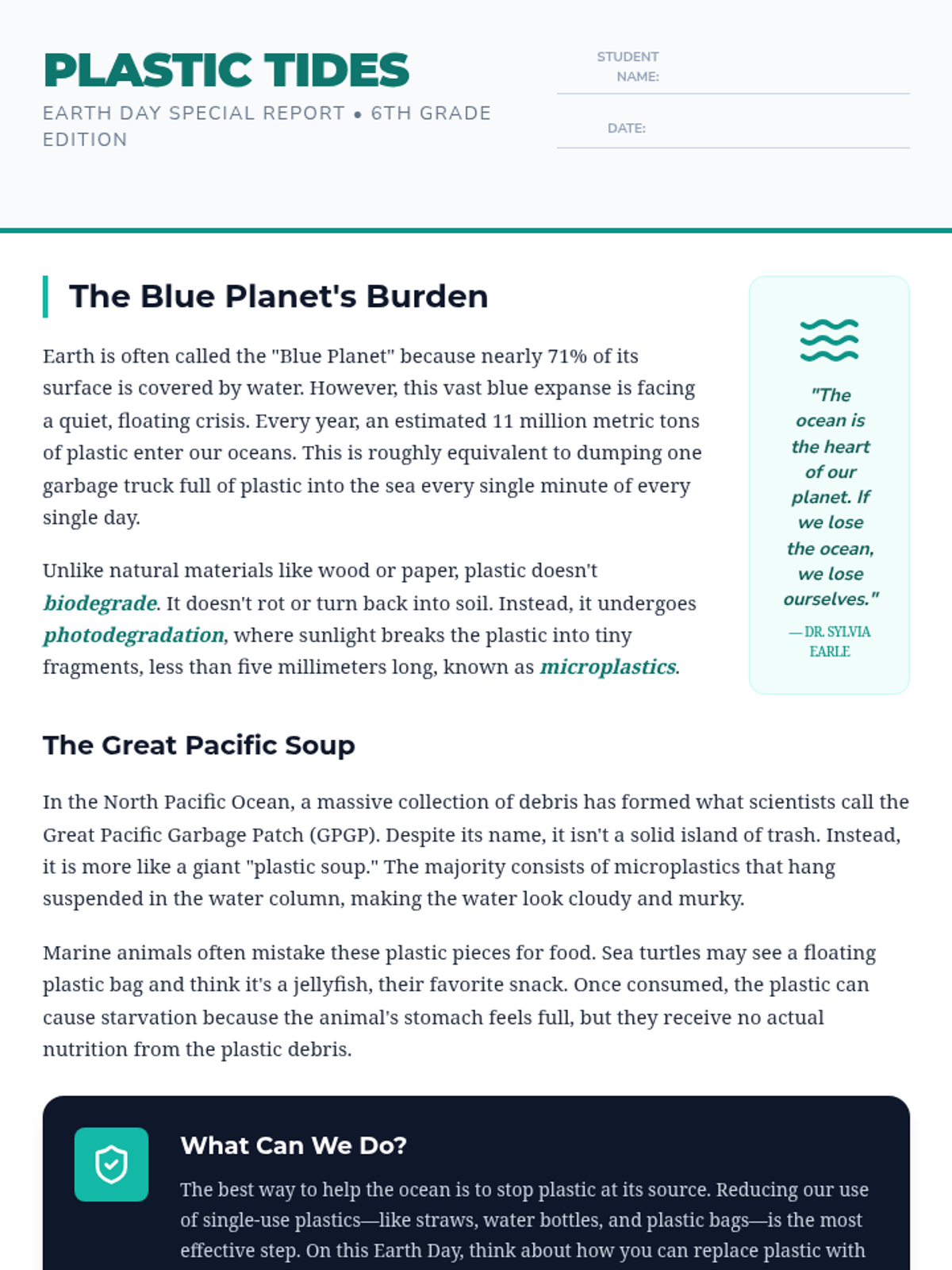 This lesson explores the impact of plastic pollution on marine ecosystems, focusing on the Great Pacific Garbage Patch and microplastics, while encouraging students to take action for Earth Day.