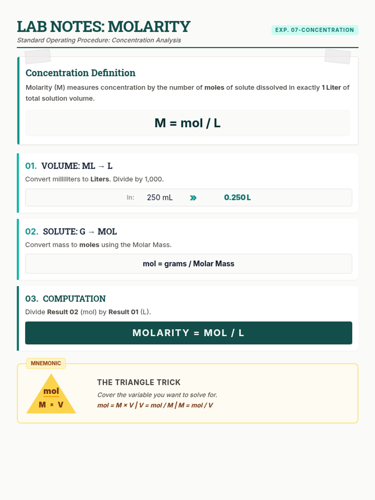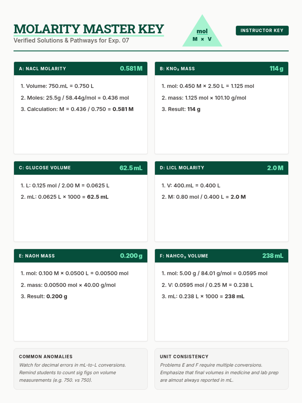 A lesson focused on calculating solution concentration using molarity, including necessary unit conversions for mass and volume.