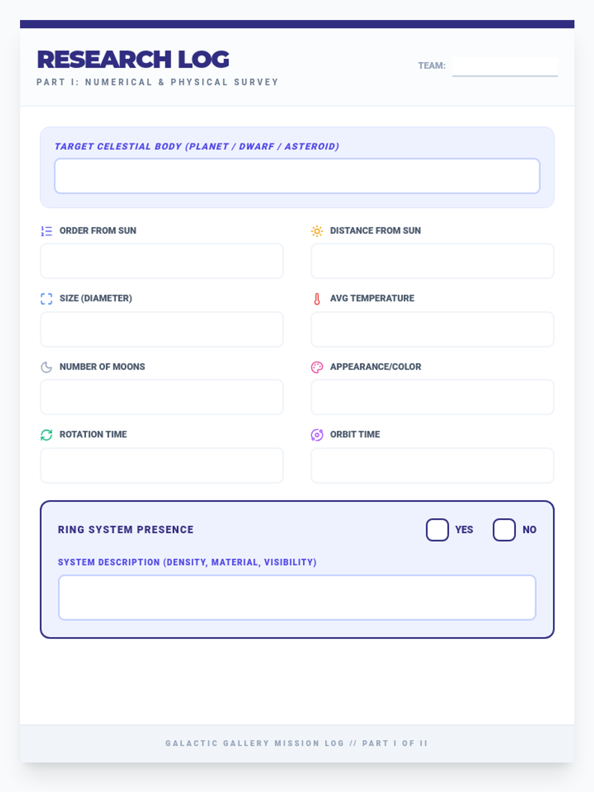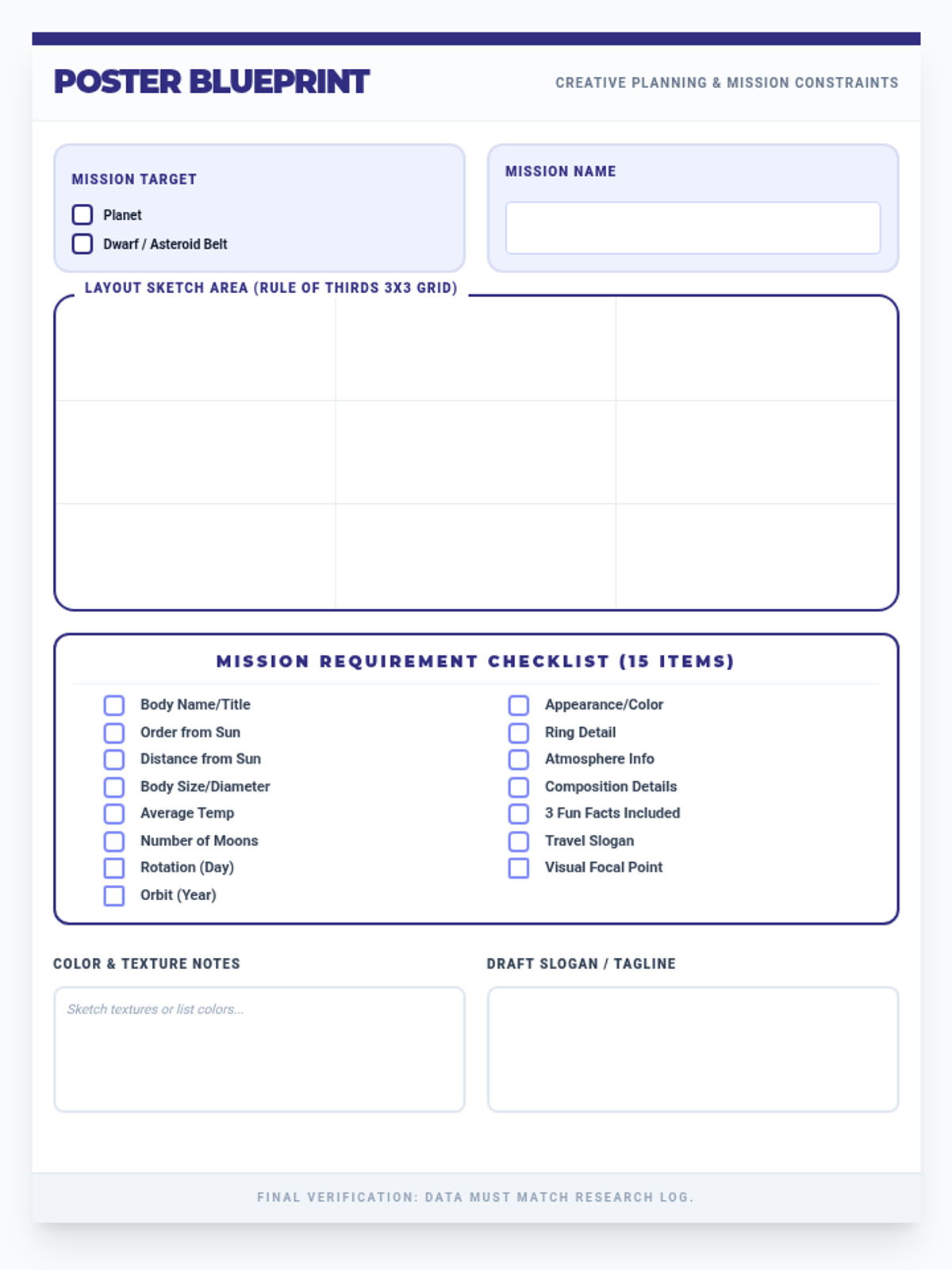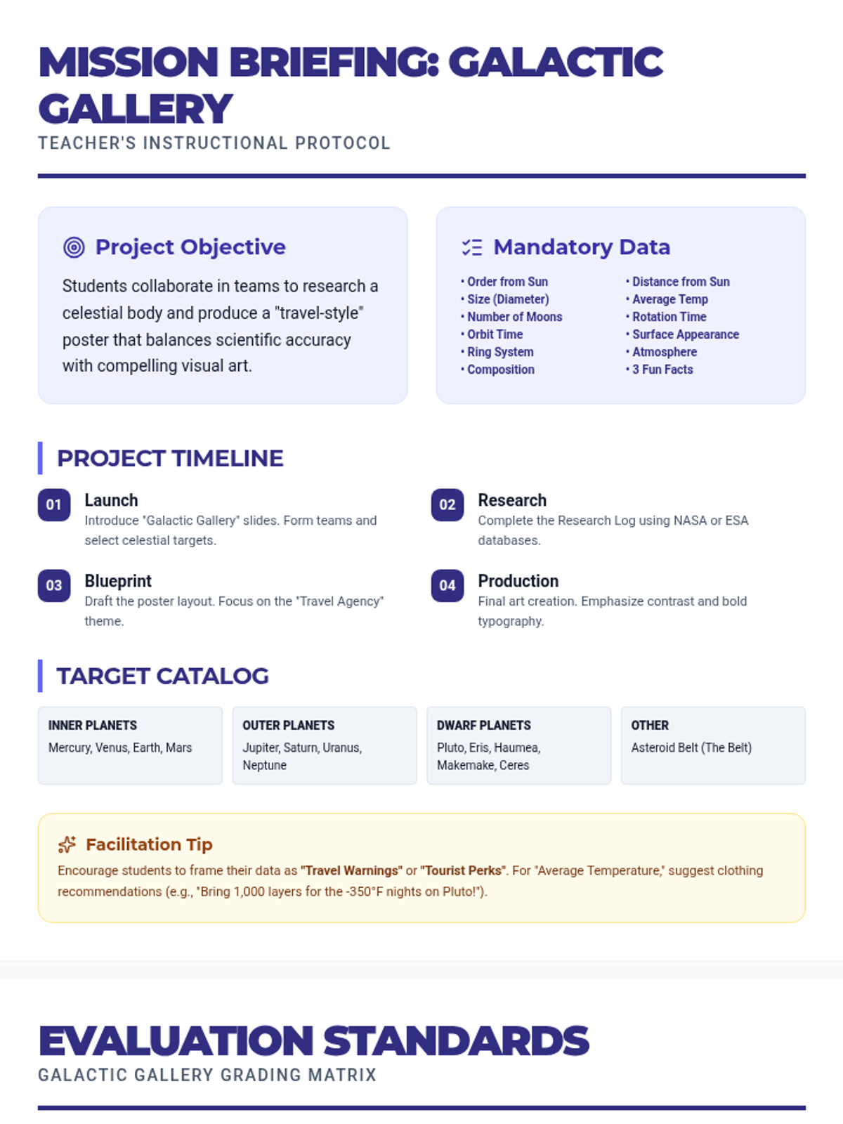 A collaborative project where students research and create artistic posters of planets, dwarf planets, or the asteroid belt, focusing on scientific data and visual representation.