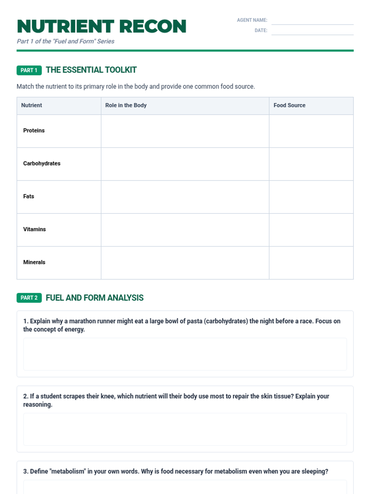 Identify the roles and sources of the five main nutrients and explain why organisms require food for energy and metabolic building materials.