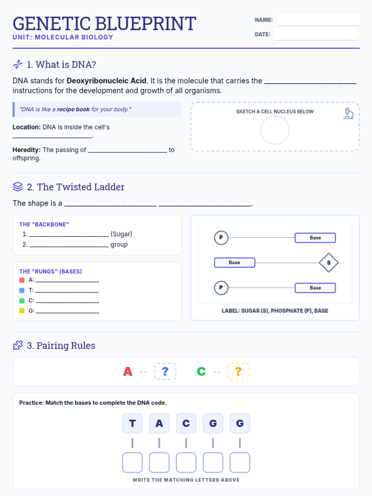 A comprehensive lesson covering the Central Dogma of biology, from the structure of DNA and its replication to the process of protein synthesis through transcription and translation.