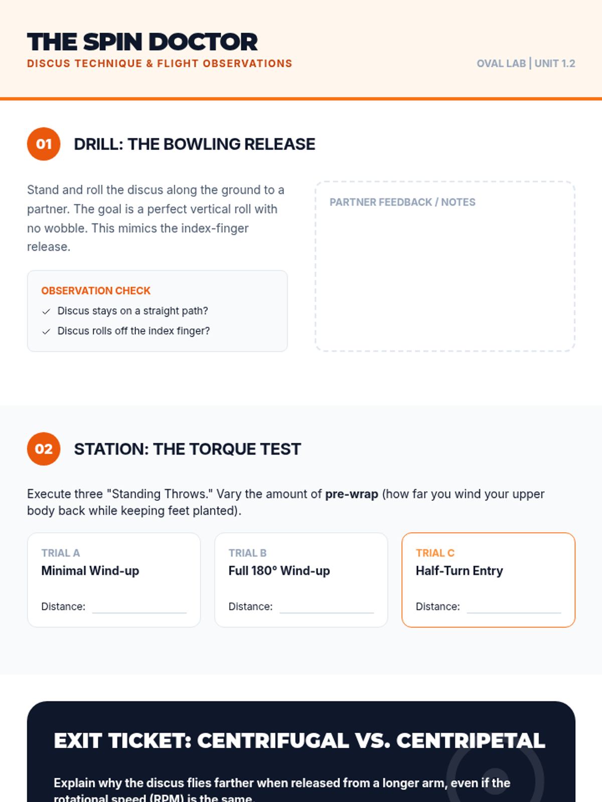 An introduction to rotational mechanics and torque in the discus, focusing on centrifugal force, aerodynamic flight, and stable release.