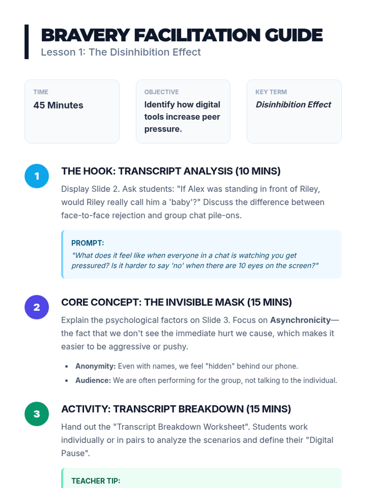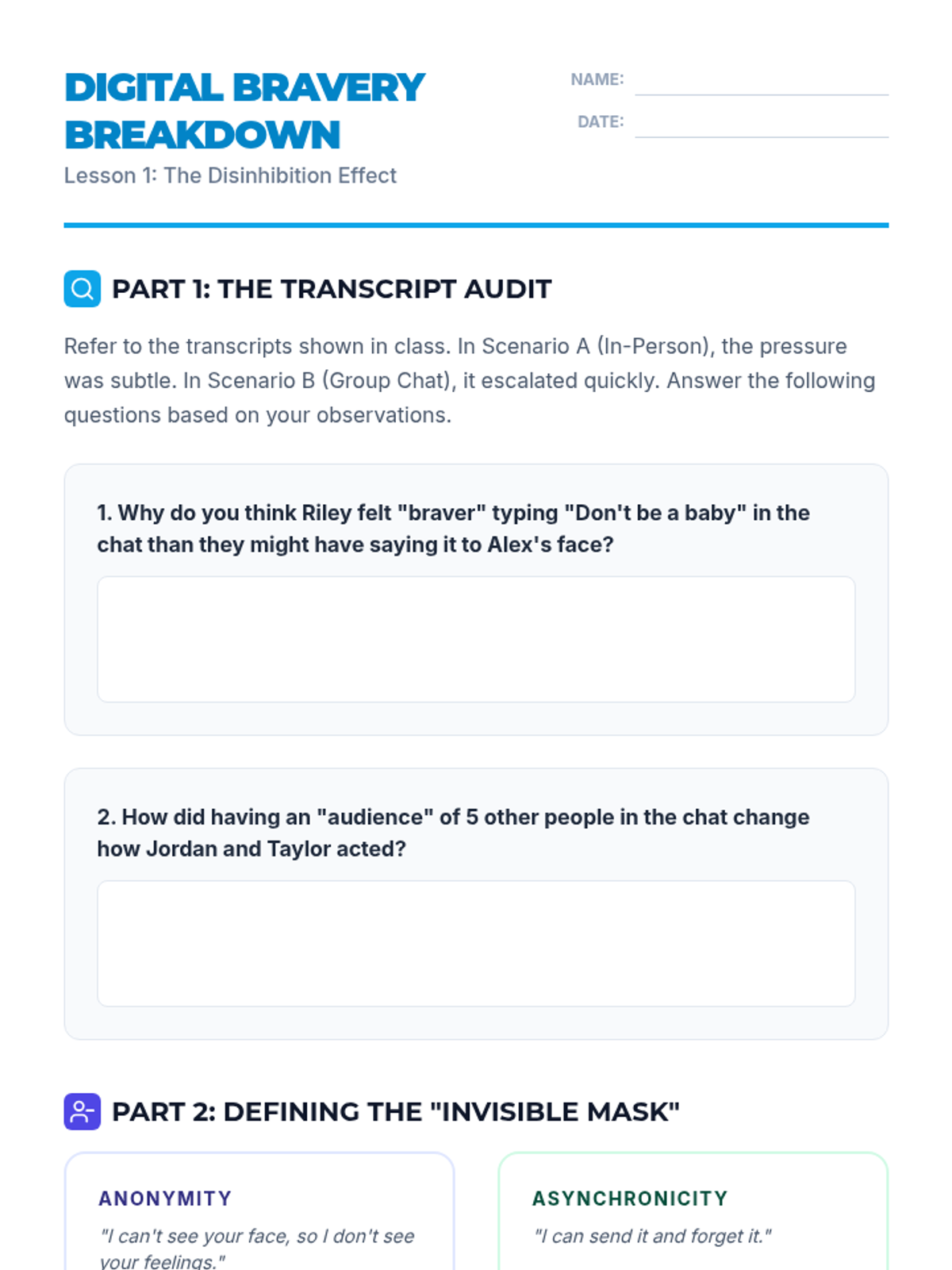 Students explore why people behave differently online than in person, specifically focusing on the 'disinhibition effect' and how it amplifies peer pressure in group chats.