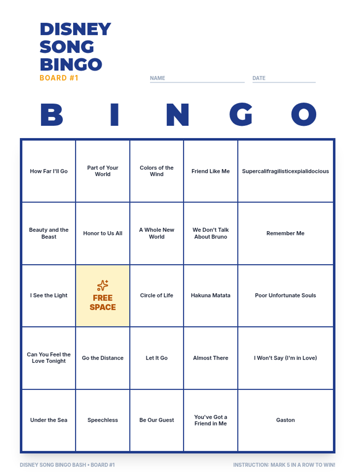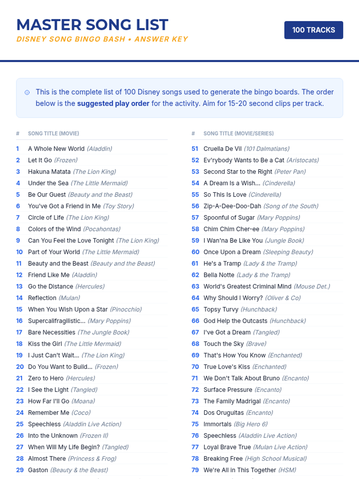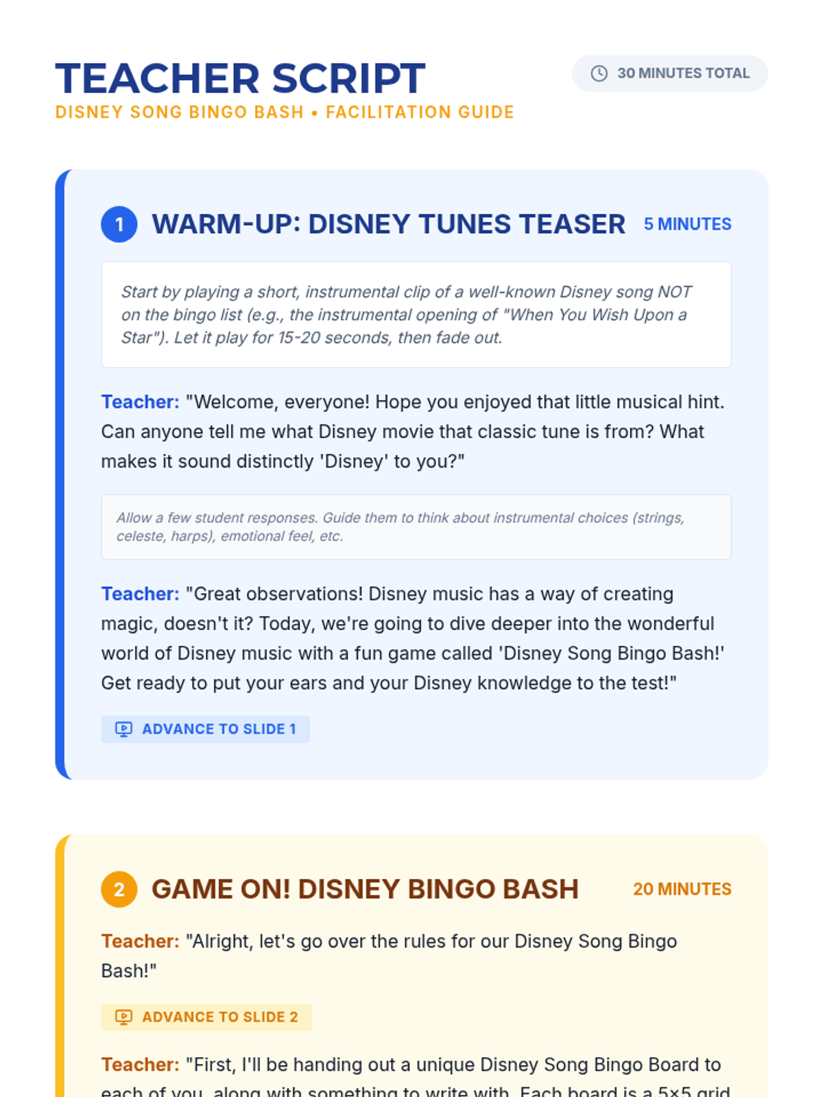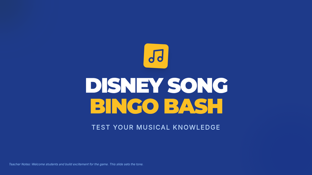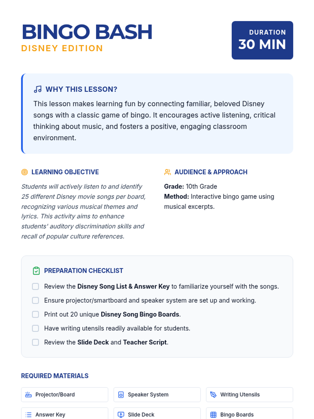 A high-energy, interactive music recognition lesson for 10th-grade students using Disney's most iconic songs. Students engage in active listening and auditory discrimination while playing a competitive game of bingo to identify musical themes and lyrics.