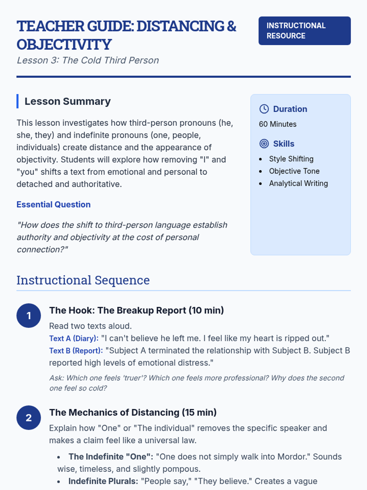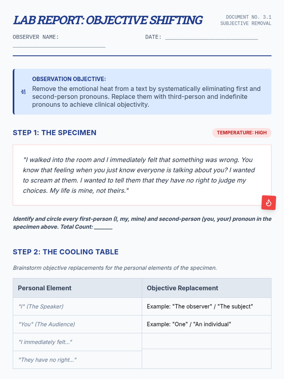 Investigating how third-person pronouns or indefinite pronouns create objectivity or distance, with a focus on rewriting emotional texts into objective accounts.