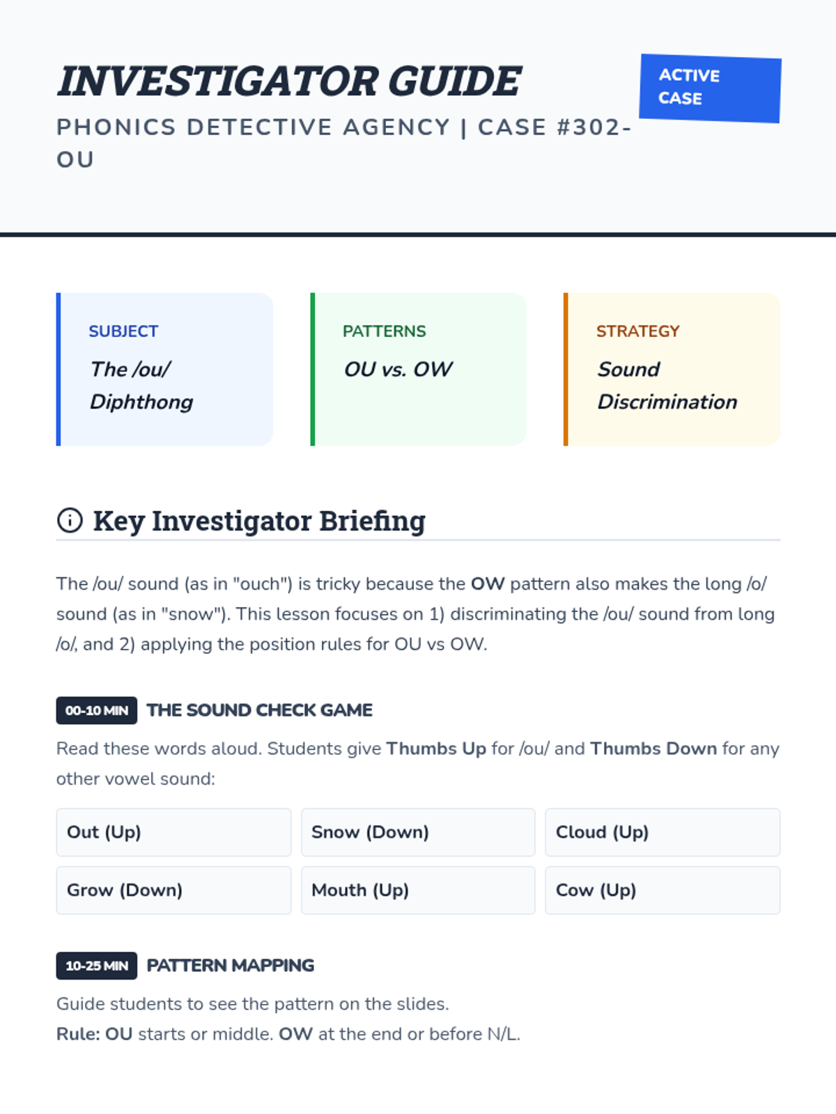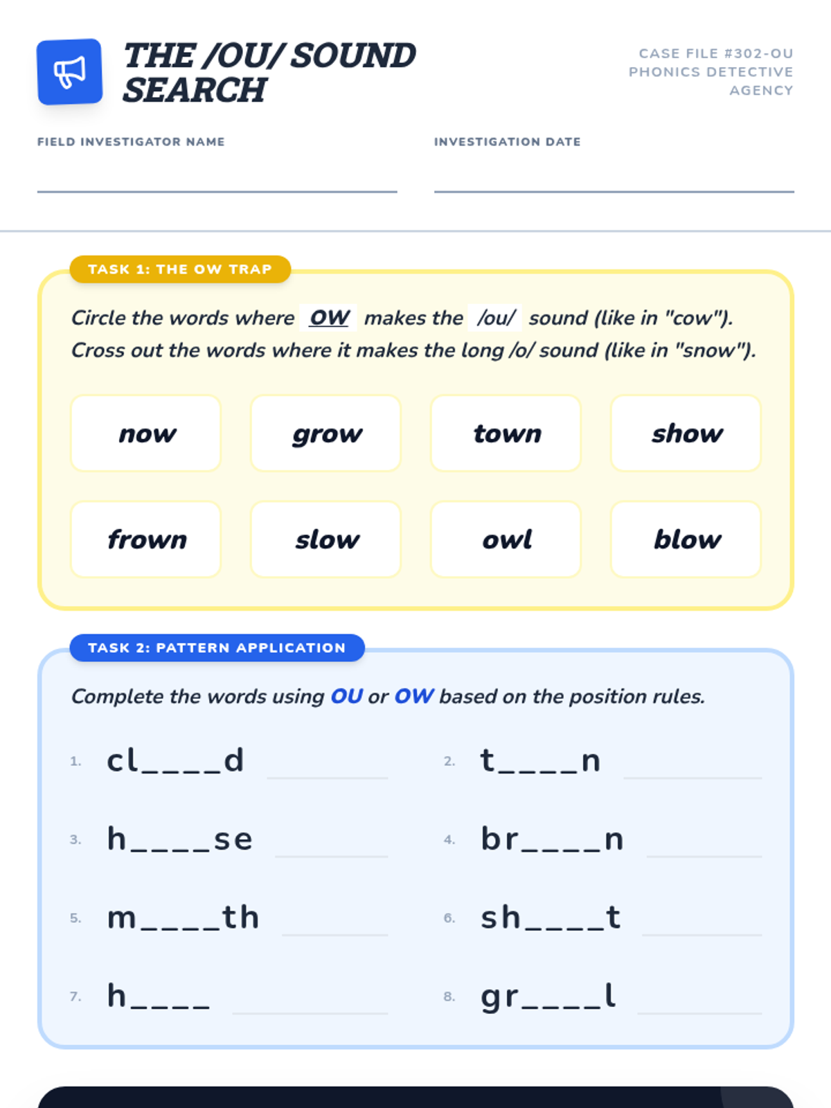 Building on the previous inquiry model, students explore the /ou/ sound. They learn to identify when to use 'ou' (often initial or medial positions) versus 'ow' (often final position or before n/l). The lesson includes a 'sound check' activity to differentiate the /ou/ in 'cow' from the long /o/ in 'snow'.
