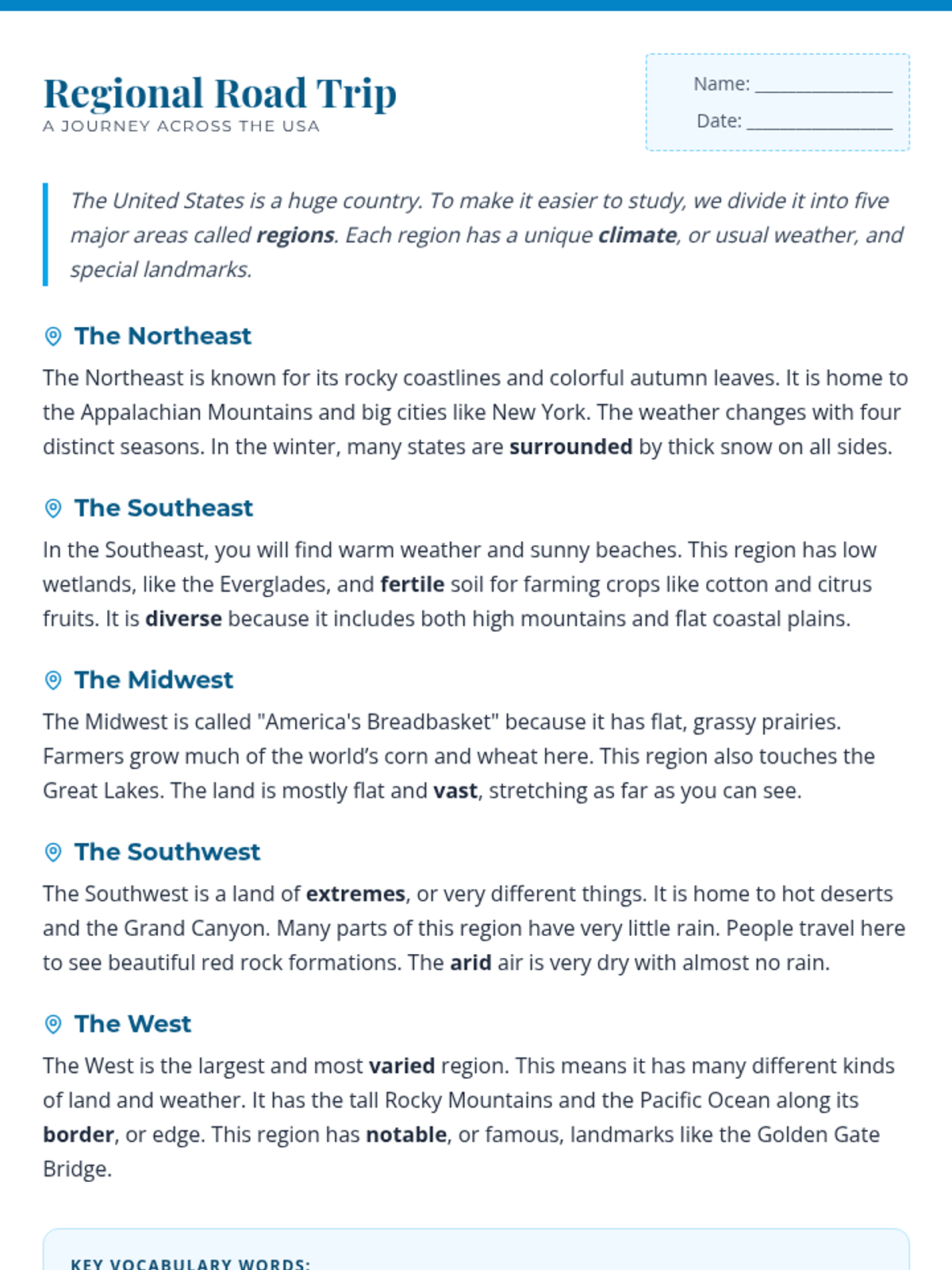 A comprehensive lesson exploring the five major regions of the United States, focusing on key geographic features and vocabulary through informational text.