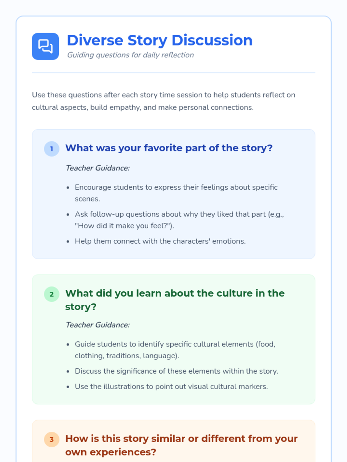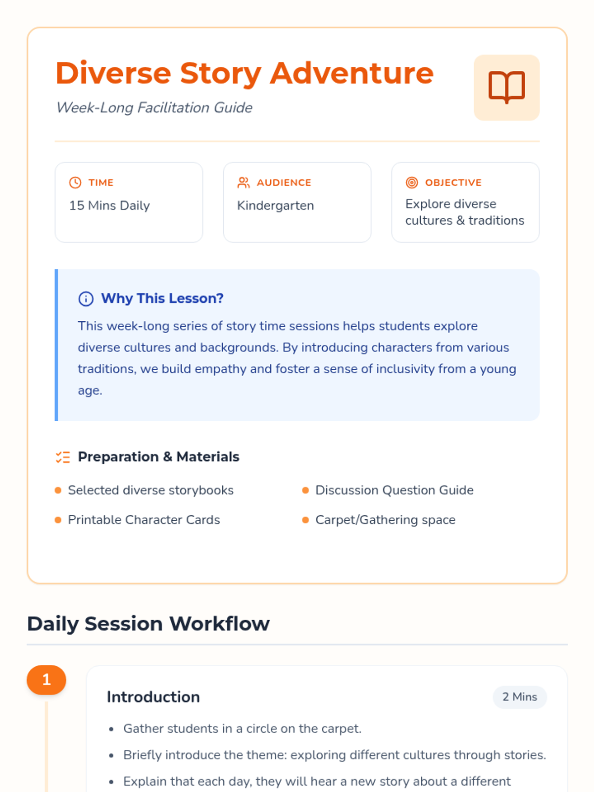 A week-long series of 15-minute daily story time sessions for kindergarteners to explore diverse cultures and build empathy through storytelling.
