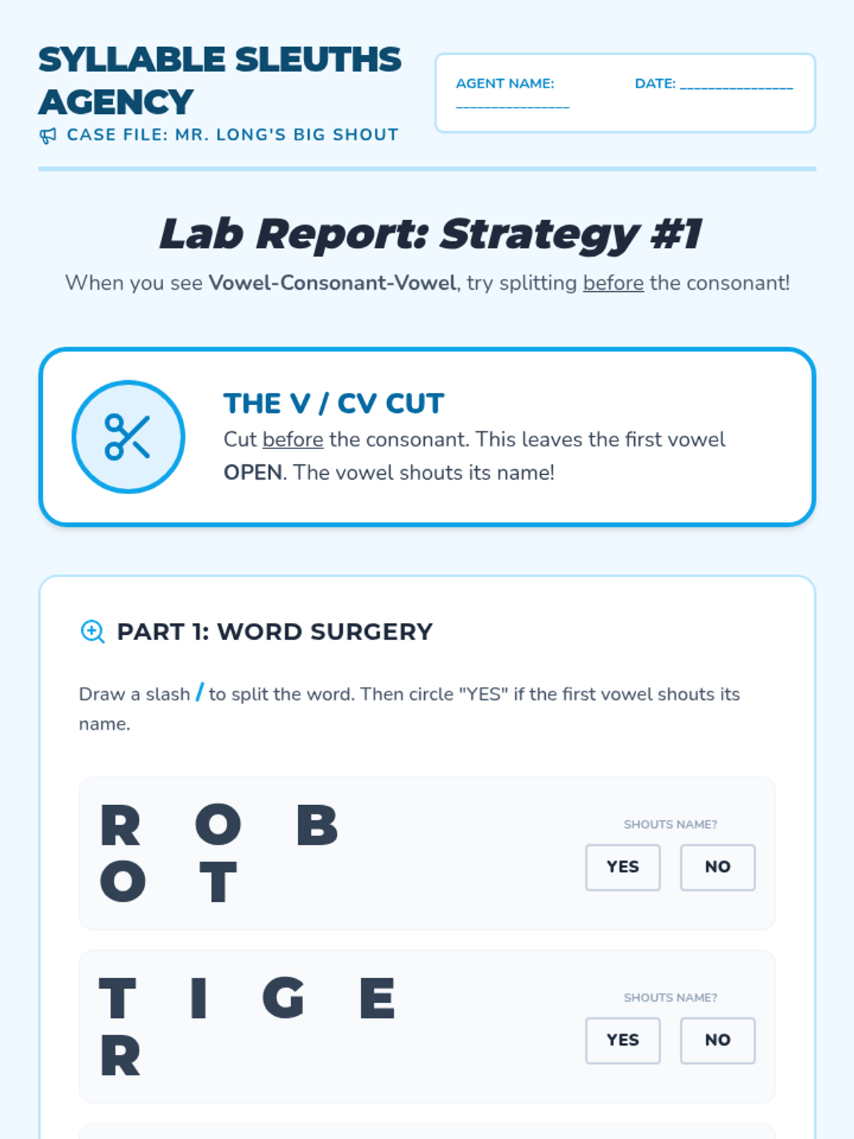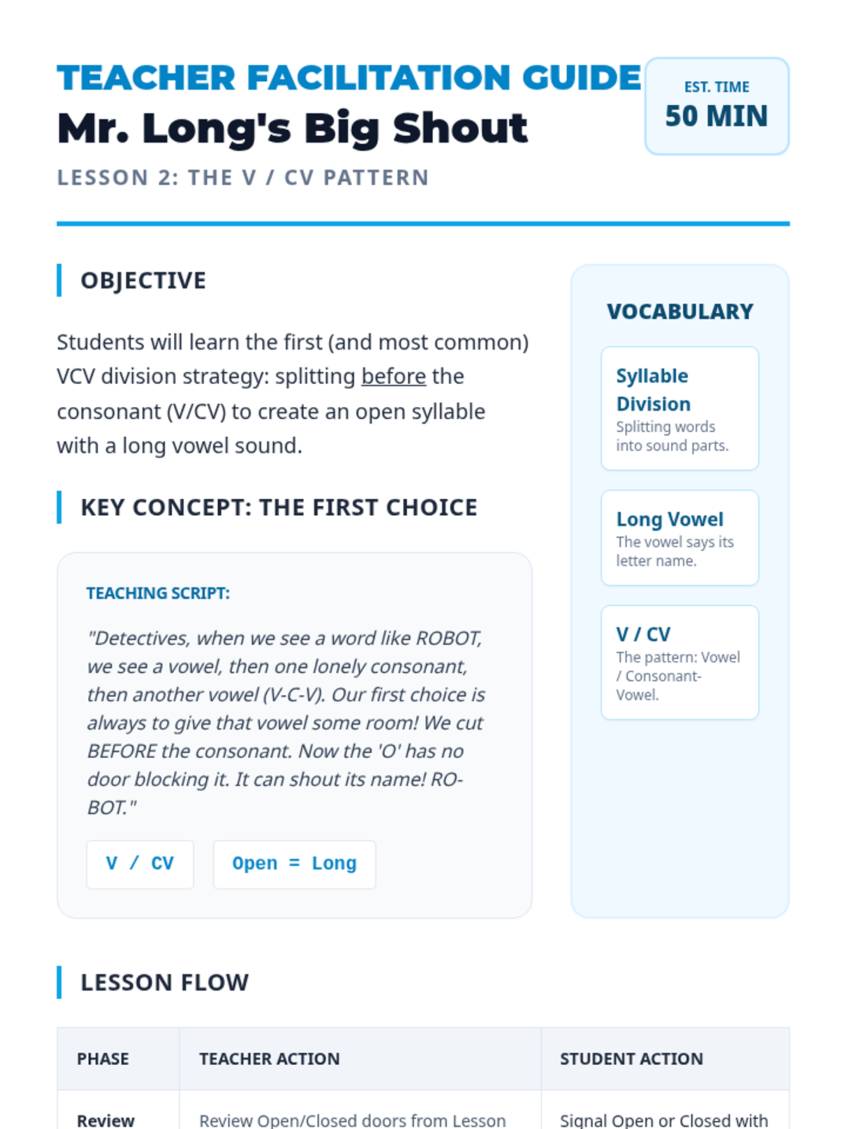 Focuses on the most common VCV division (V/CV), where the first syllable is open and the vowel says its name.