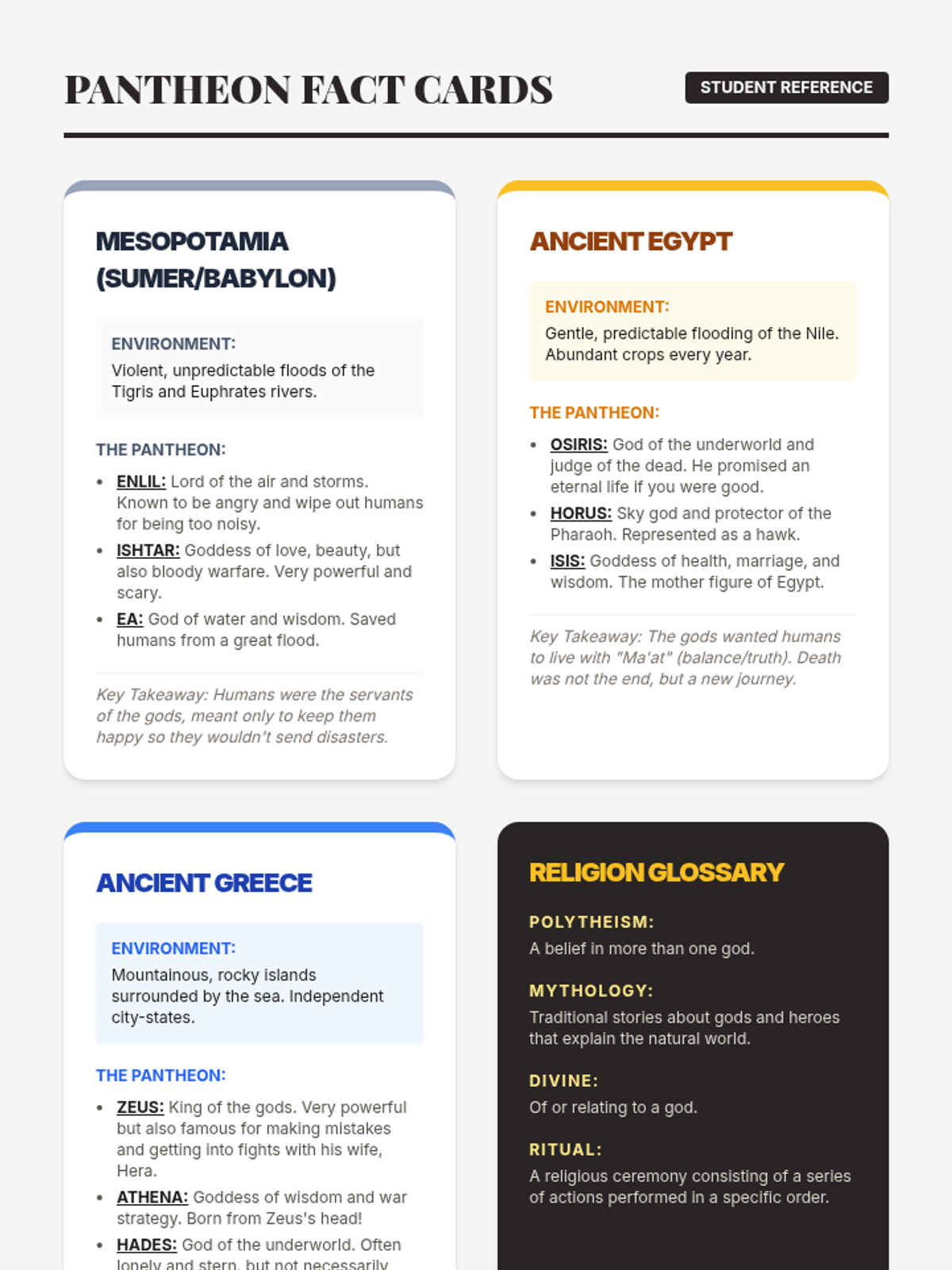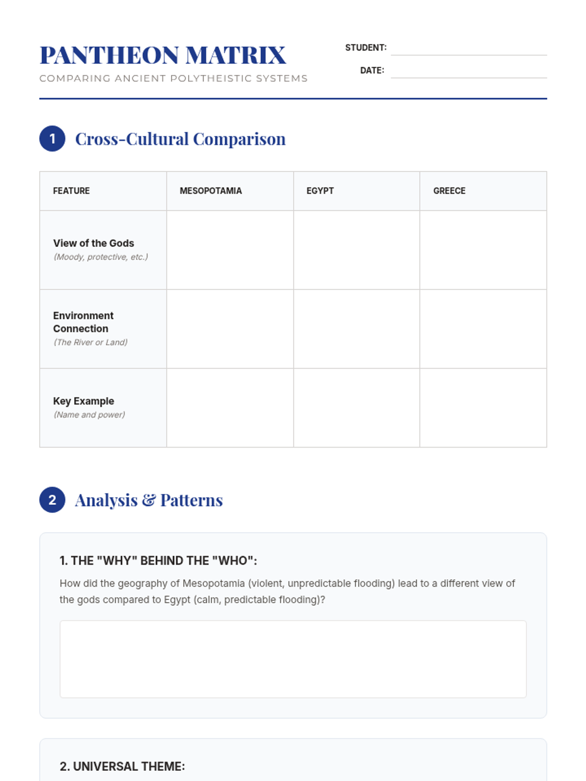Students investigate the polytheistic systems of Mesopotamia, Egypt, and Greece, identifying how gods mirrored natural forces and human behaviors.