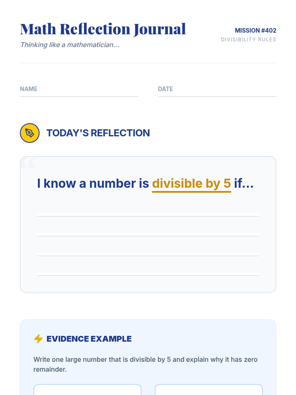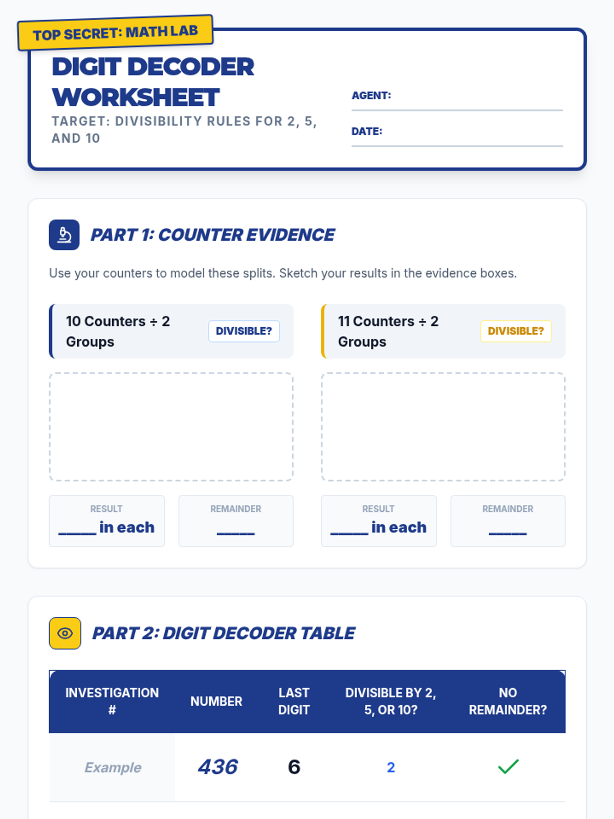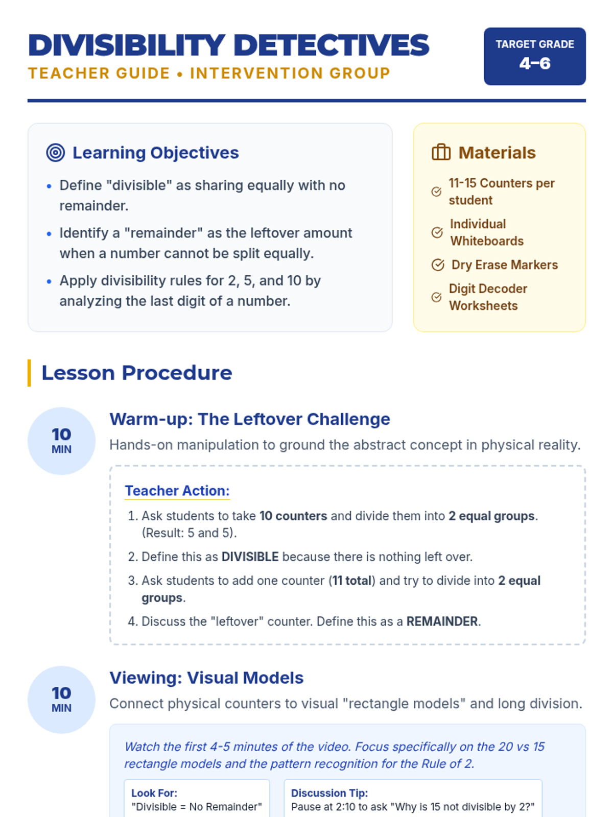 An intervention-focused lesson for 4th-6th graders to master divisibility rules for 2, 5, and 10 using visual models, hands-on counters, and pattern recognition. Students learn to distinguish between 'divisible' and 'remainder' through interactive prediction and rectangle models.
