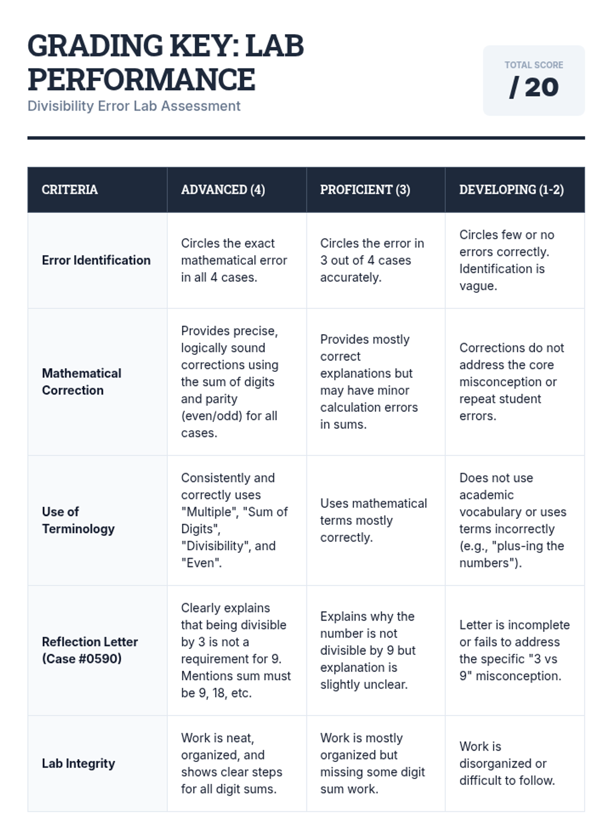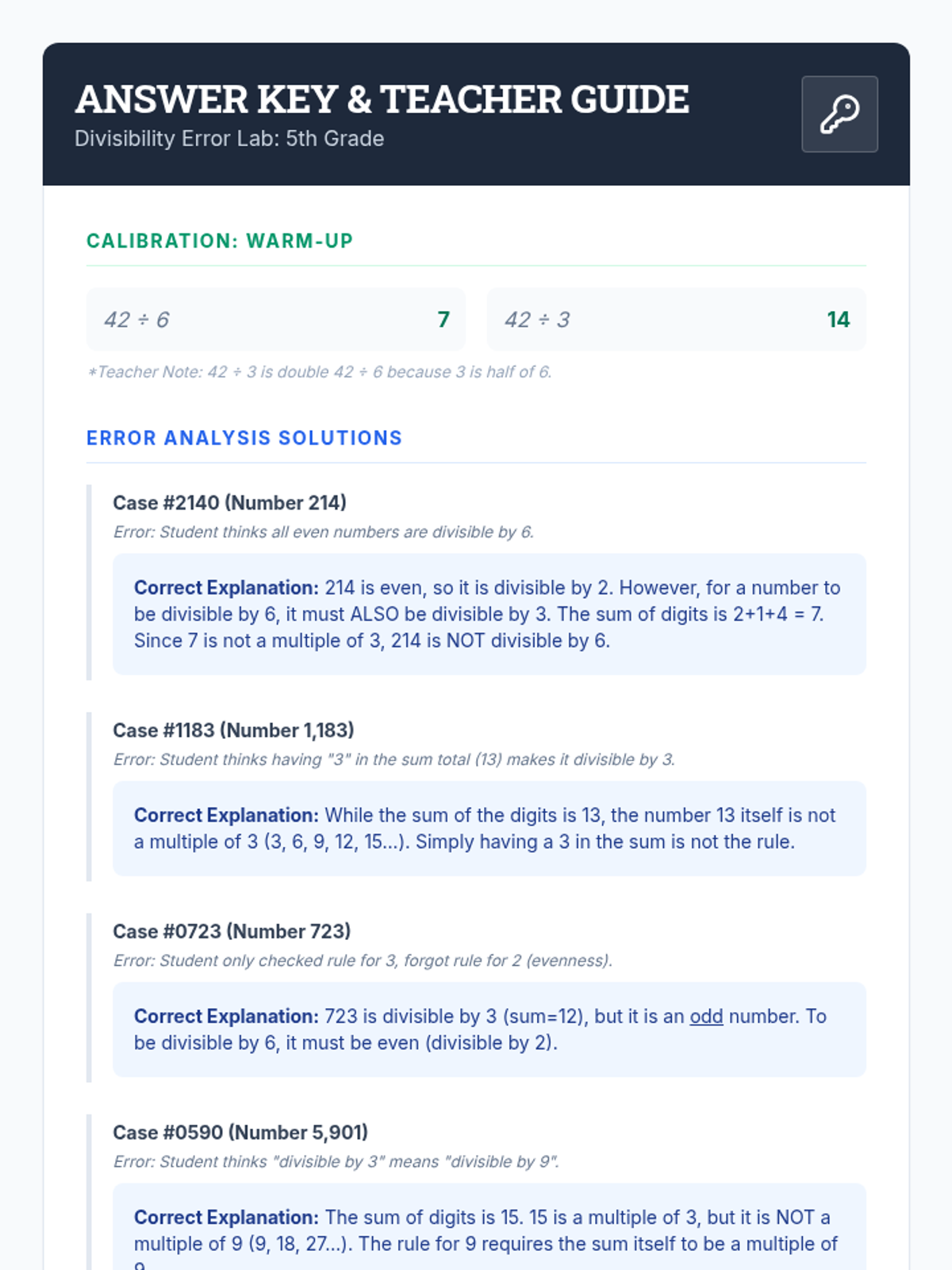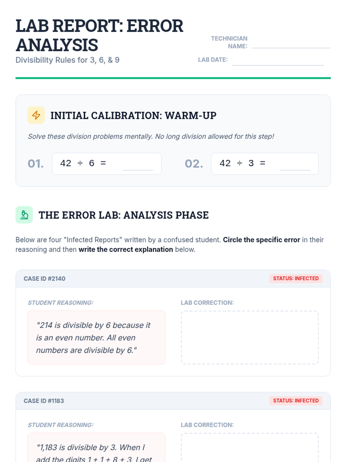 Students act as 'Lab Technicians' in the Divisibility Error Lab, identifying and correcting common misconceptions regarding the divisibility rules for 3, 6, and 9 based on a video lesson by Ms. Doria.