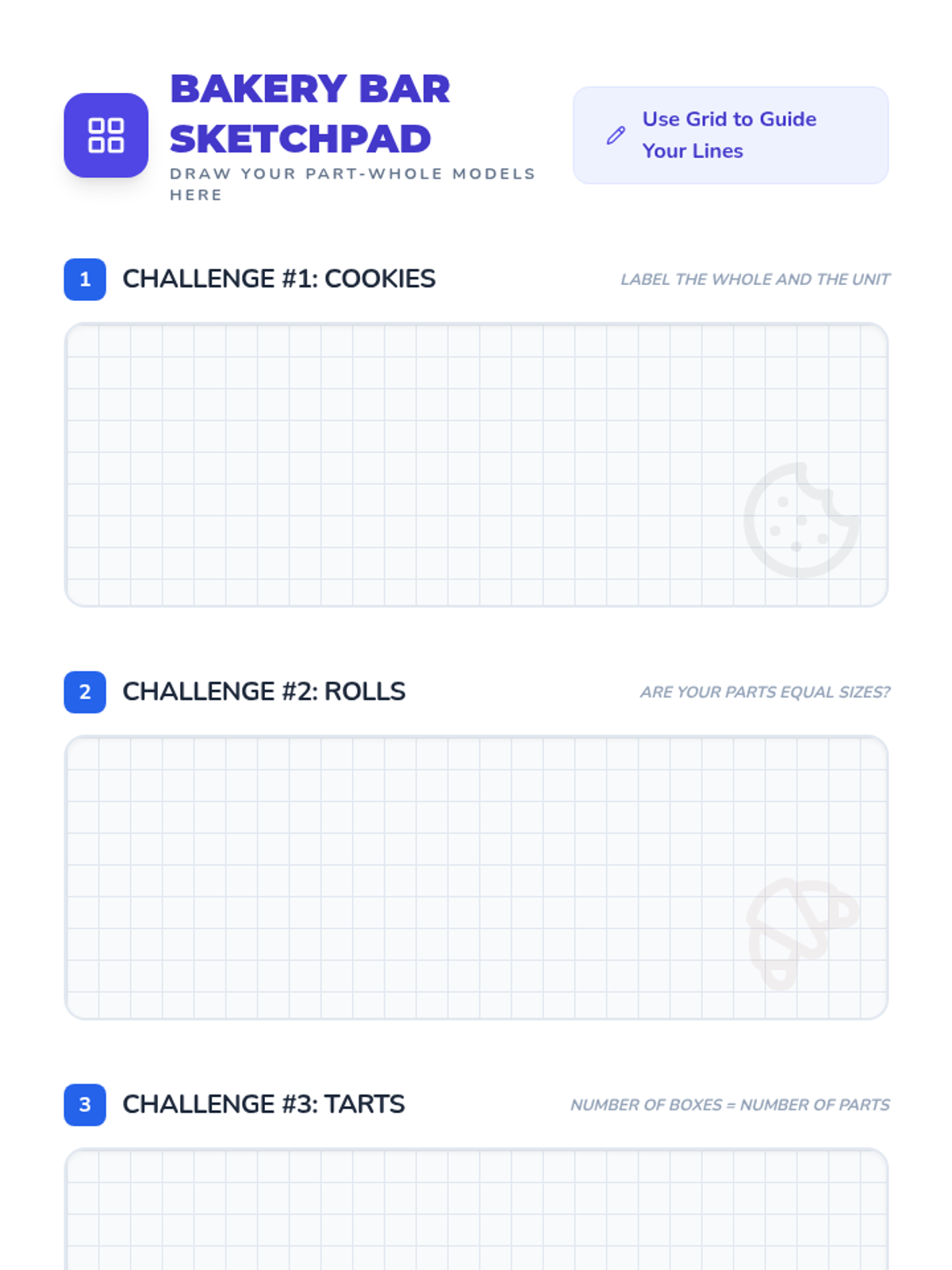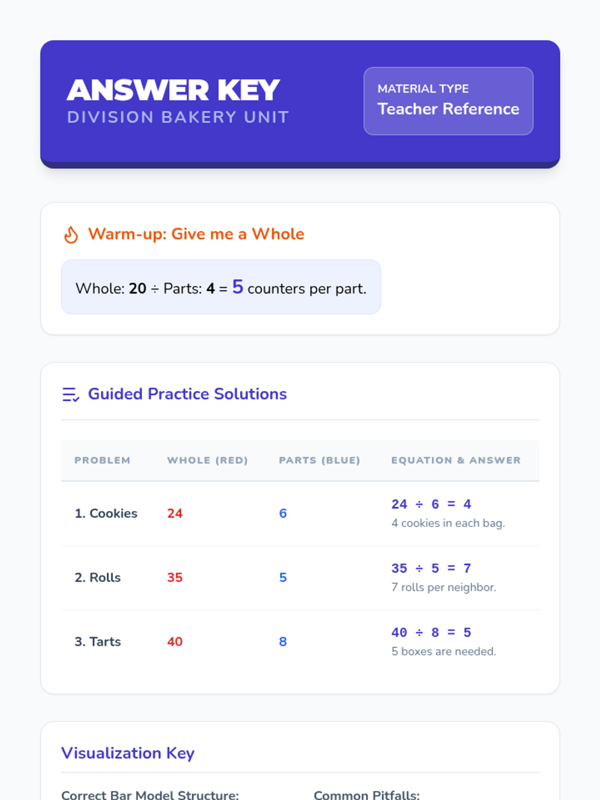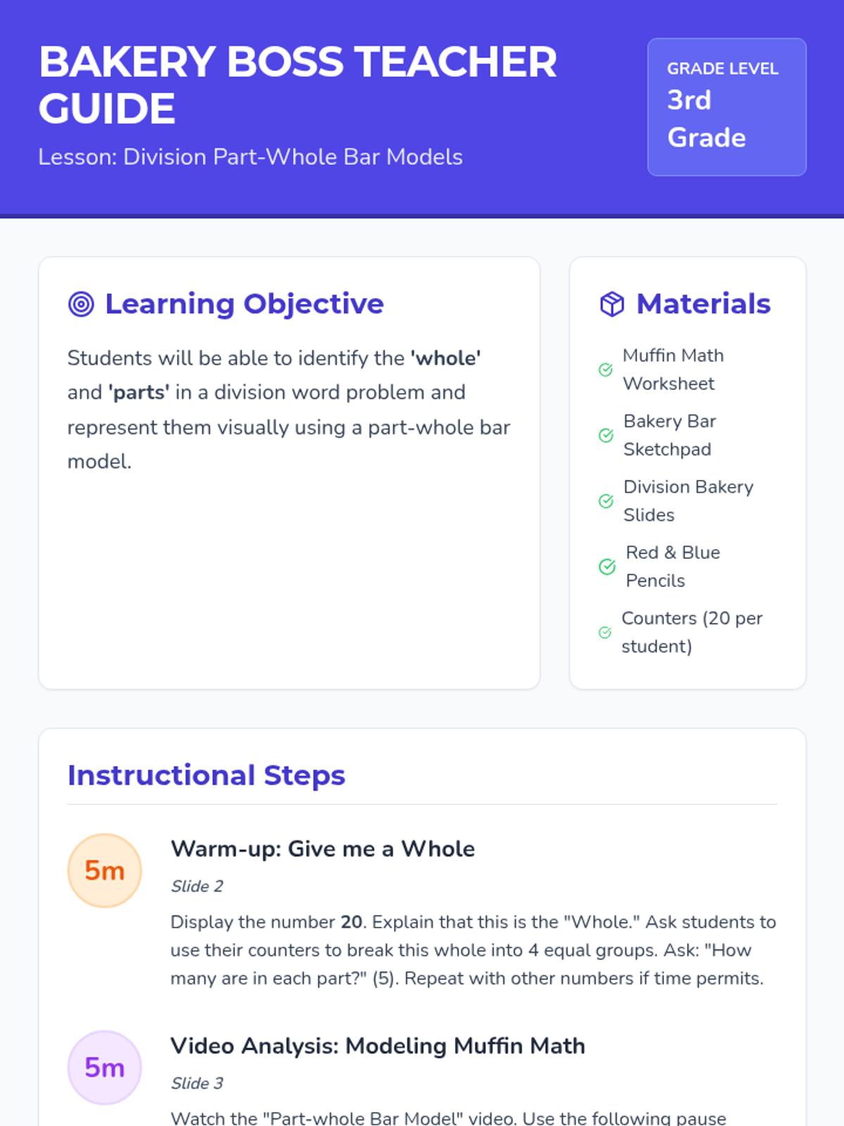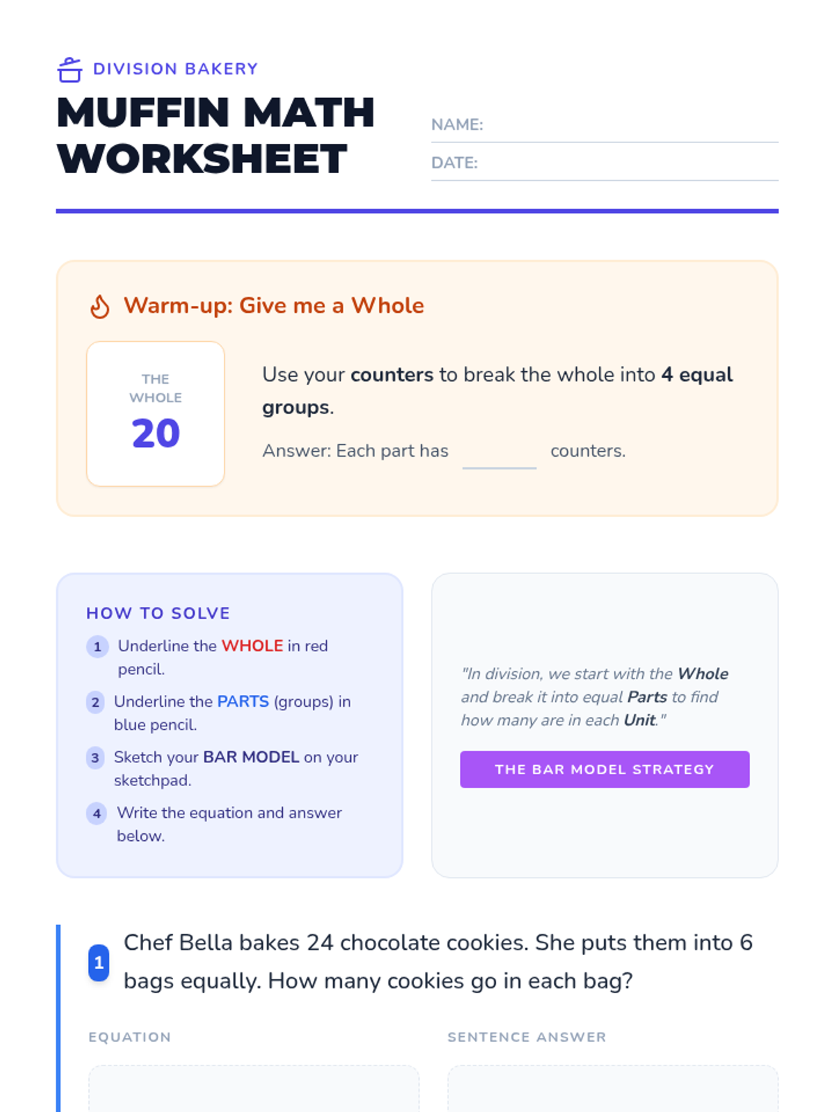Students will learn to identify the 'whole' and 'parts' in division word problems using a part-whole bar model visual strategy. This lesson uses a bakery theme to engage 3rd-grade students in concrete, representational, and abstract mathematical thinking.