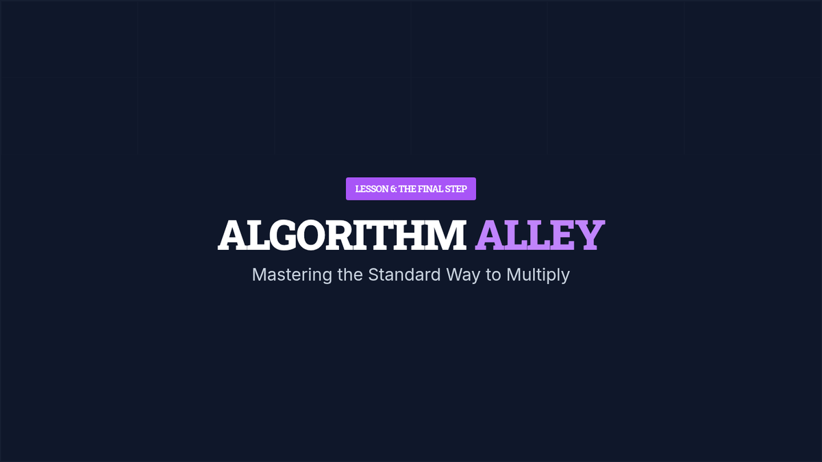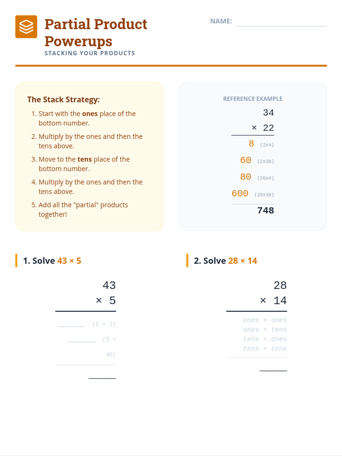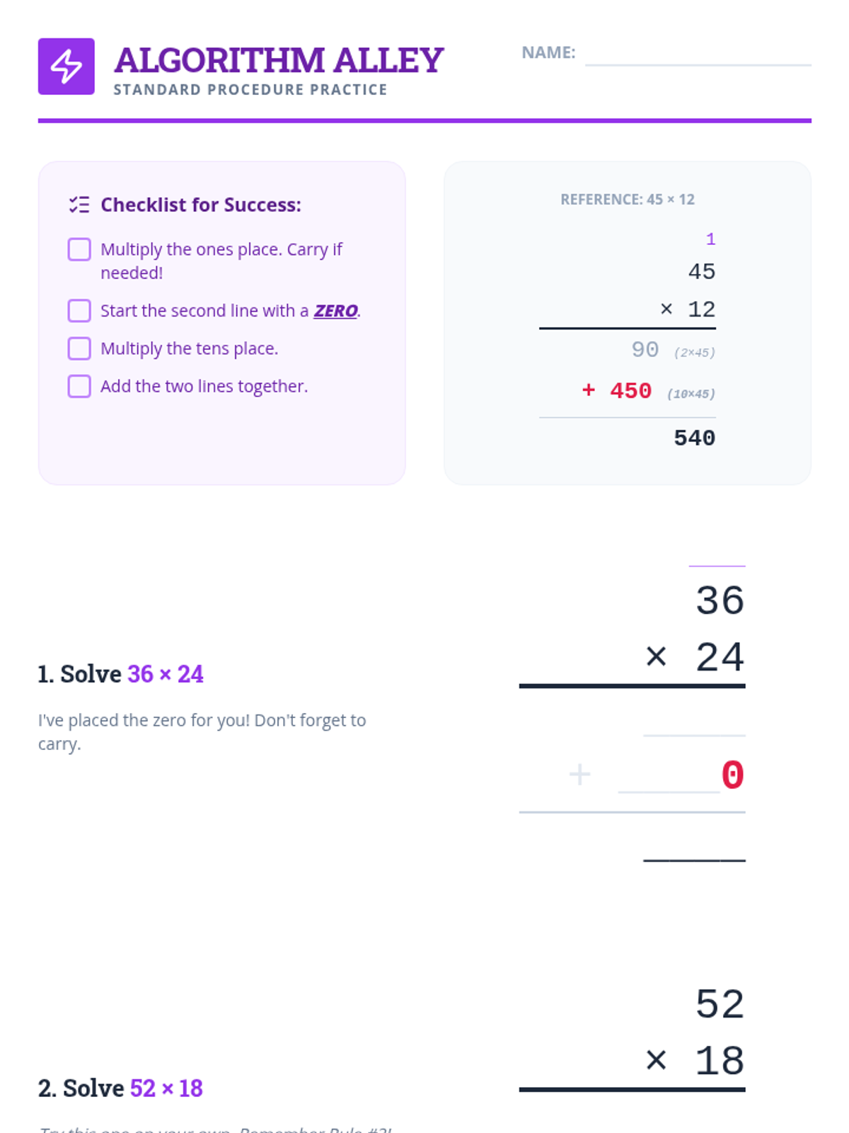 Scaffolded introduction to the standard algorithm for multi-digit multiplication, connecting each step back to place value.