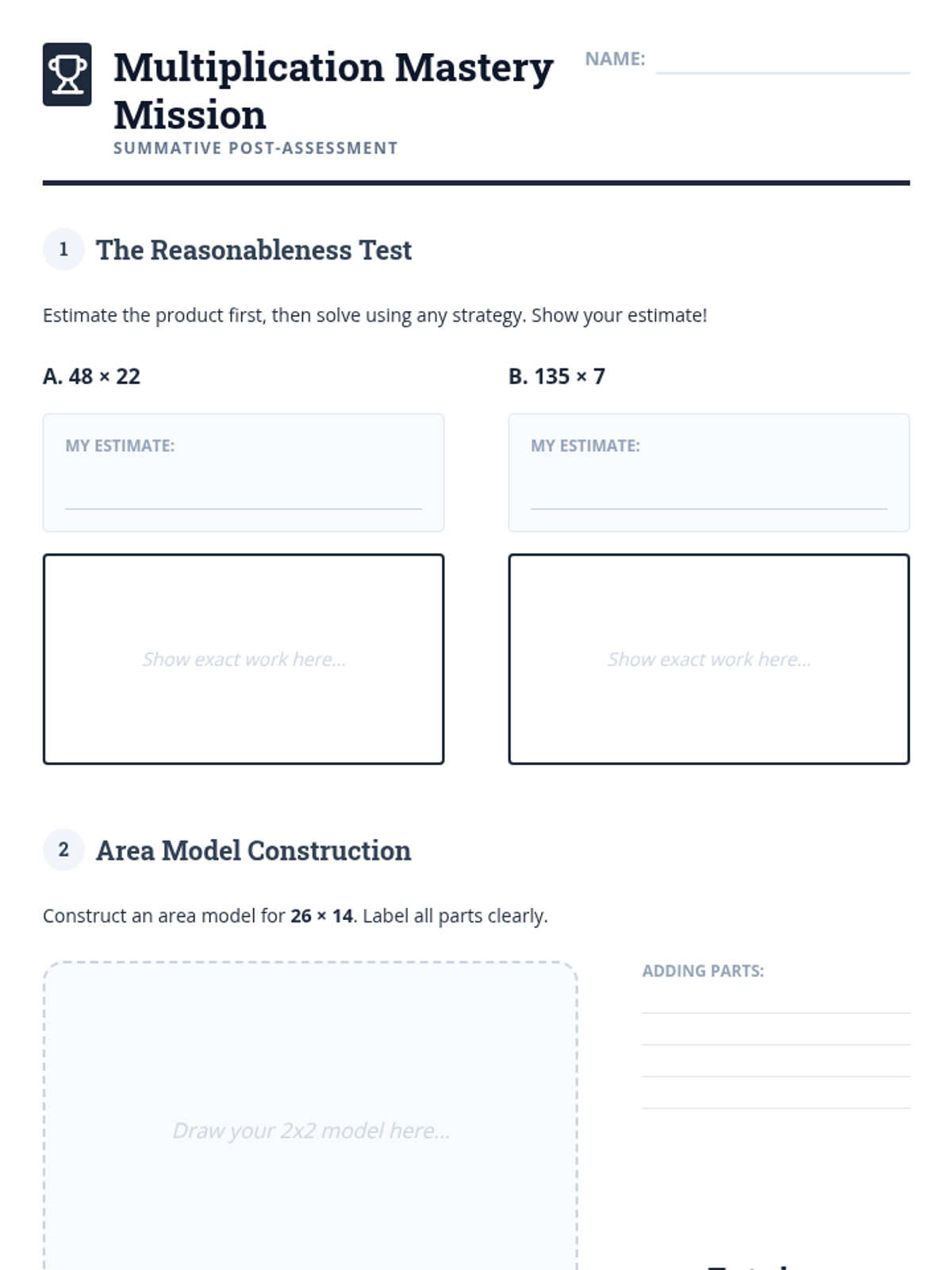 Final summative assessment to measure growth and mastery of multi-digit multiplication strategies.