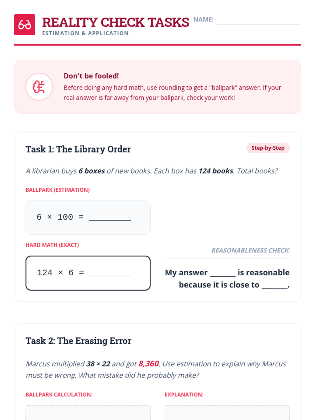 Using rounding and estimation to check the reasonableness of products and applying skills to real-world word problems.