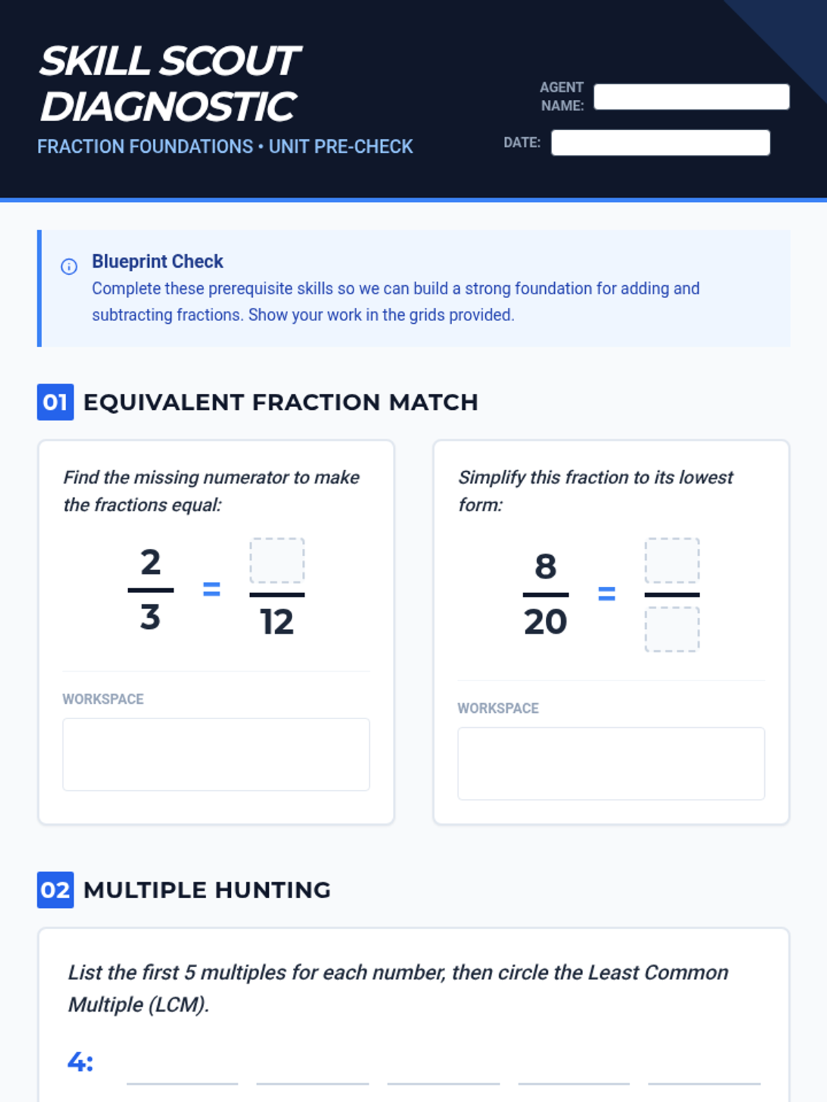 Assessment of prerequisite skills including equivalent fractions and common multiples to identify specific gaps in student understanding.