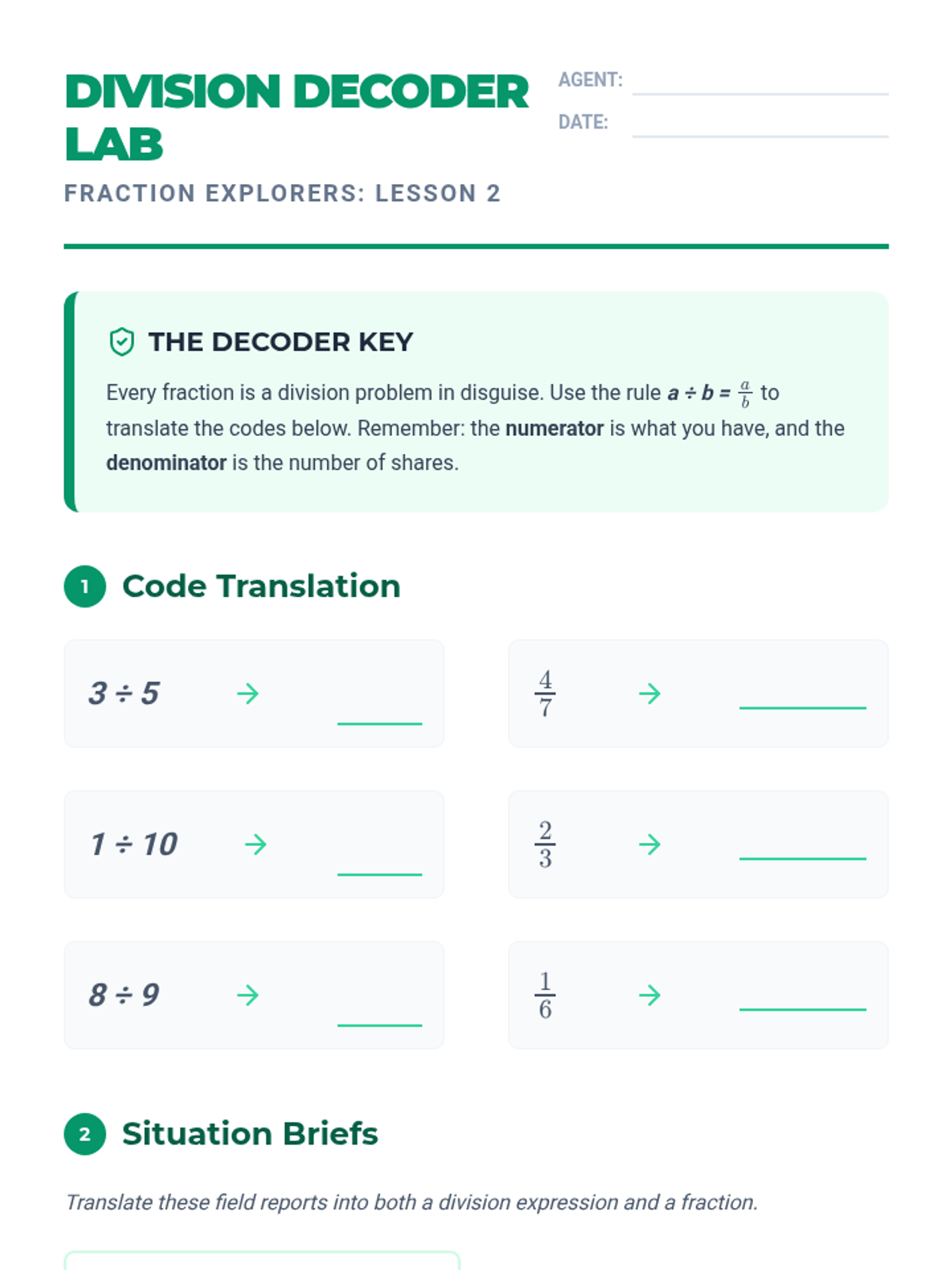 Students formalize the relationship between division expressions and fractional notation. They learn to interpret the fraction bar as a division symbol and translate between the two formats.