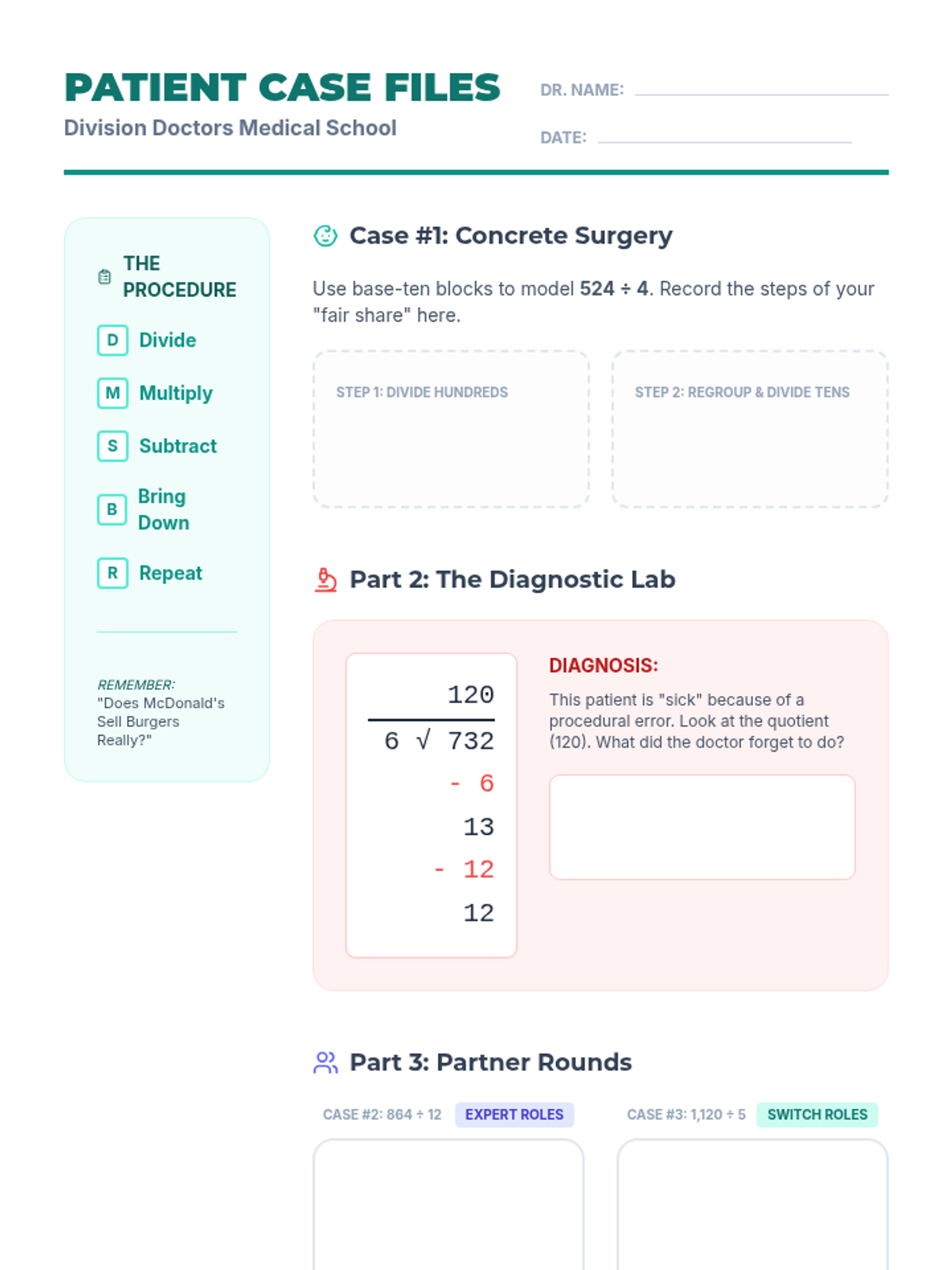 A targeted small group intervention lesson focusing on multi-digit division fluency. Students move from concrete base-ten representations to the standard algorithm, identify common procedural errors, and practice with partners to build division confidence.