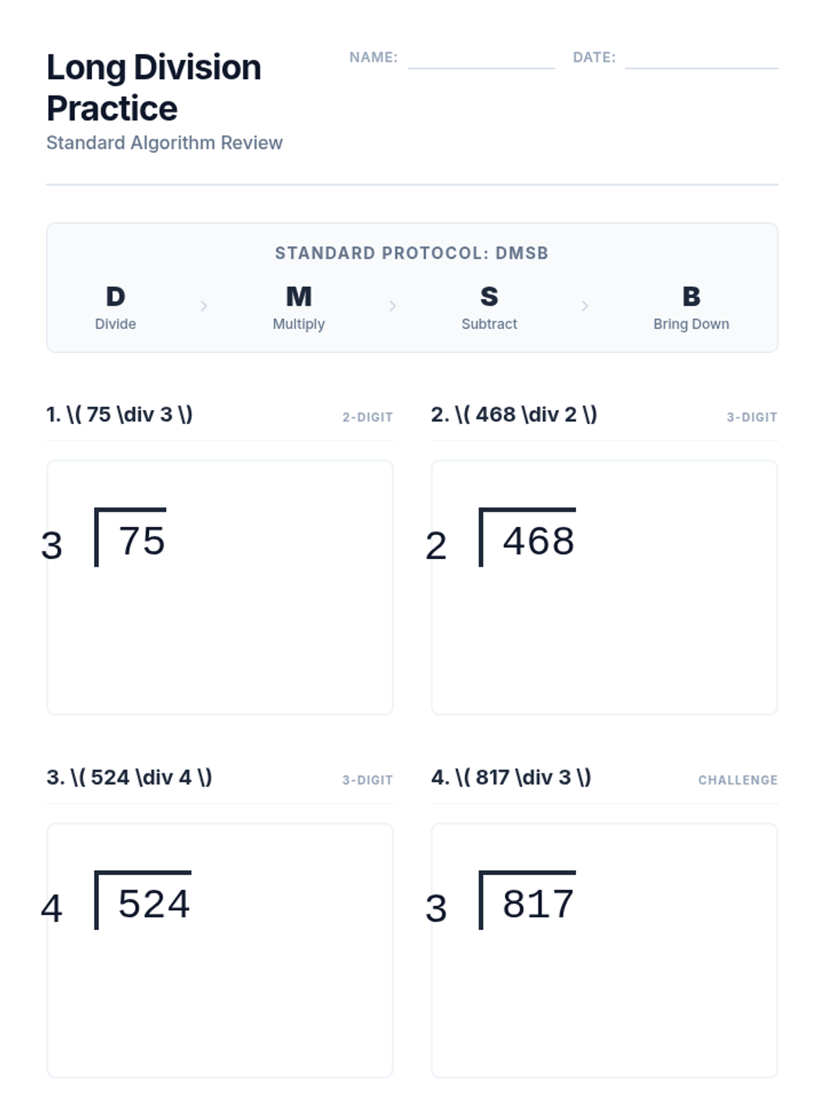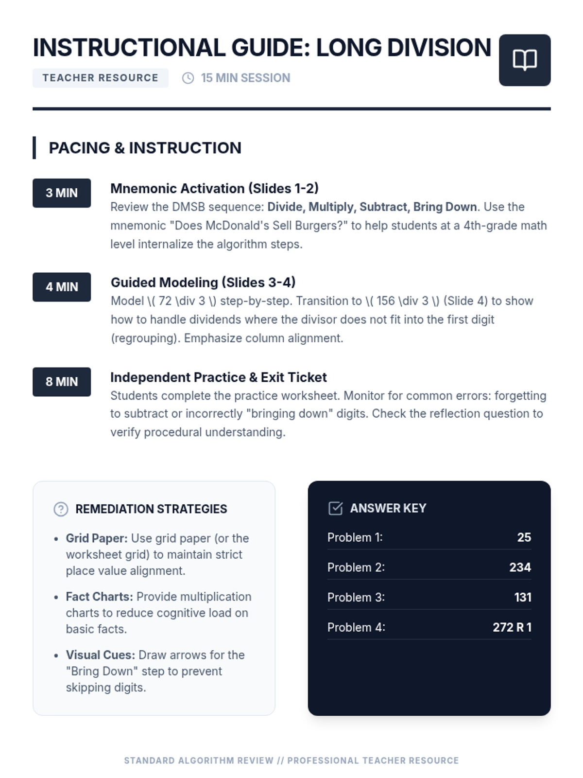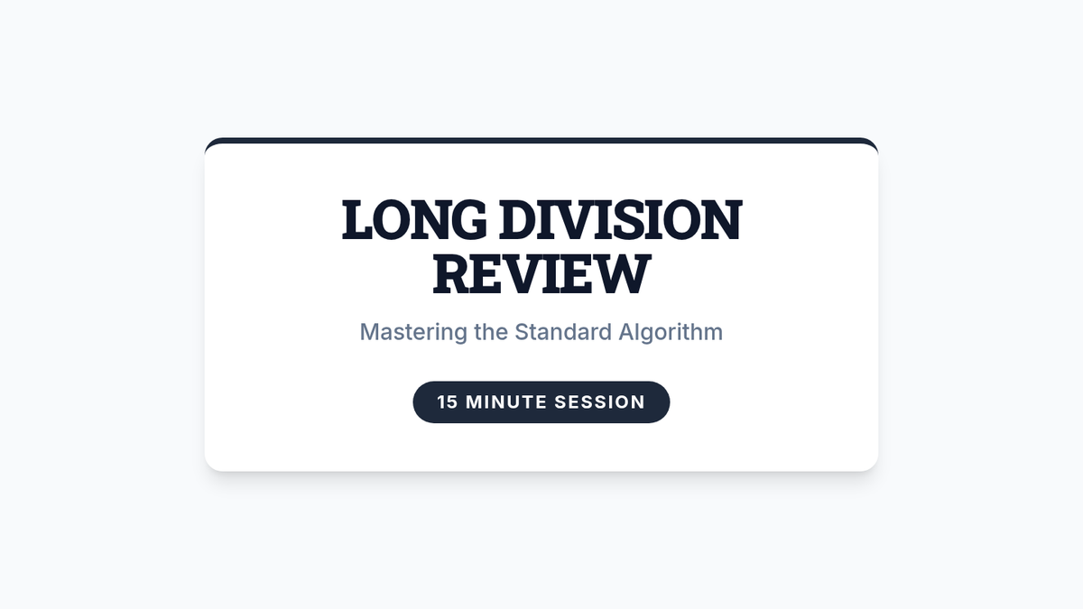 A focused, 15-minute review of the long division standard algorithm for students requiring scaffolded support. Features clear modeling of the DMSB method and progressive multi-digit practice problems.