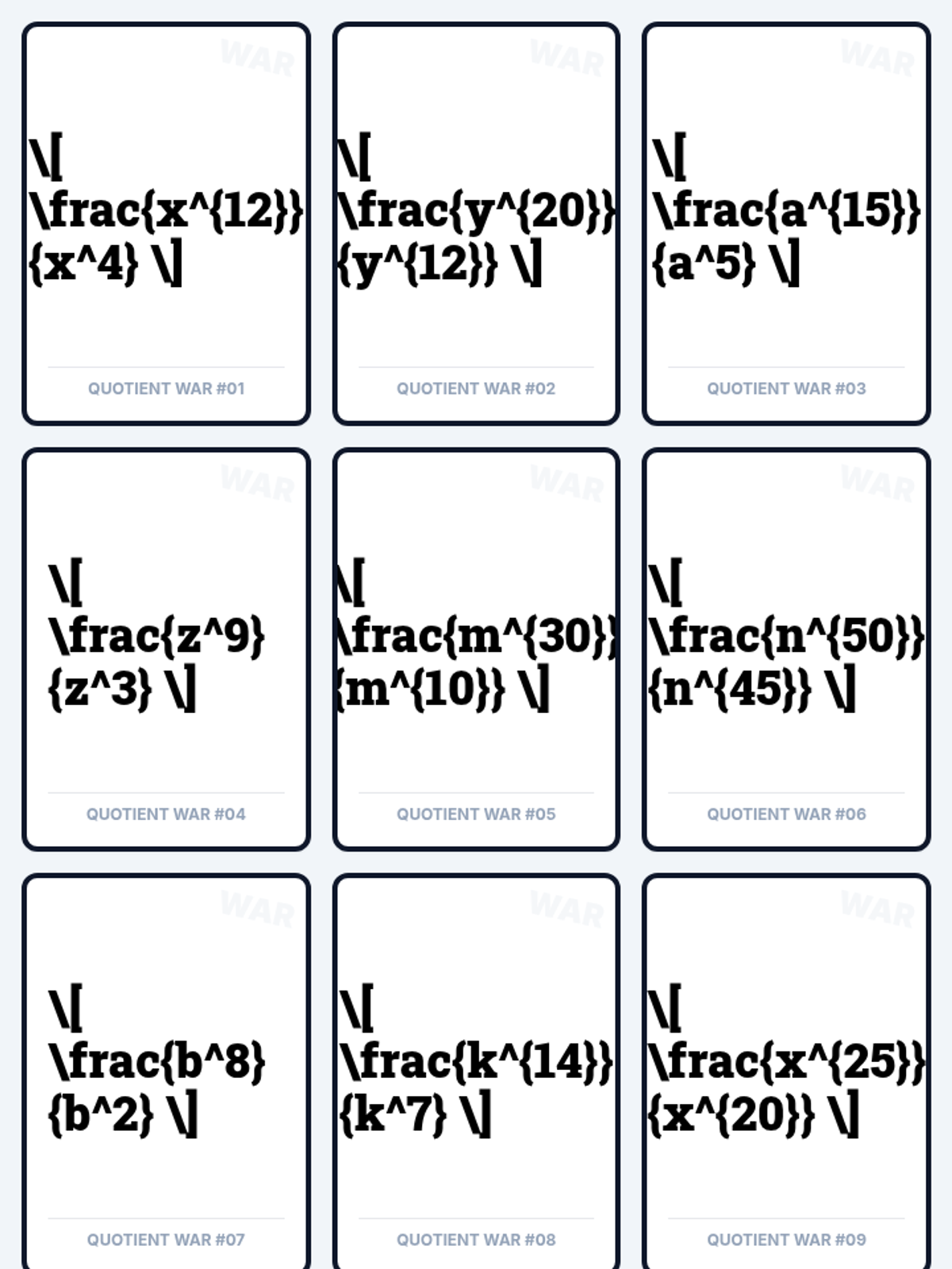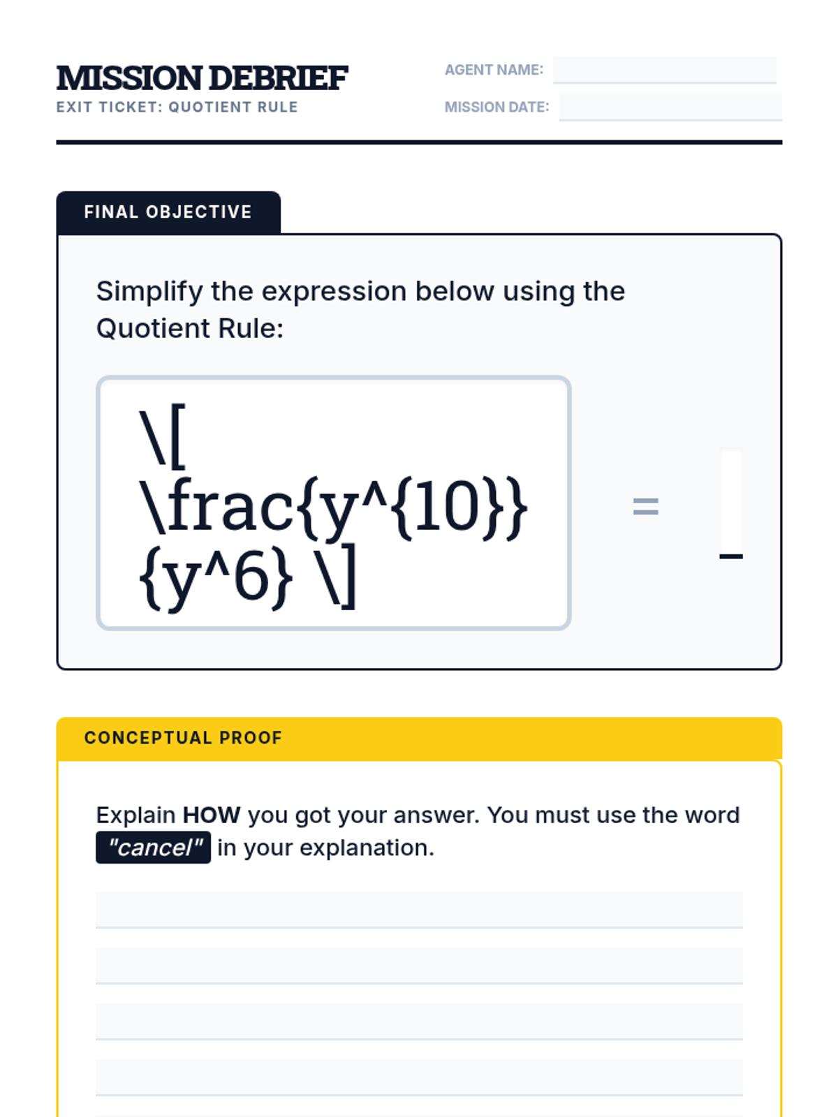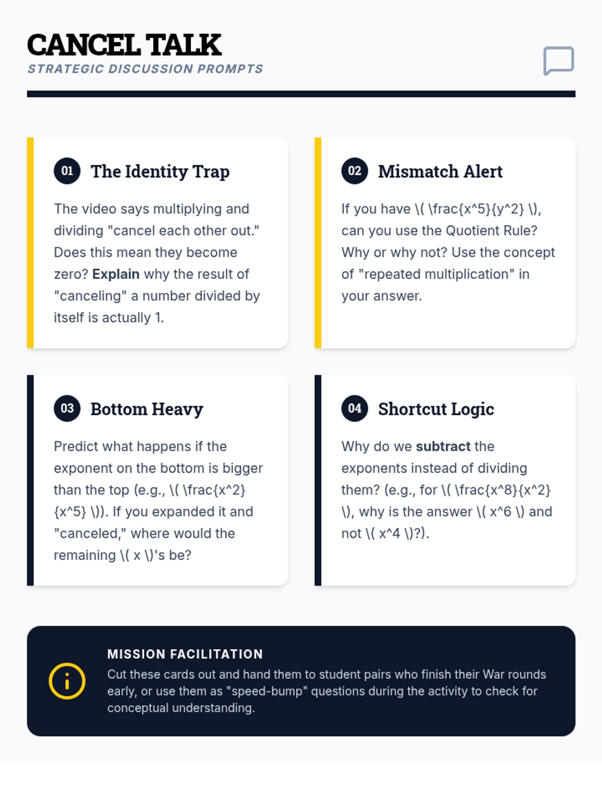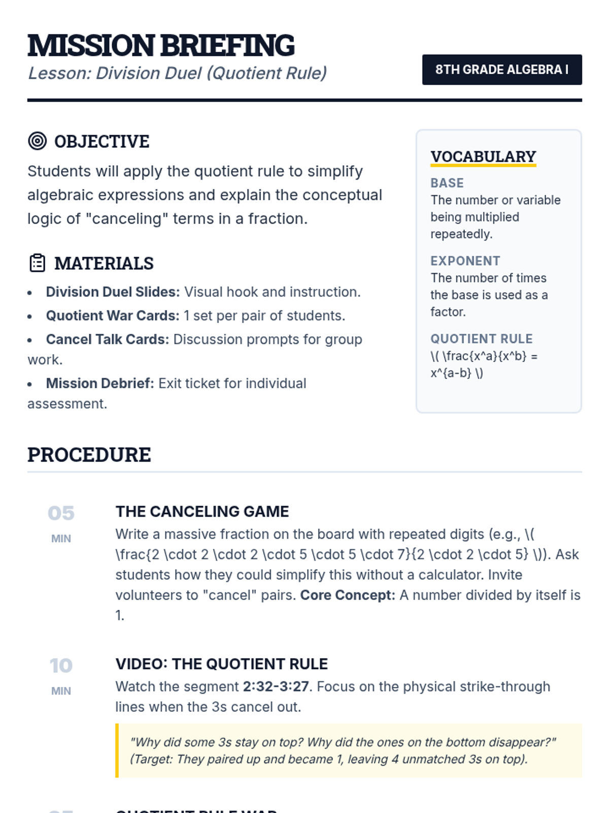 Students will master the quotient rule for exponents through a fast-paced 'war' card game and visual analysis of terms 'canceling out' in algebraic fractions.