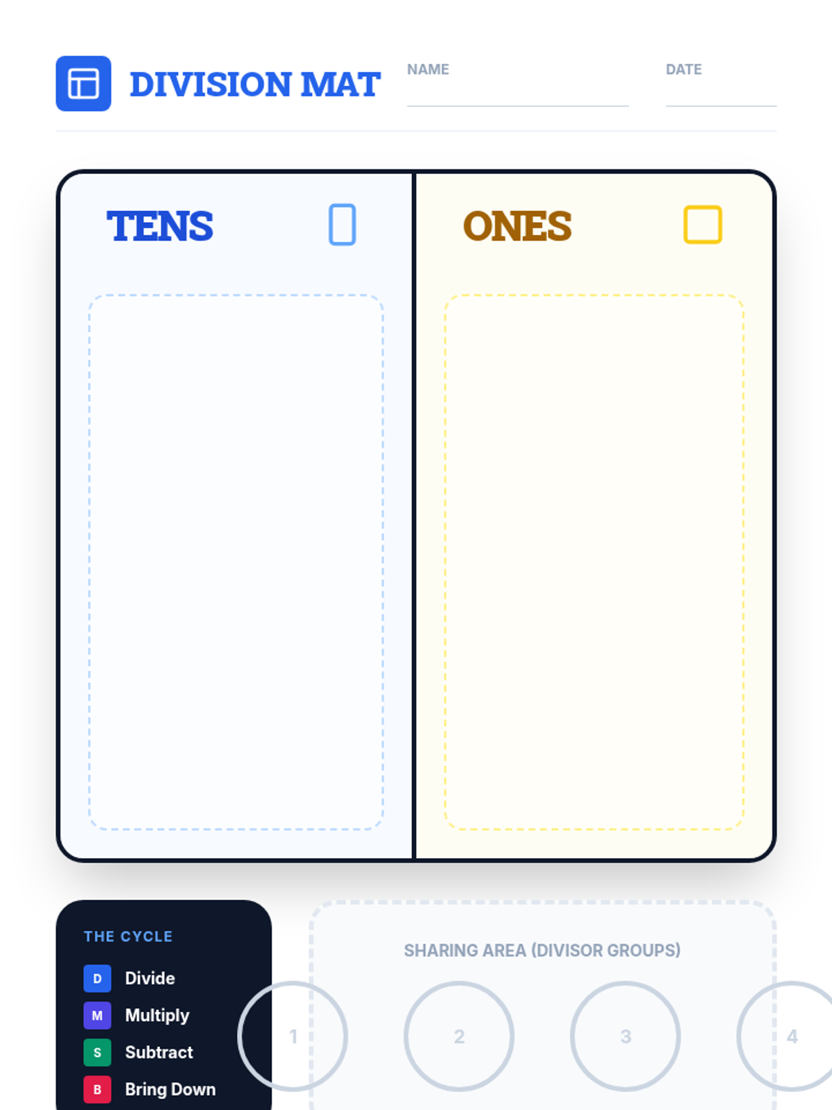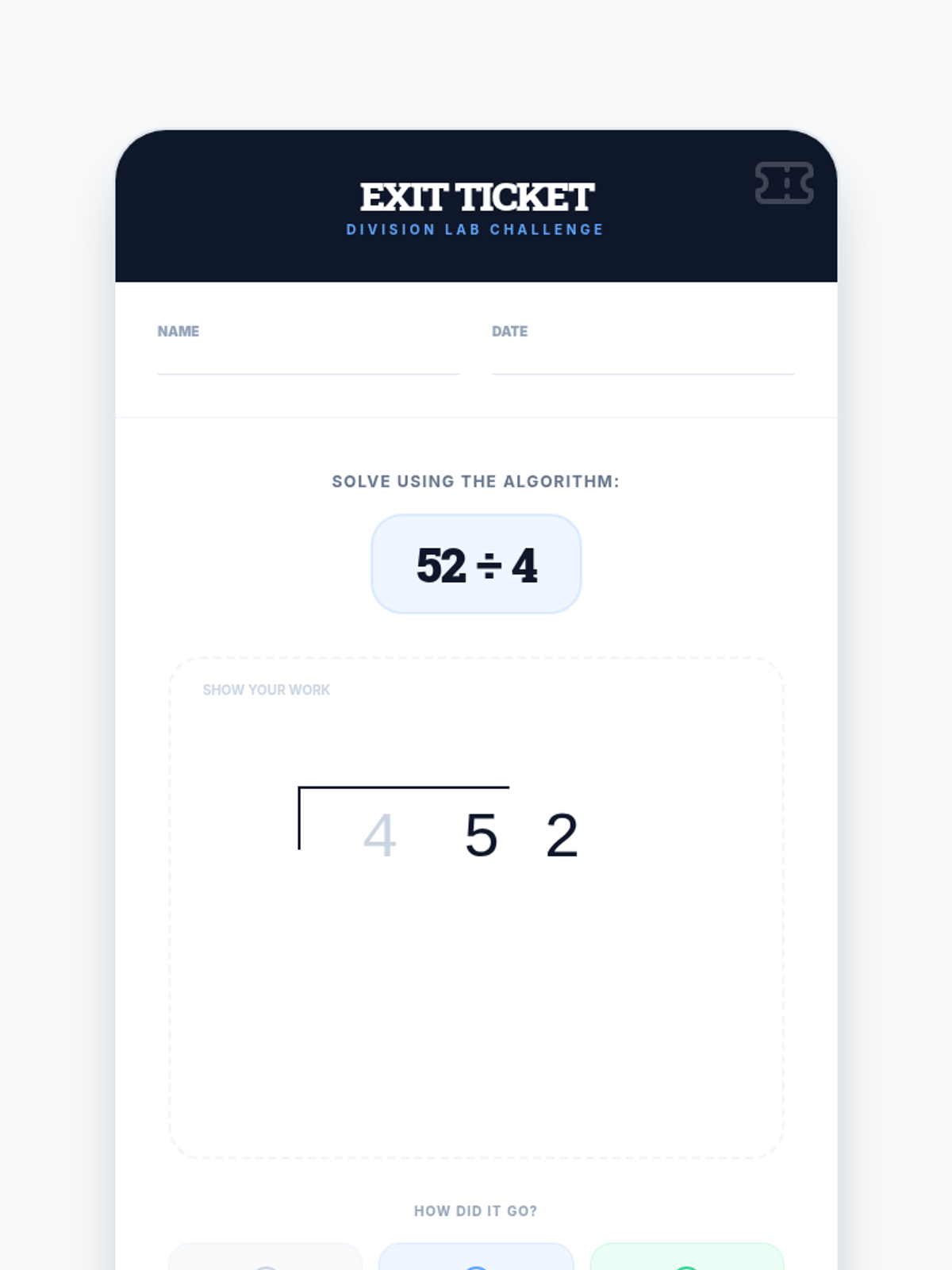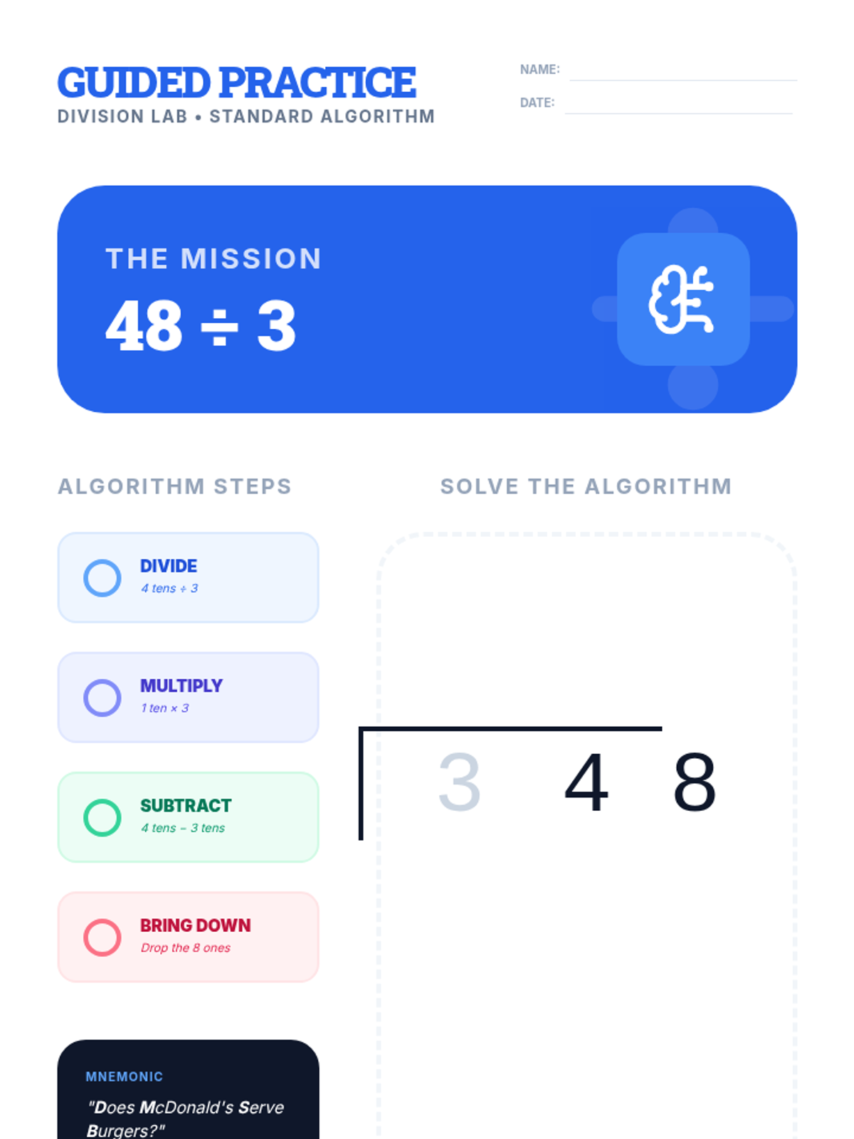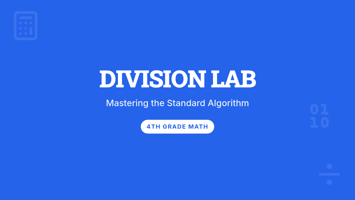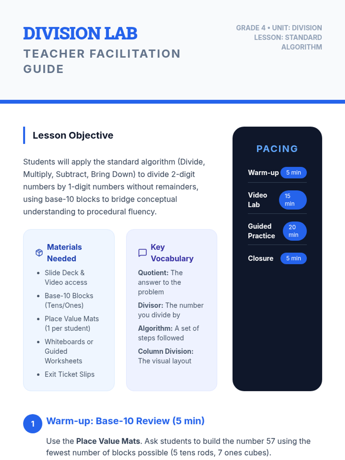 Students learn to divide 2-digit numbers by 1-digit numbers using the standard algorithm, supported by base-10 block manipulation and a step-by-step video guide.