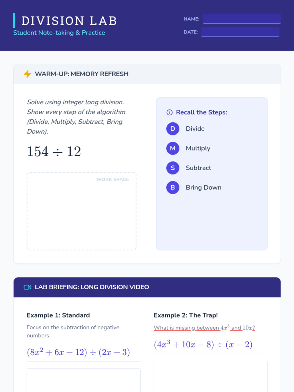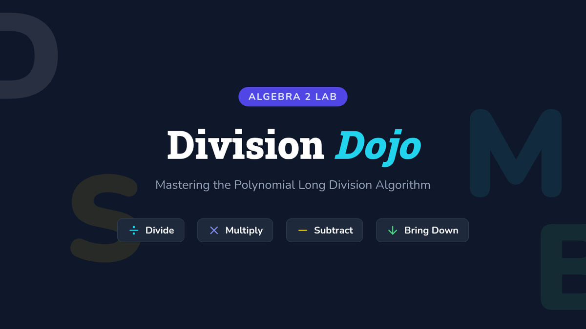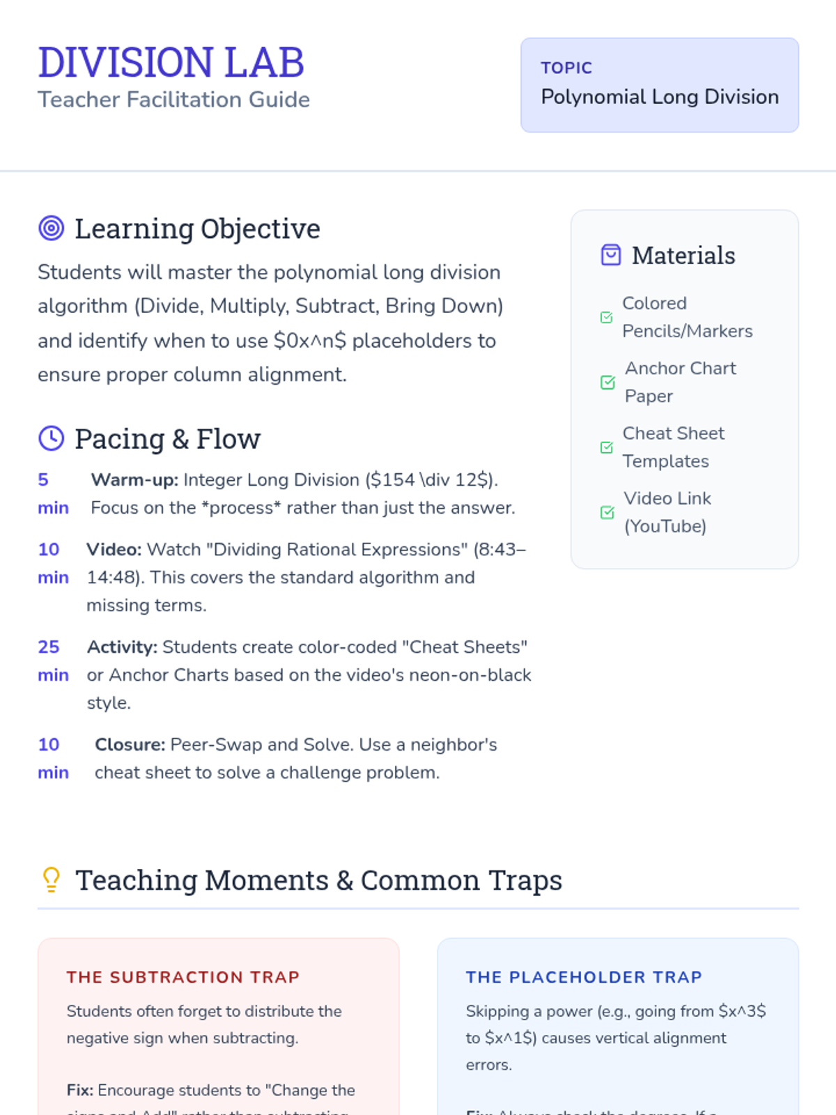 A remediation-focused lesson for Algebra 2 students to master polynomial long division using the 'Divide, Multiply, Subtract, Bring Down' algorithm. The lesson features a video-guided walkthrough and a creative activity where students build their own 'Cheat Sheet' to avoid common pitfalls like missing placeholders and sign errors.