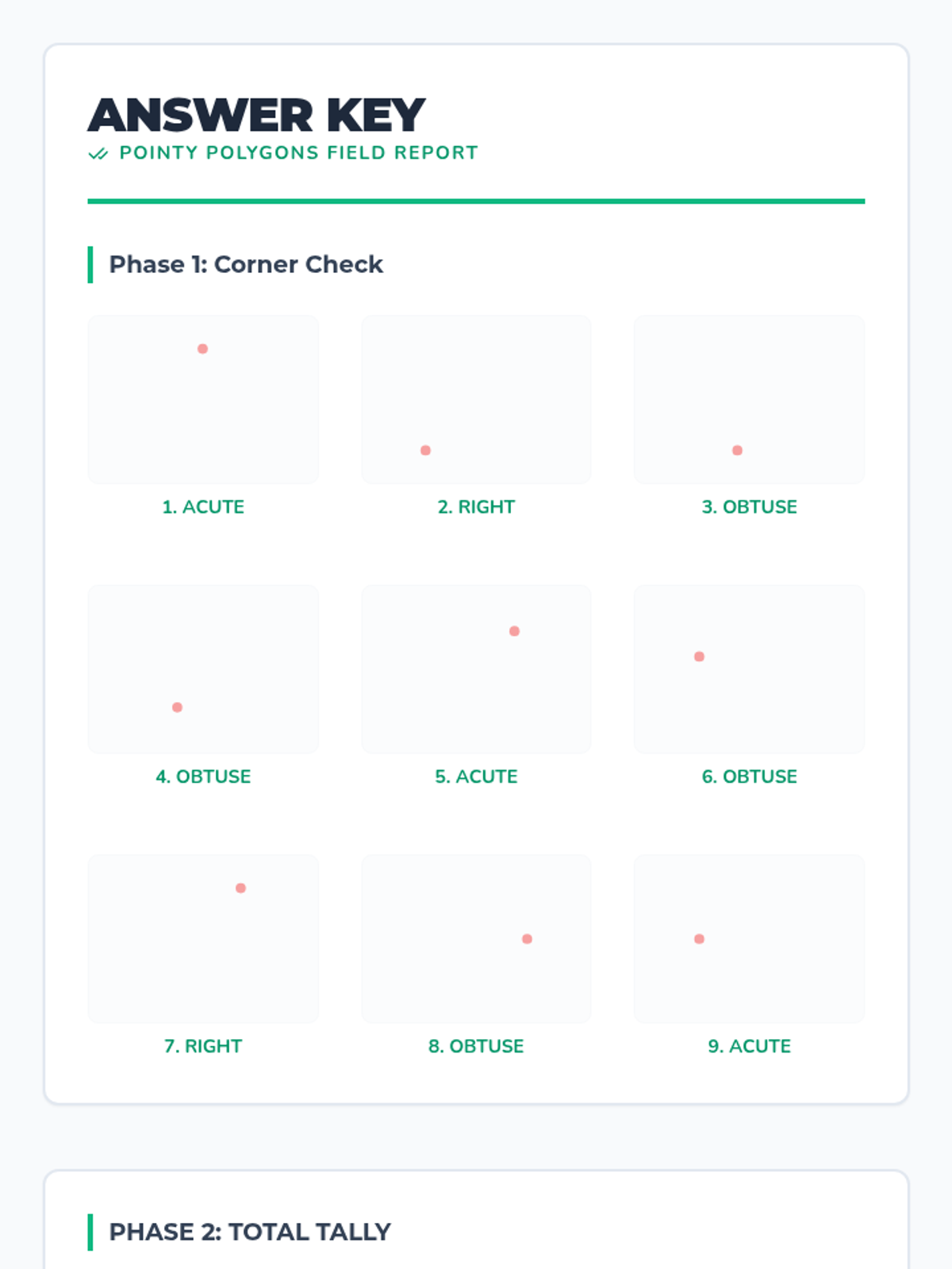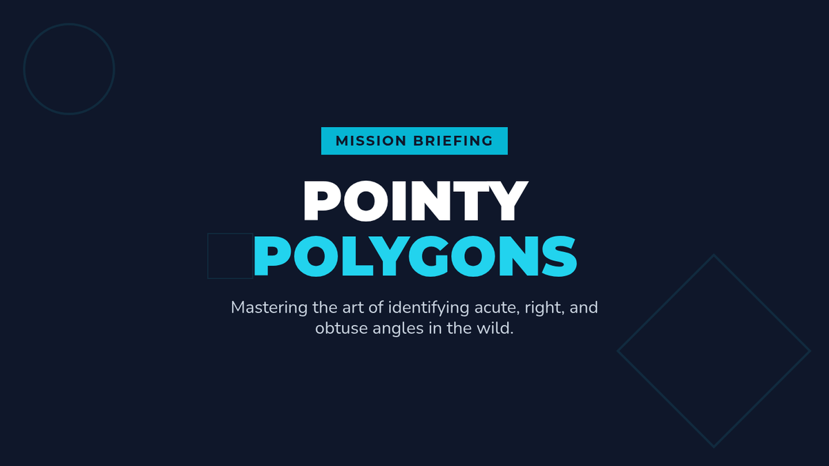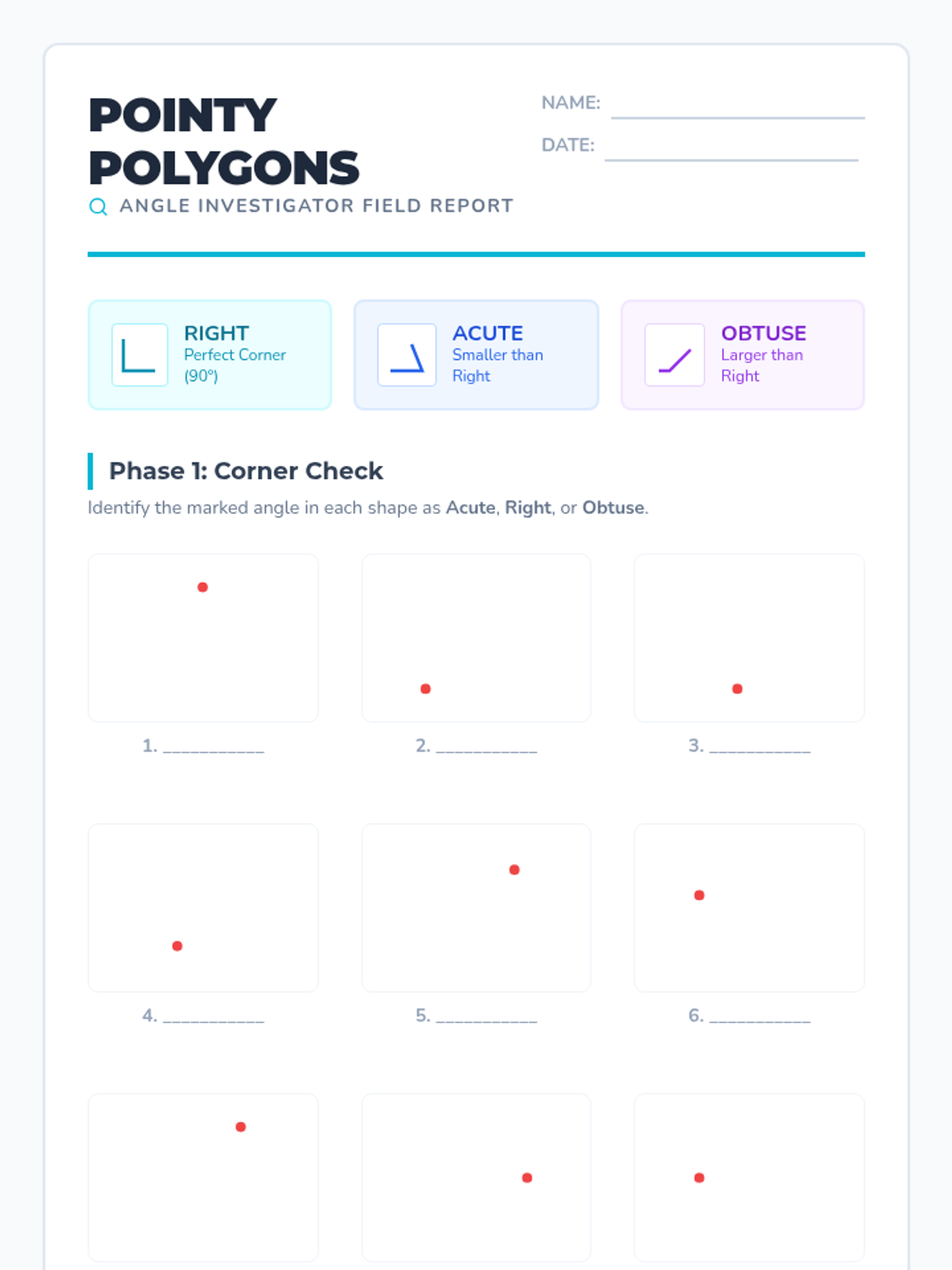 A comprehensive lesson on identifying and classifying acute, right, and obtuse angles within various geometric shapes through visual inspection and detective-themed practice.