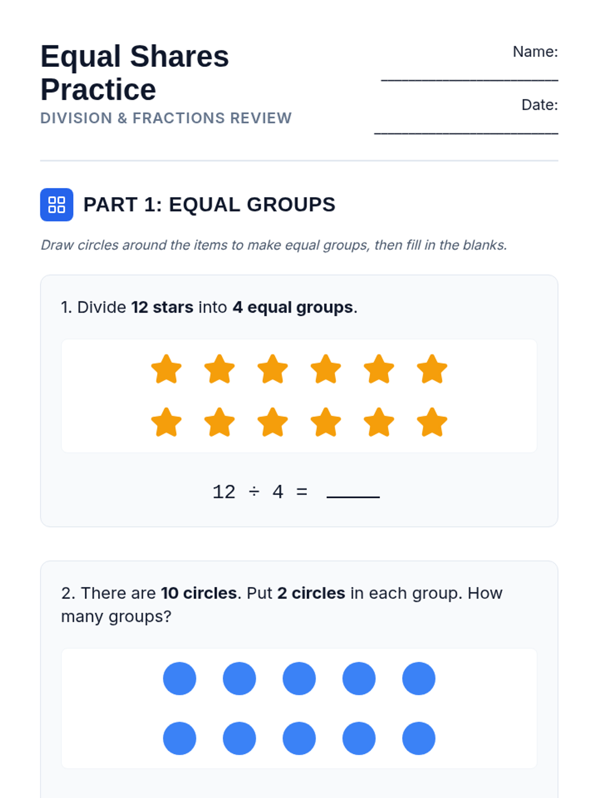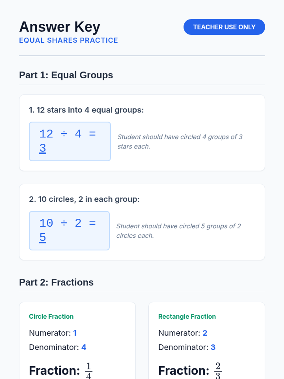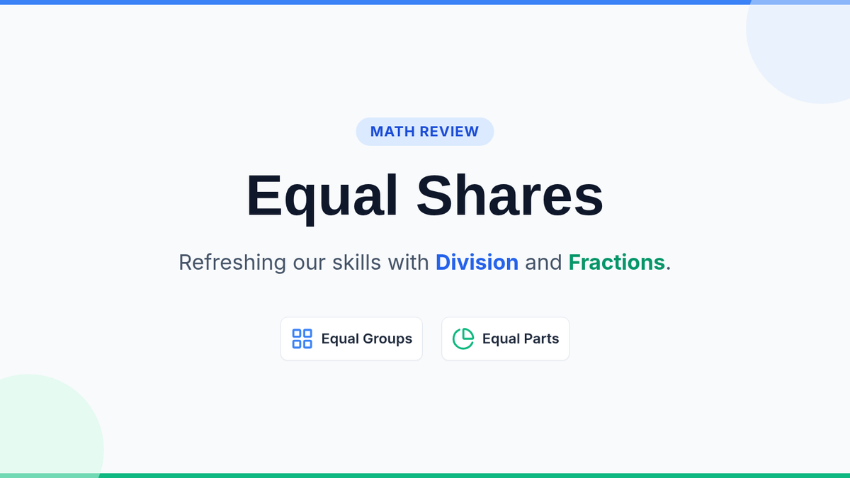 A concise review lesson connecting the concepts of division as equal groups and fractions as equal parts of a whole, including numerator and denominator definitions.