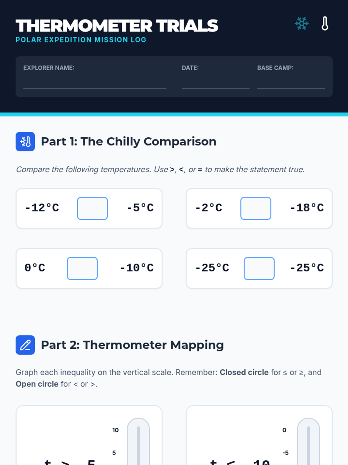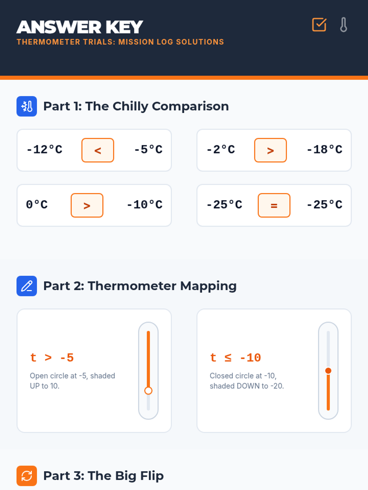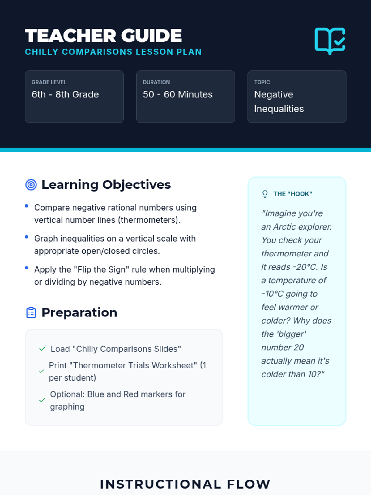 A lesson on understanding and graphing inequalities with negative numbers using the real-world context of temperature and thermometers. Students will master the 'flip the sign' rule when multiplying or dividing by negatives.