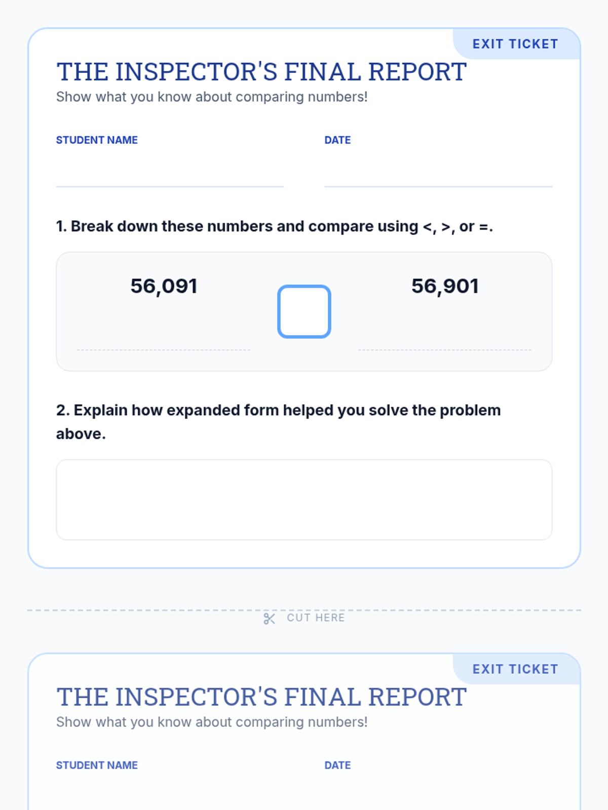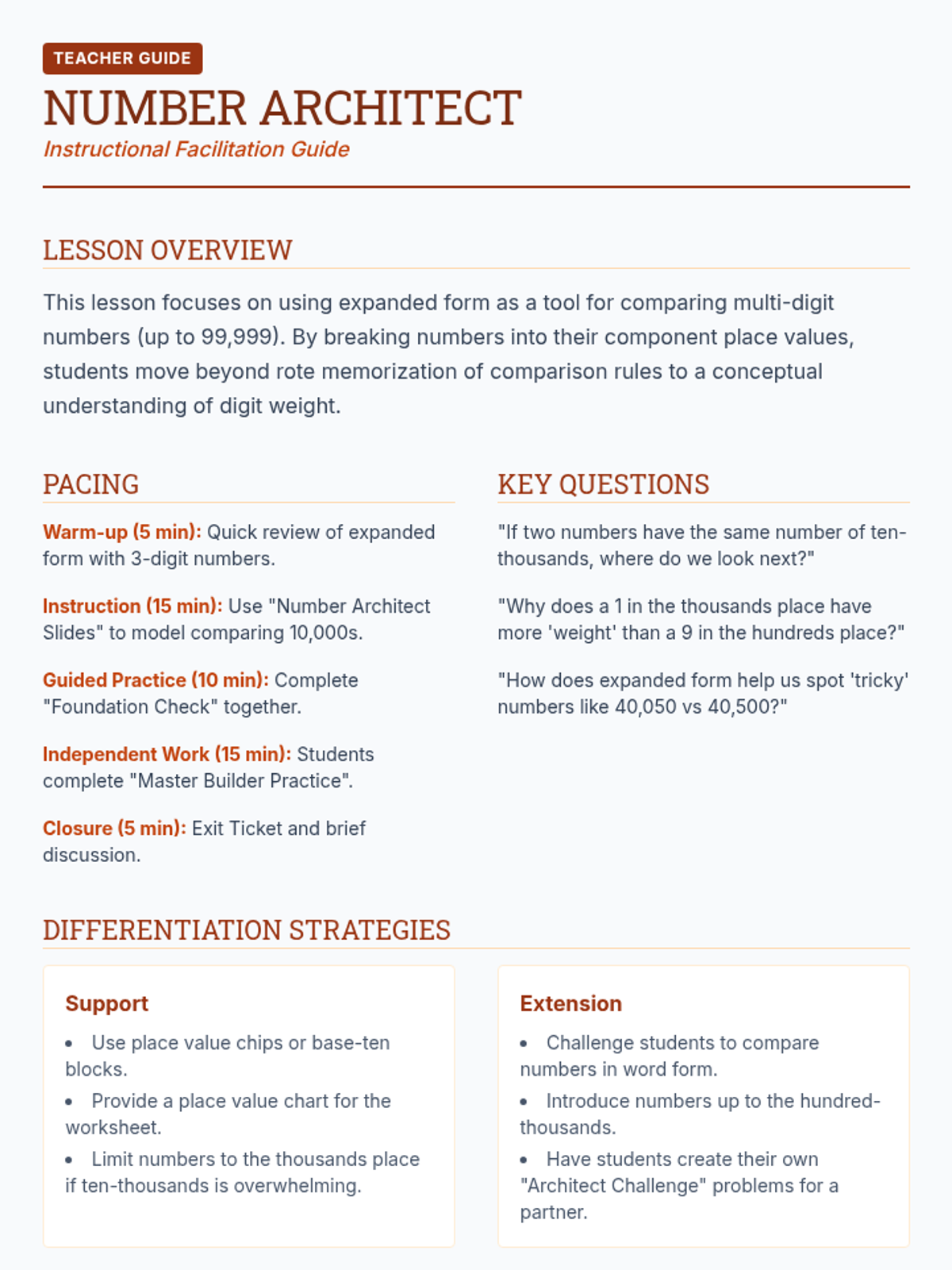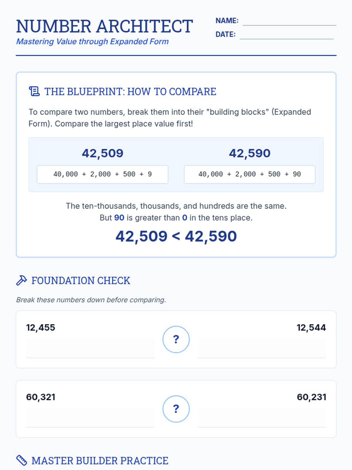 Students learn to compare multi-digit numbers up to the ten-thousands place by decomposing them into expanded form to analyze the value of each digit.