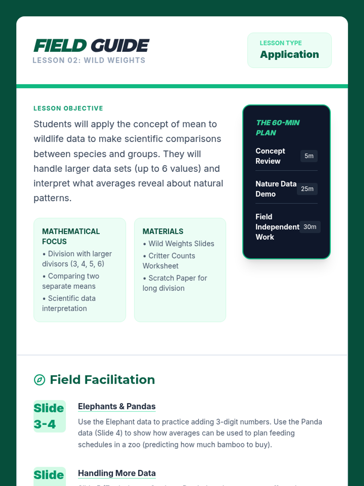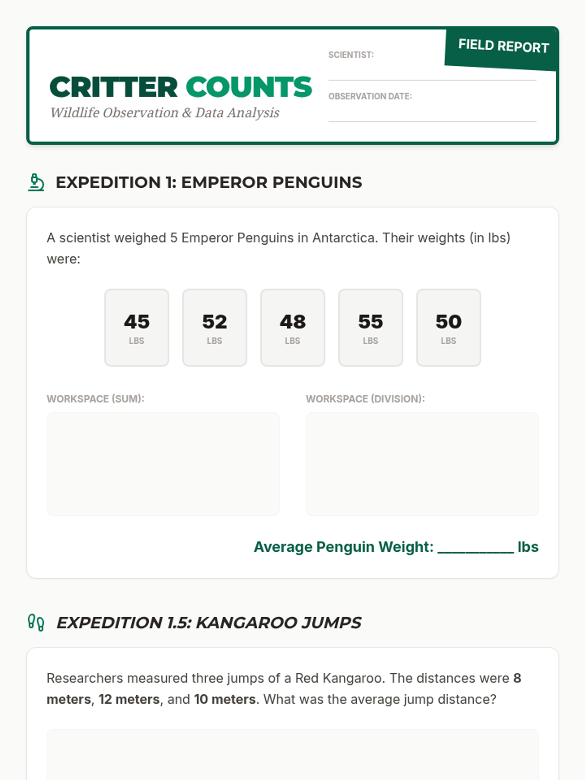 Applying the mean to animal data sets, exploring how averages help scientists understand the natural world.