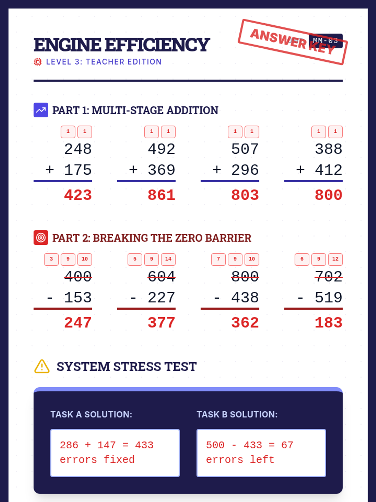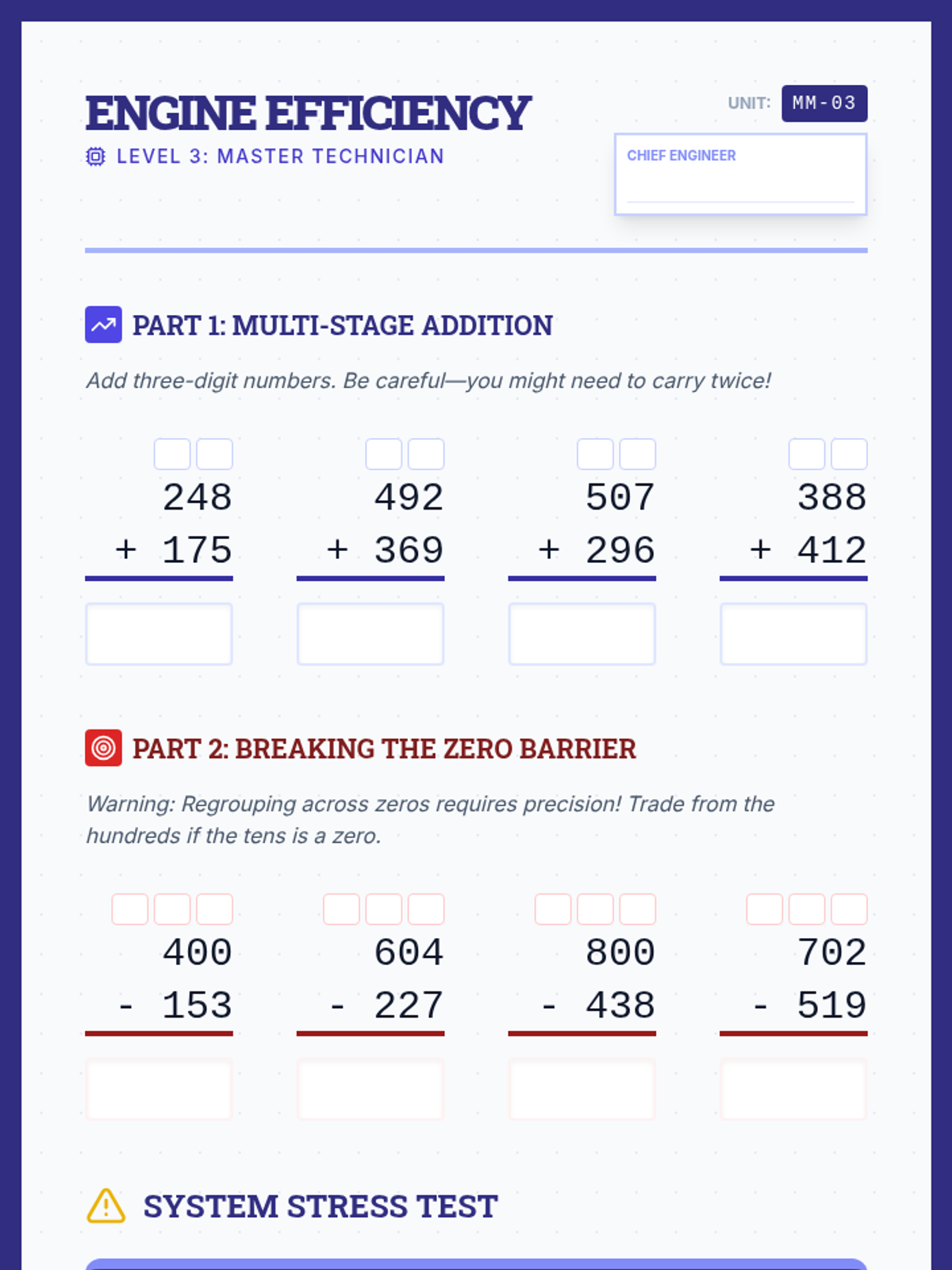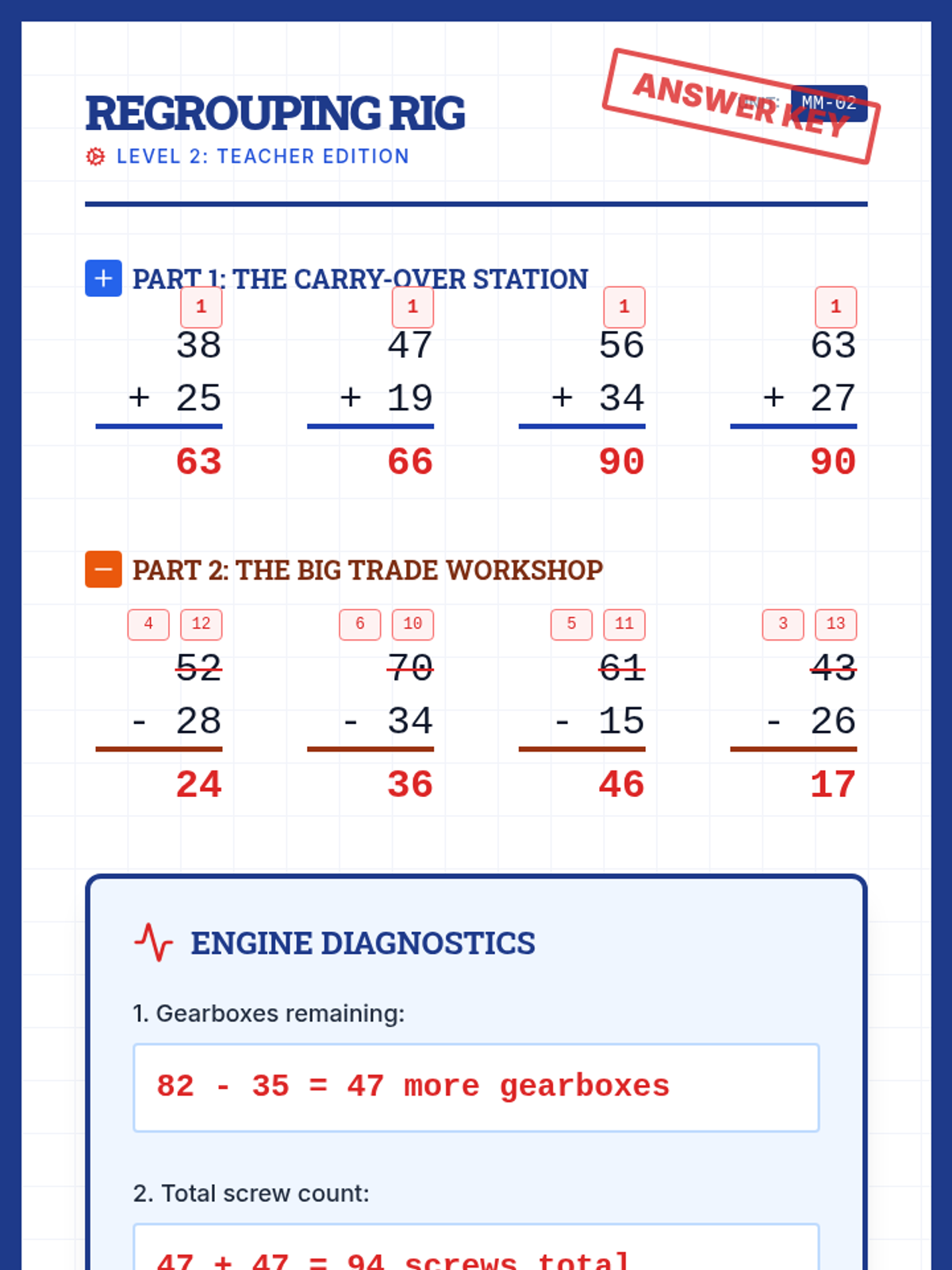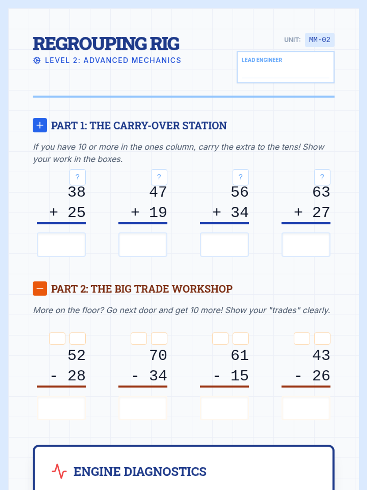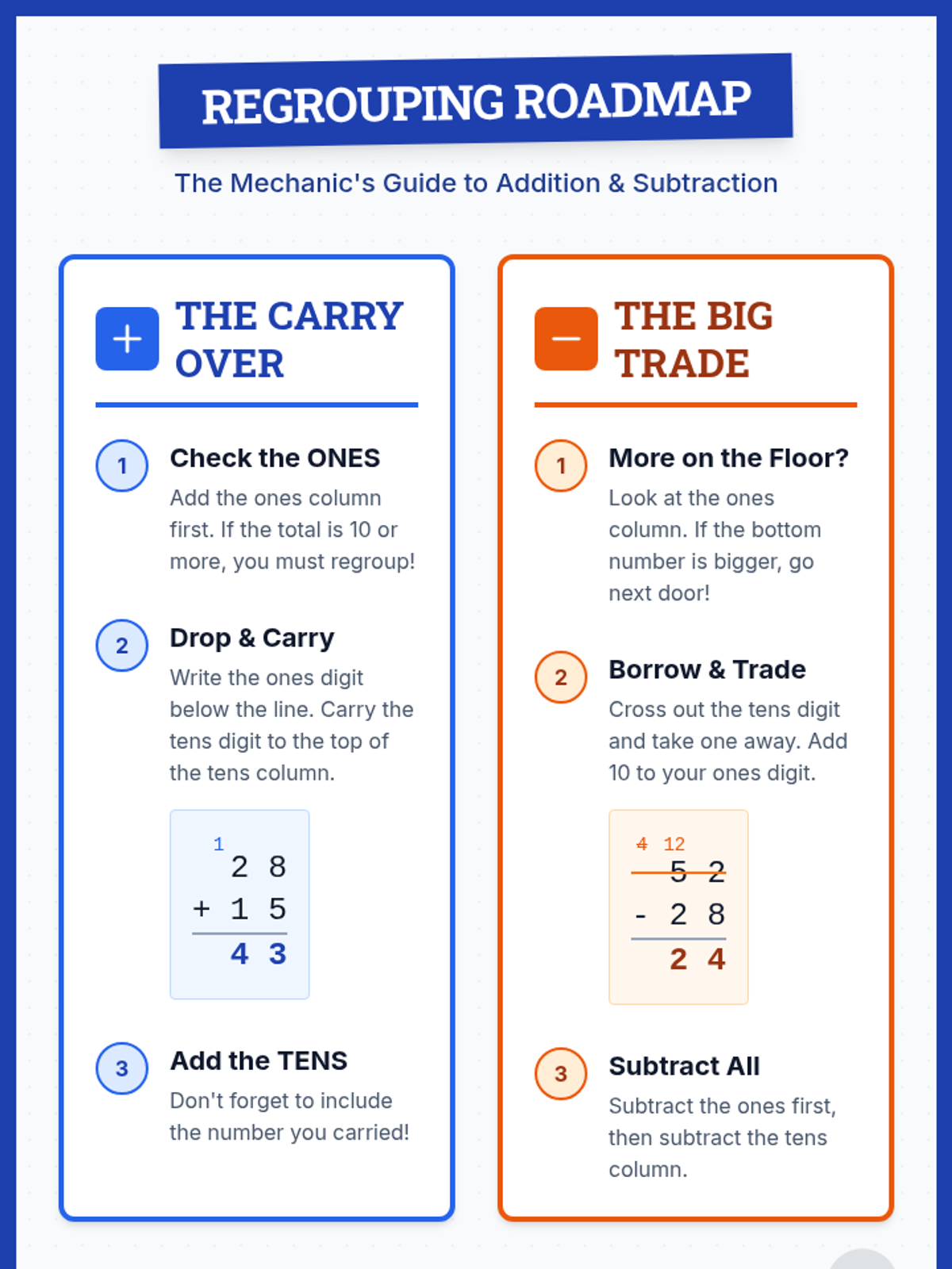Students will review basic addition and subtraction facts and learn the step-by-step procedures for regrouping in multi-digit problems.