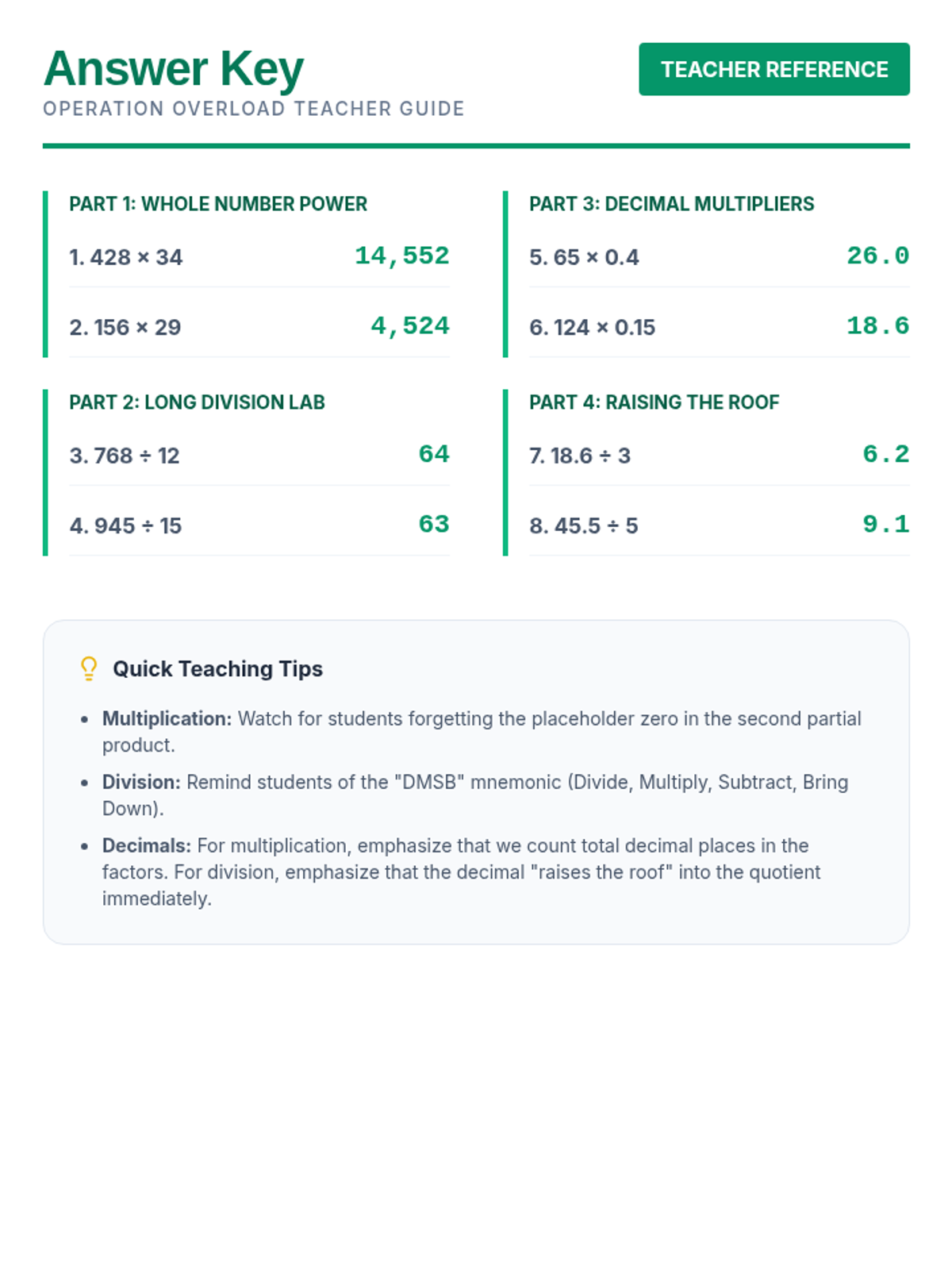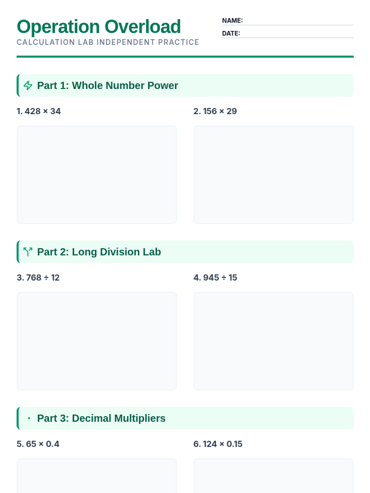 A high-energy 30-minute review of multiplication and division operations involving whole numbers and decimals, designed for 5th-grade mastery.