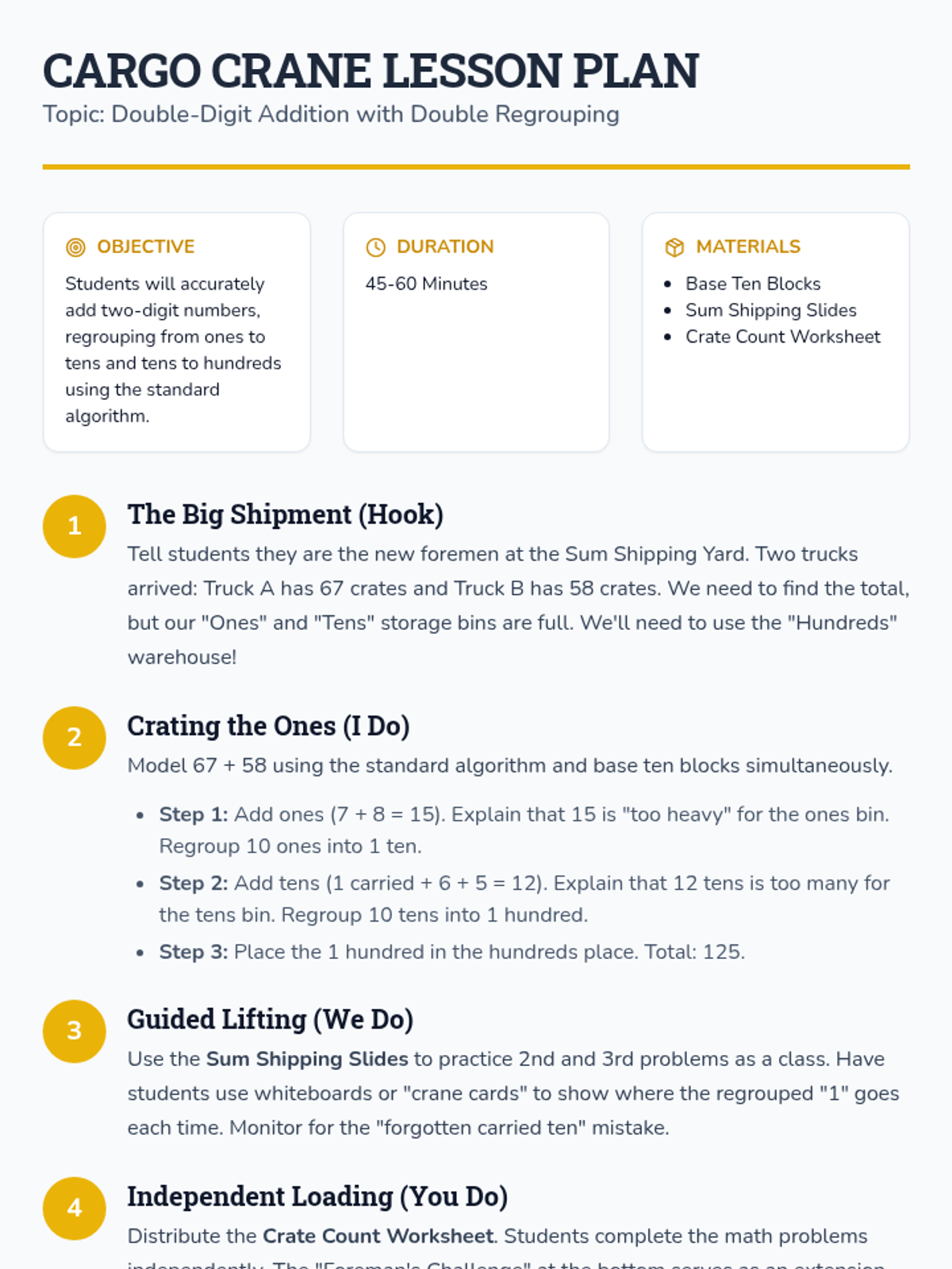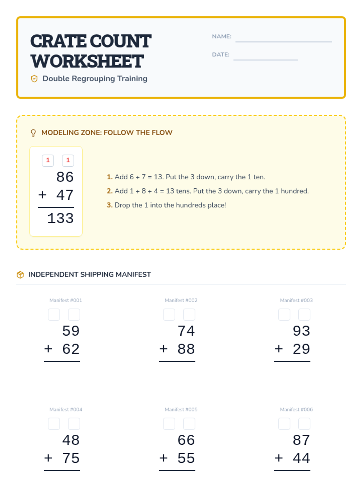 A focused lesson on adding two-digit numbers where regrouping occurs from the ones place to the tens place and from the tens place to the hundreds place.