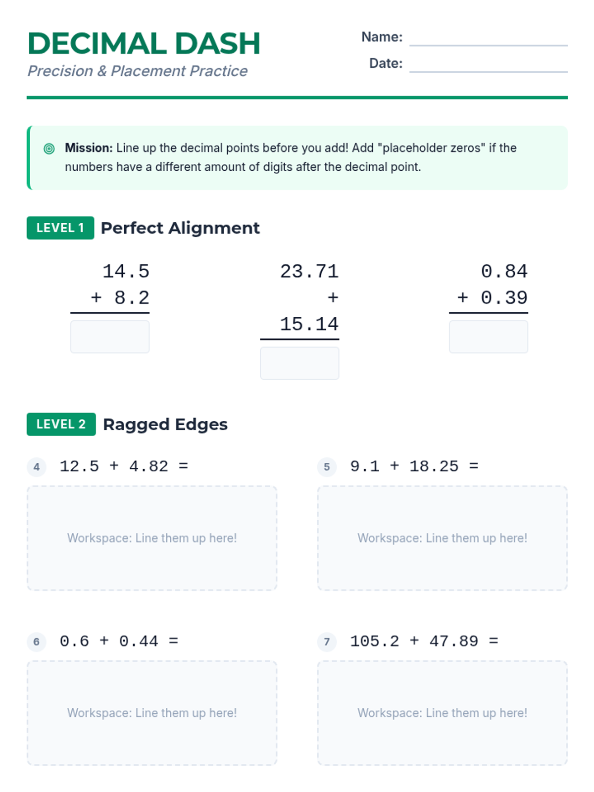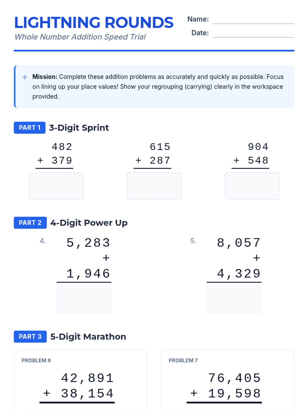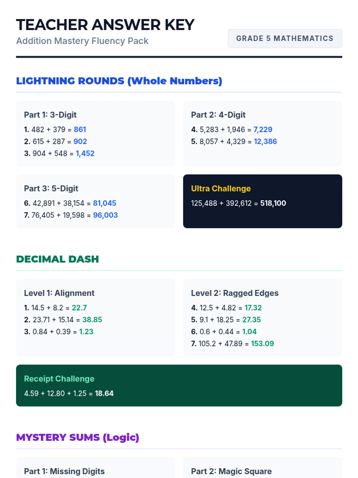 A comprehensive addition fluency pack for 5th graders, focusing on multi-digit whole numbers, decimals, and logical addition puzzles to build speed and accuracy.